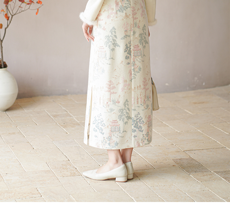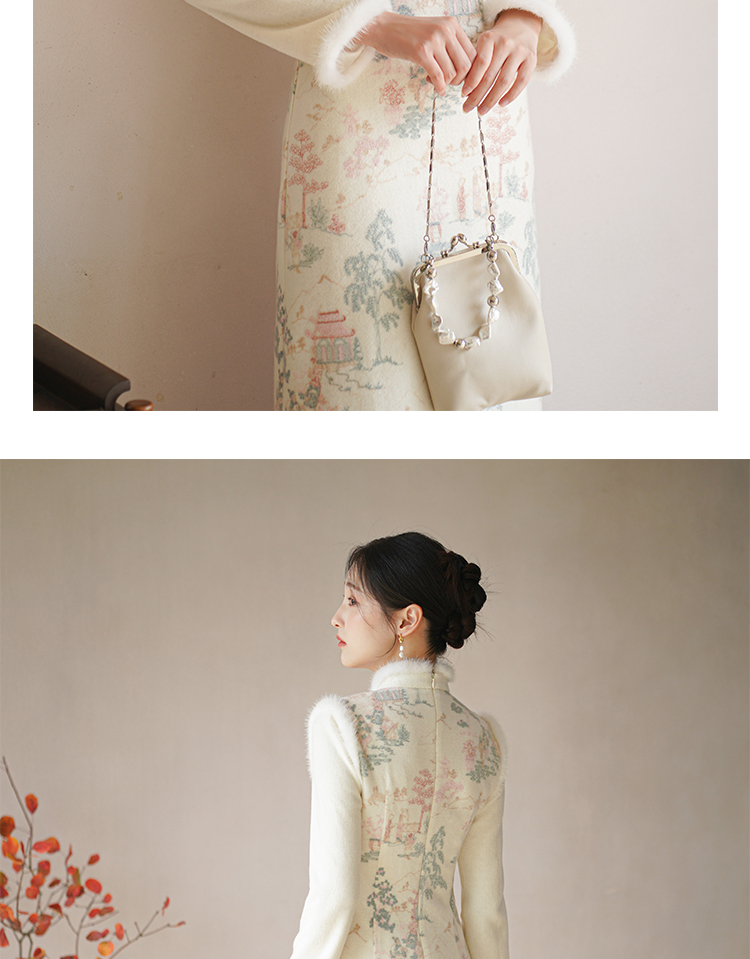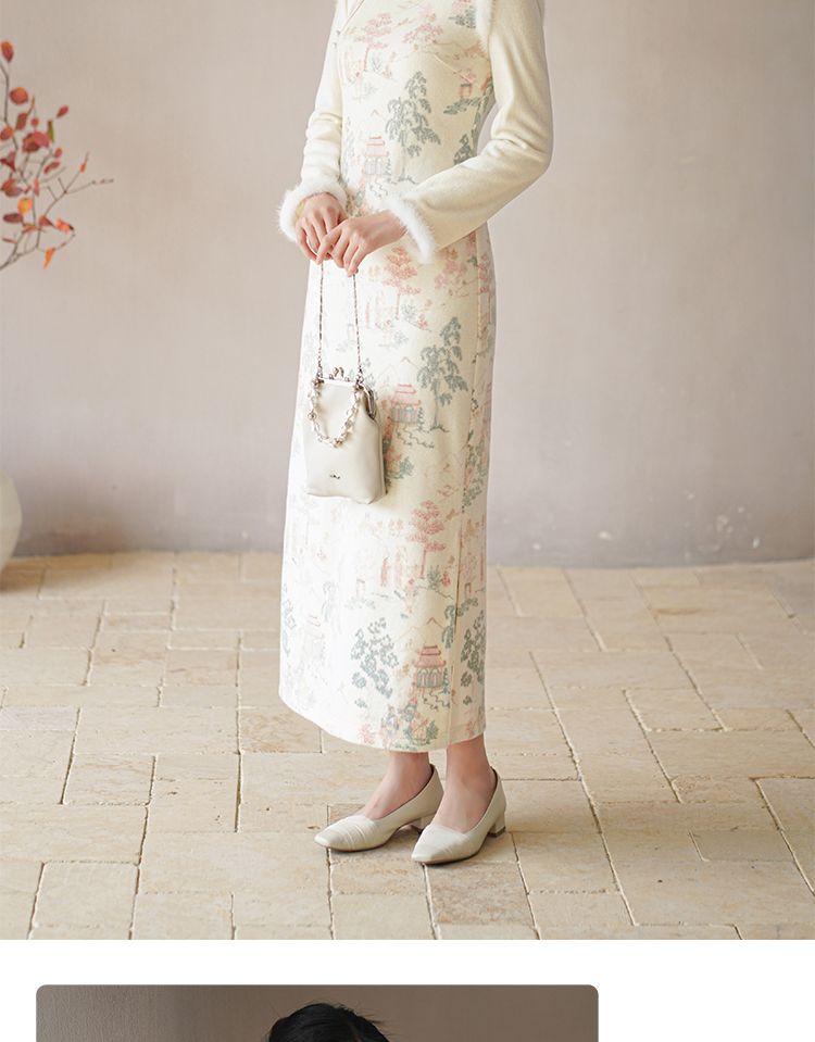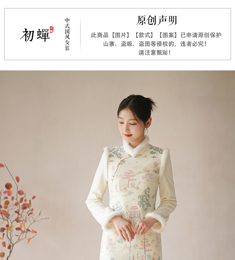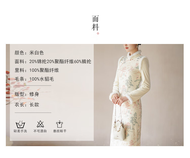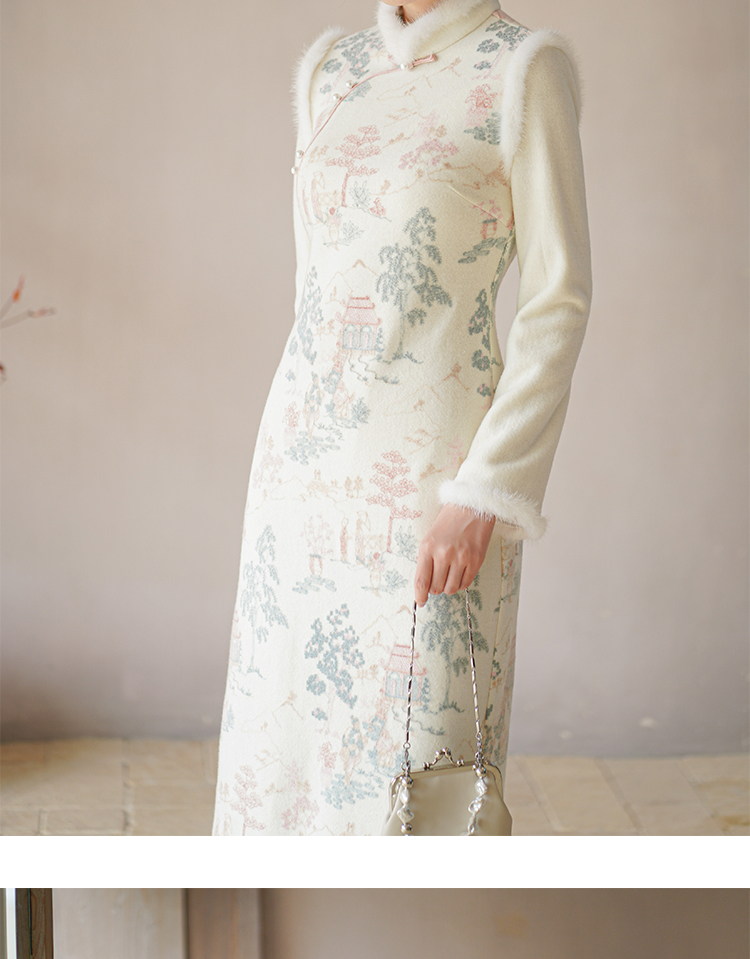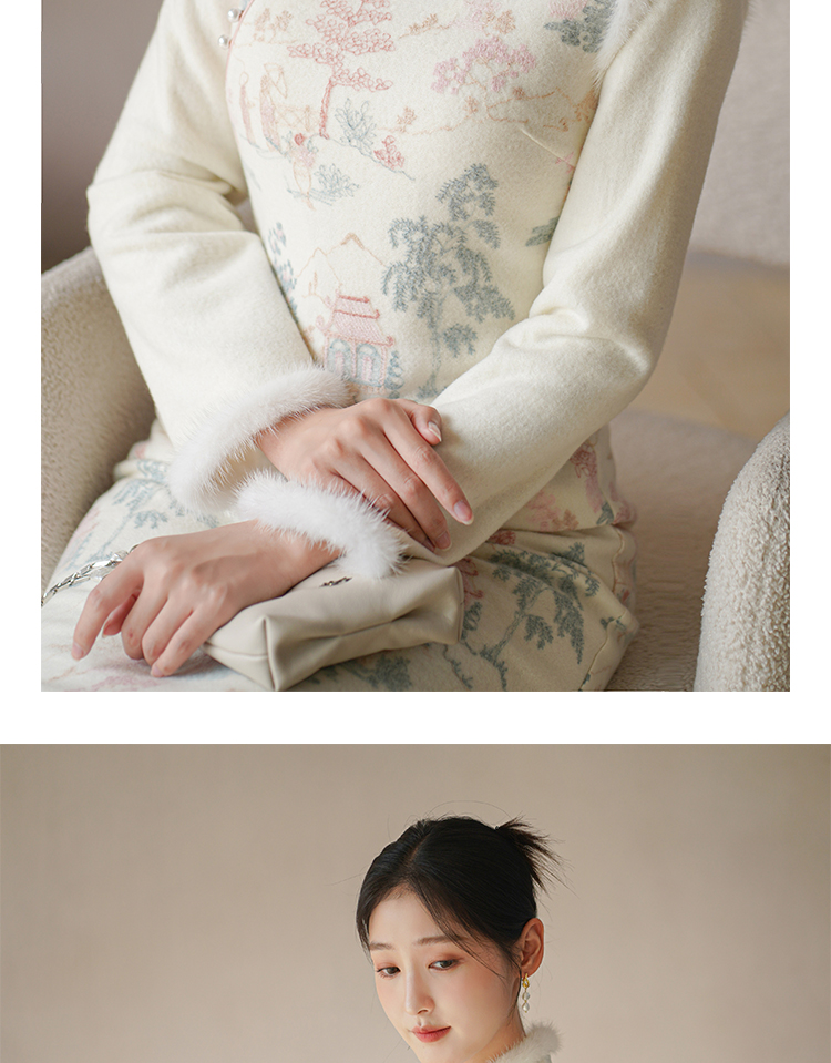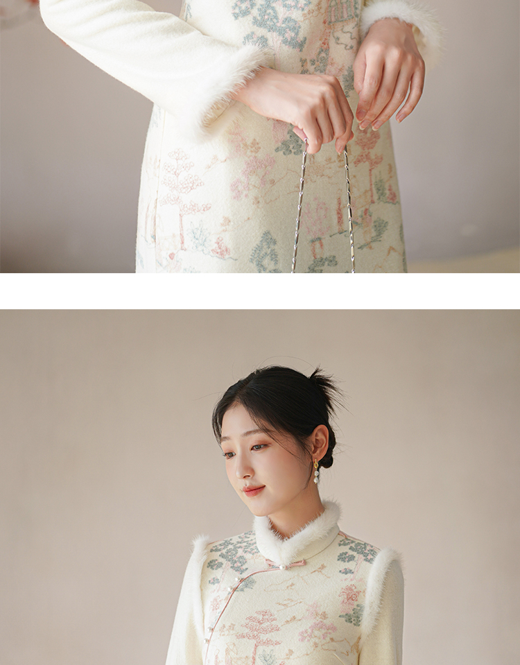 Chuchan Clothing New Chinese Dress Women's Autumn and Winter New Waist Embroidered Mink Fur Gentle Chinese Style Improved Cheongsam Off-White L (Ready Stock)