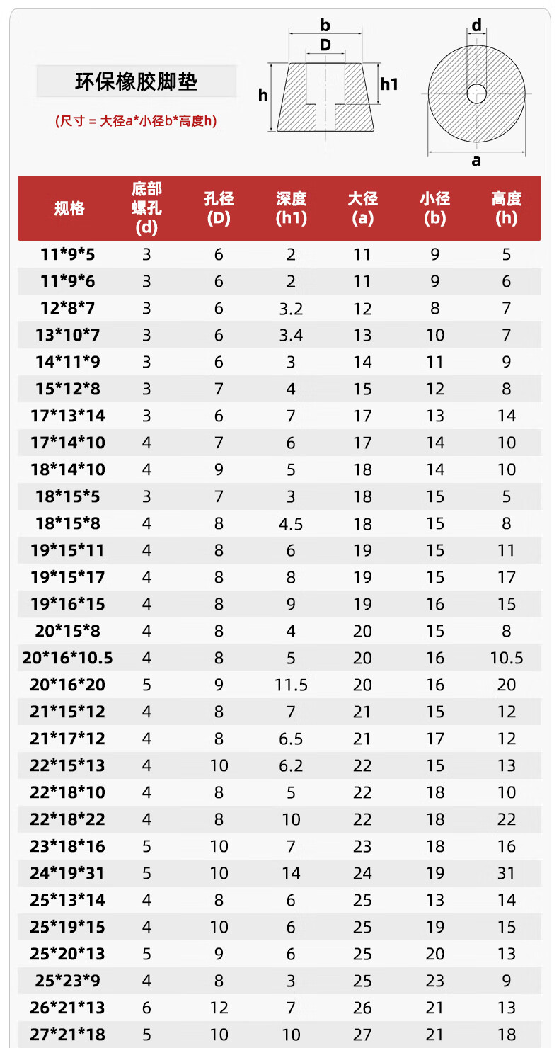 Fengji environmentally friendly rubber feet, shock-absorbing pads, high round pads, plastic feet, rubber tapered feet, table and chair speaker feet, large diameter 40* small diameter 28* high 40 (2 pieces)