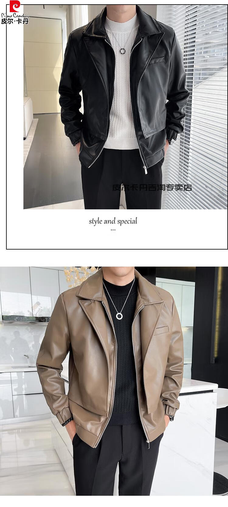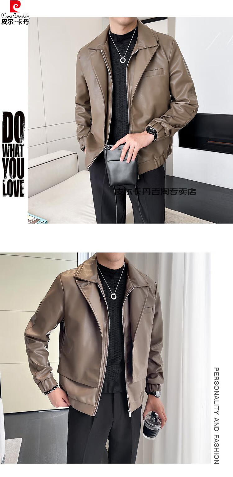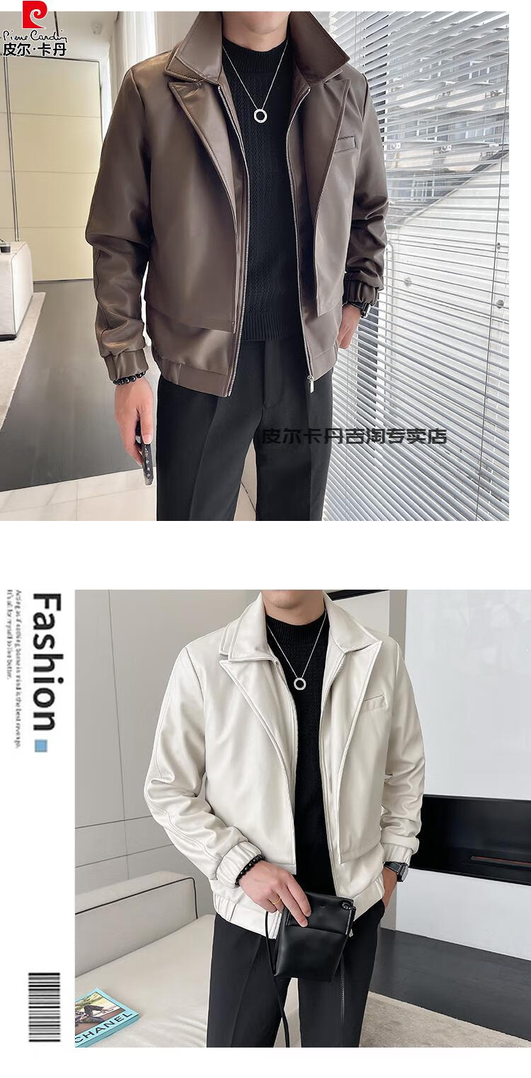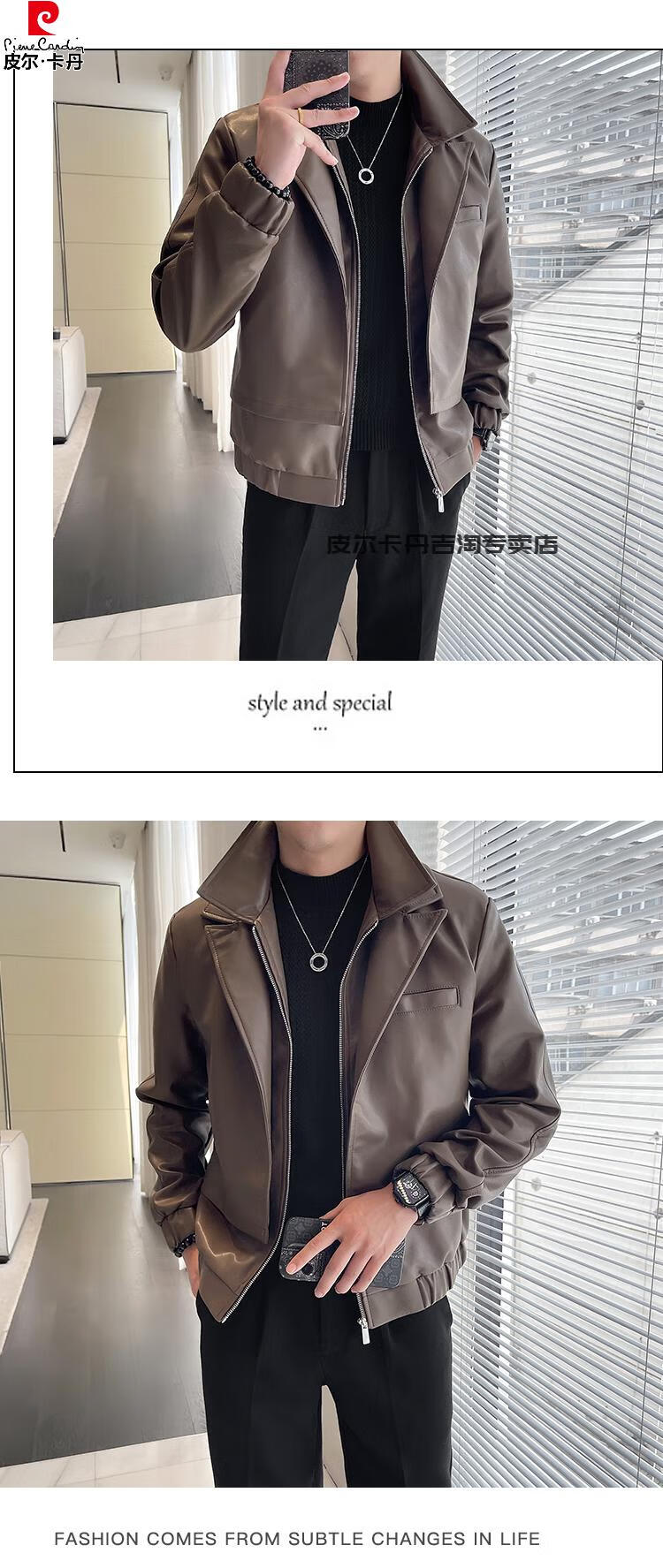 Pierre Cardin high-end fake two-piece double-collar leather jacket men's trendy brand spring and autumn 2024 retro motorcycle leather jacket brown M recommended 120Jin Jin is equal to 0.5 kg or less