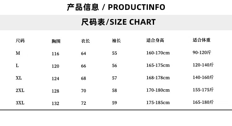 China (cm) 165 / 88-90 170 / 96-98 175 / 108-110 180 / 118-122 185 / 126-130