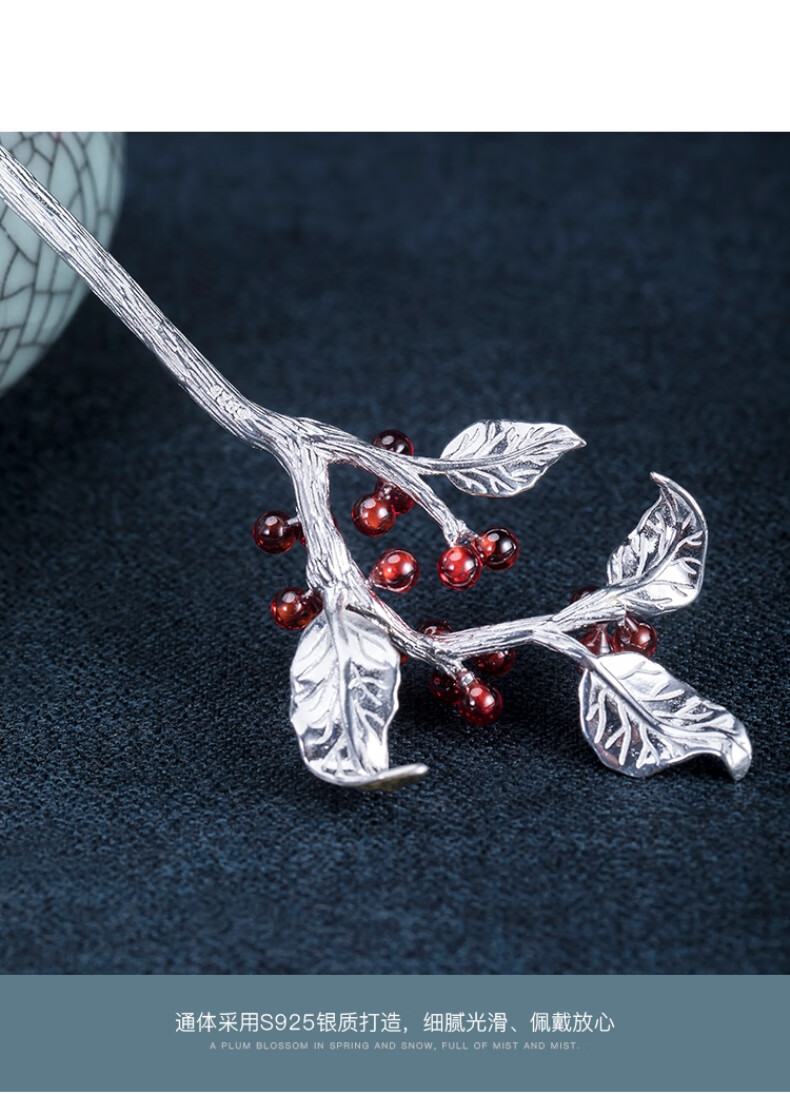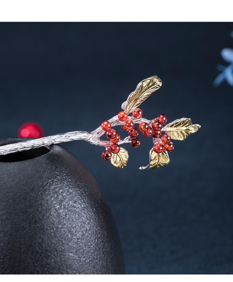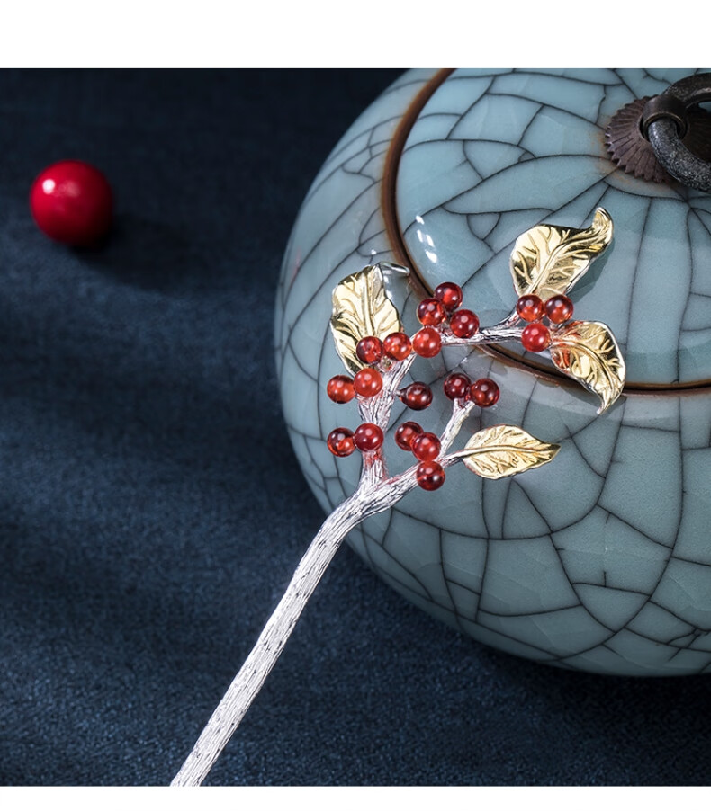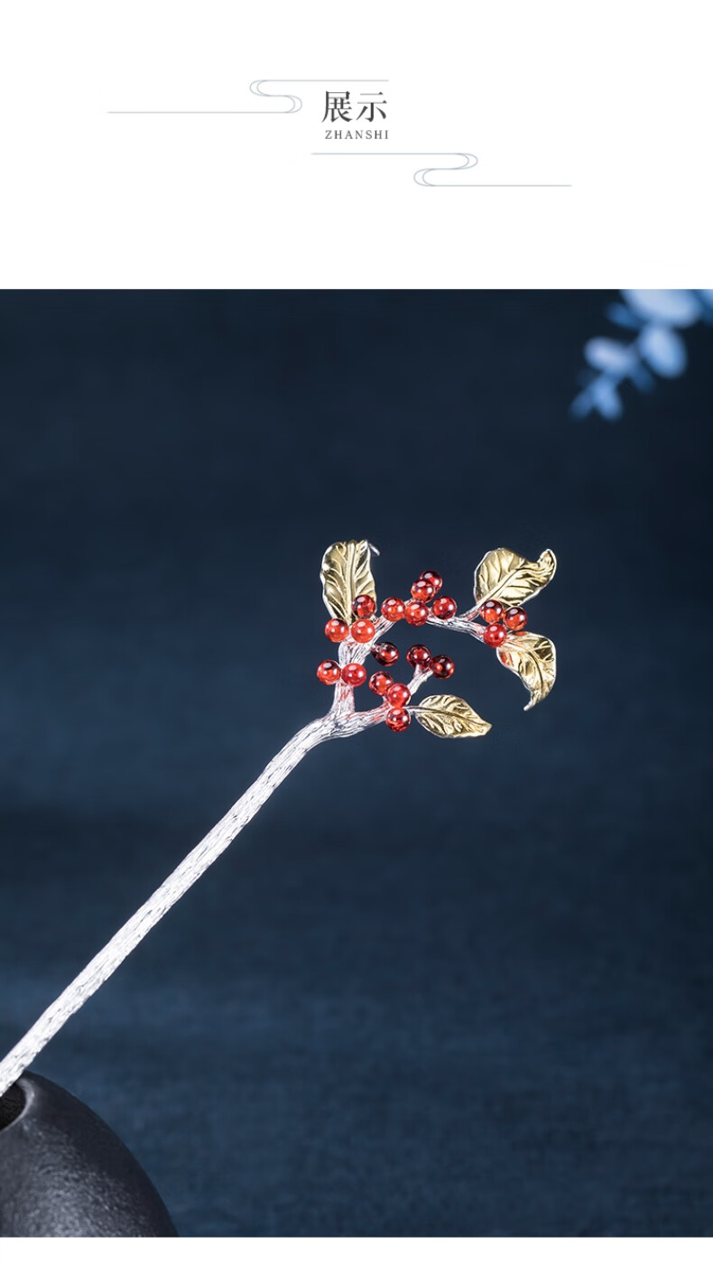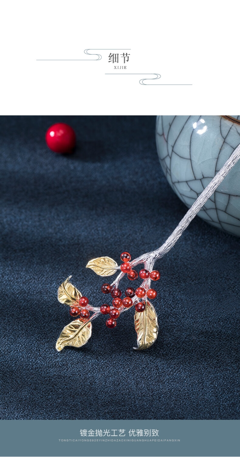 Shaofan E.YL light luxury sterling silver hairpin, ancient style Hanfu cheongsam, new Chinese style hairpin for girlfriend, high-end gift red red bean branch and leaf hairpin