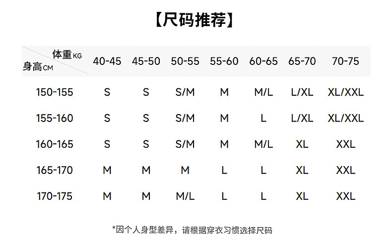 China (cm) 160-165/84-86 165-170 / 88-90 167-172 / 92-96 168-173 / 98-102 170-176 / 106-110