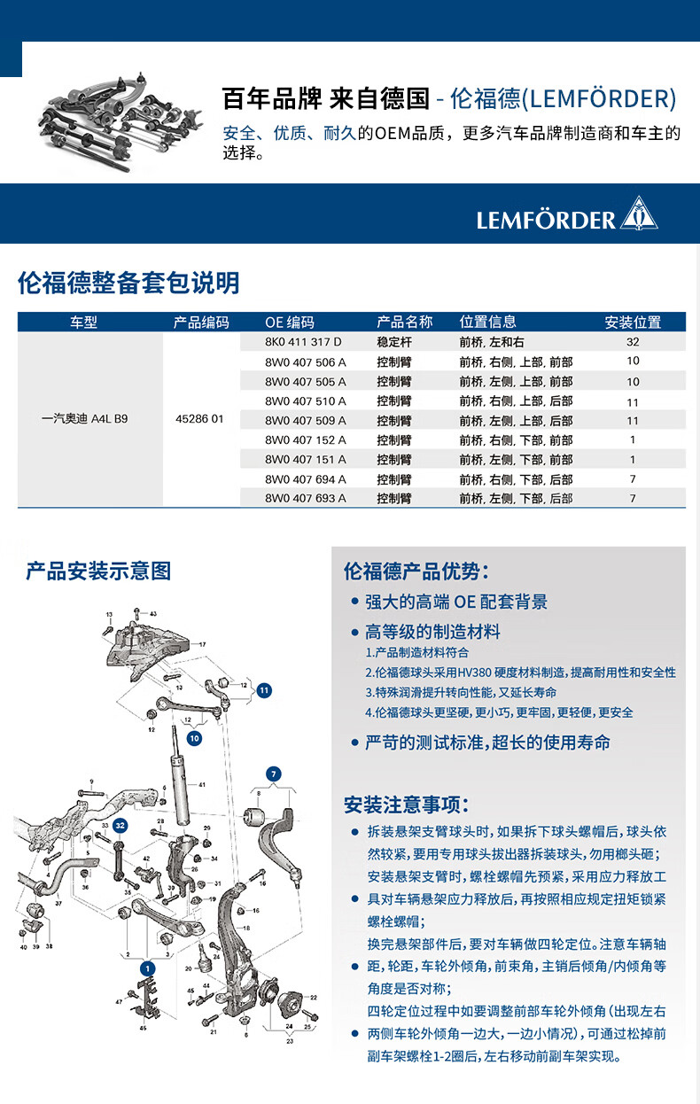 LEMFORDER/Lenford Chassis Repair Kit Swing Arm/Tie Rod/Bush Audi A4L/A5/Q5(B8)