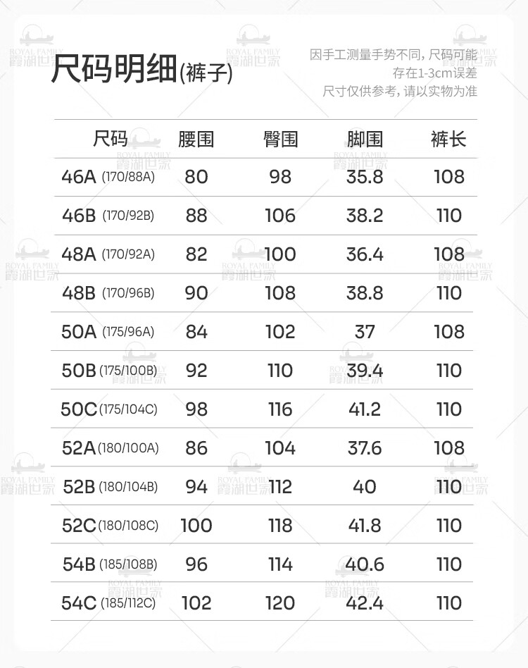 Outseam (cm) 99 cm 101.5 cm 104 cm 106.5 cm 109 cm