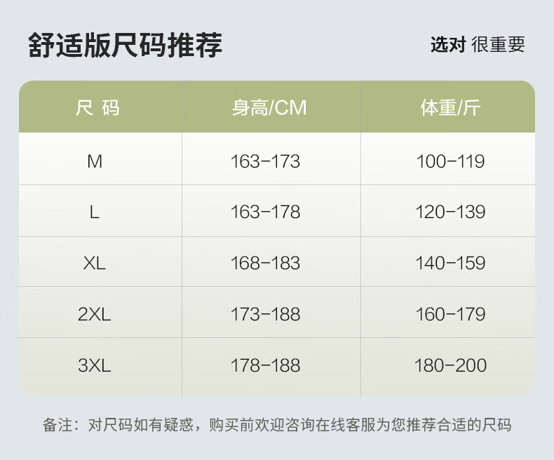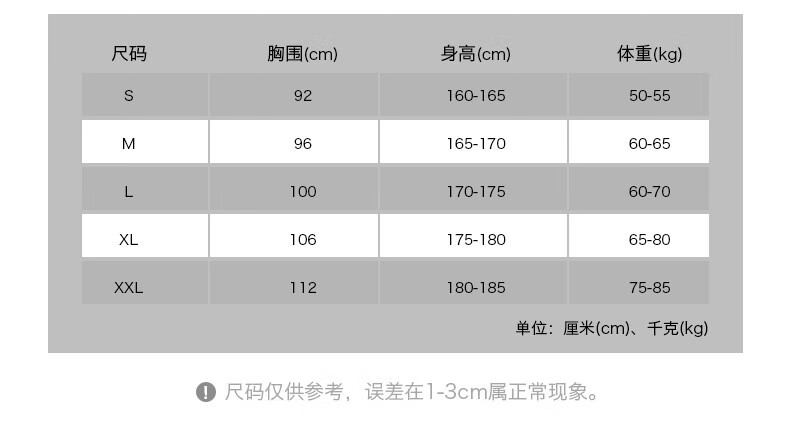 China (cm) 165 / 88-90 170 / 96-98 175 / 108-110 180 / 118-122 185 / 126-130