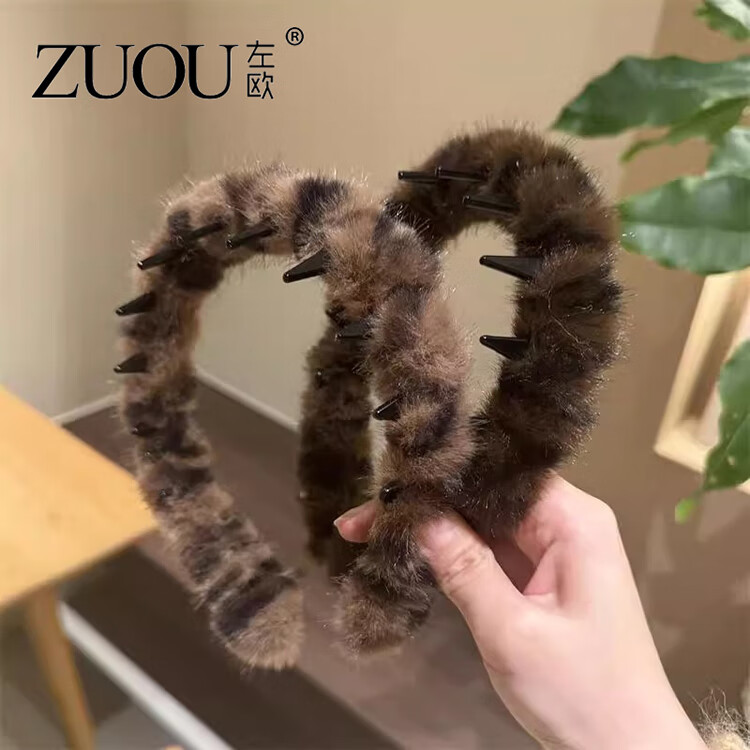 Zuoou plush hairband with toothed anti-slip hairpin for women, winter furry leopard print headband, furry hair hole headband for women, dark brown leopard print plush wavy