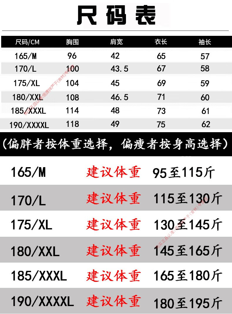 China (cm) 165 / 88-90 170 / 96-98 175 / 108-110 180 / 118-122 185 / 126-130