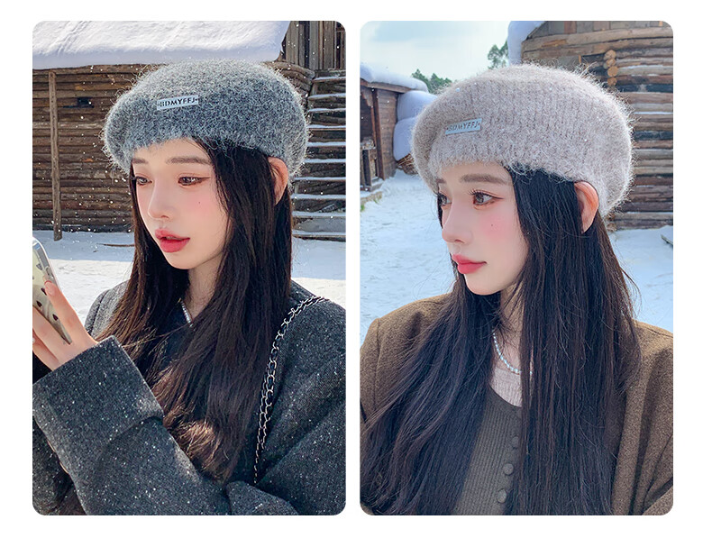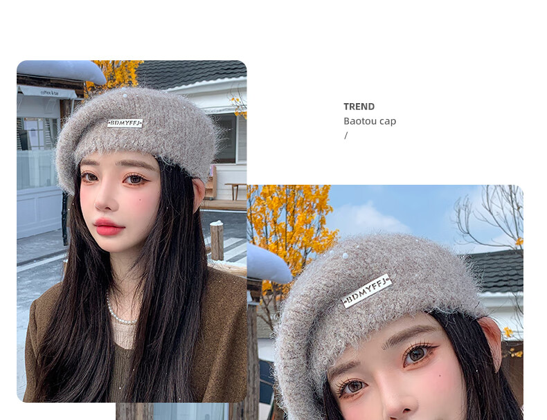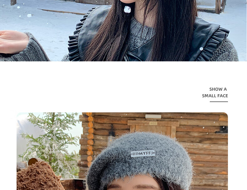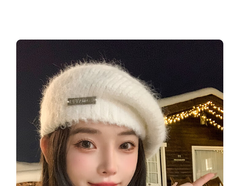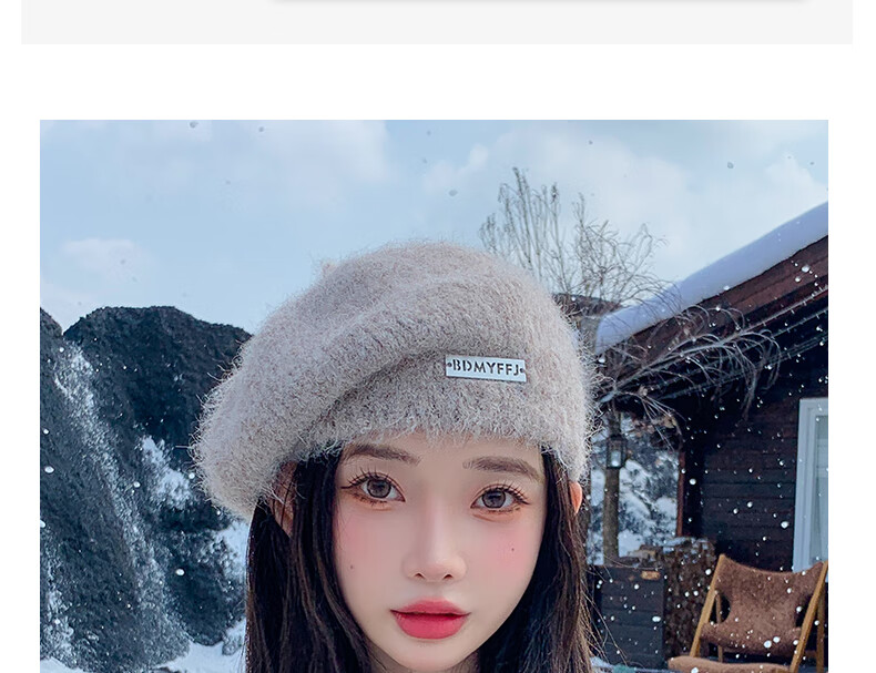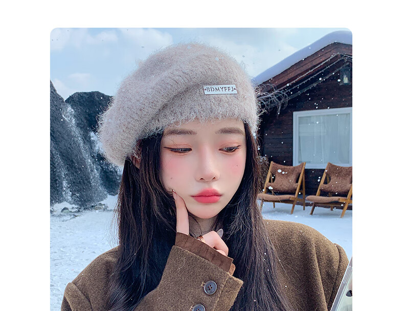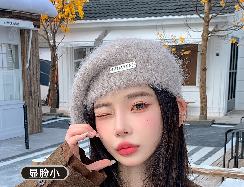 Xingmei Lanfei knitted beret women's autumn and winter plush lazy style painter's hat big head circumference showing face small winter woolen hat camel adjustable