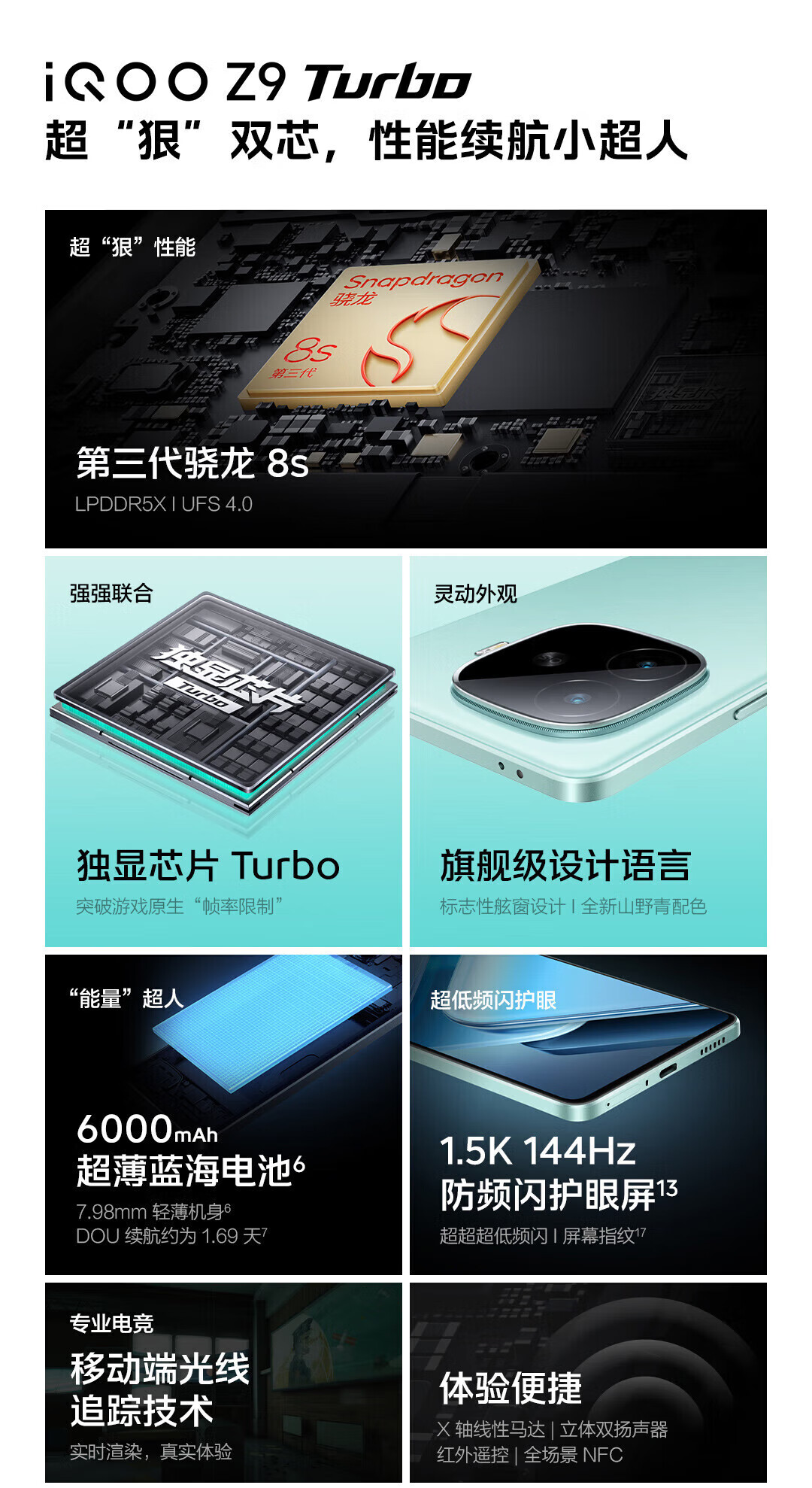 IQOO vivo iQOO Z9 Turbo 3rd generation Snapdragon 8s independent graphics chip Turbo+ 6000mAh blue ocean battery E-sports gaming phone Full Netcom 5G phone Starburst White Z9 Turbo 3rd generation Snapdragon 8S 12GB+256GB