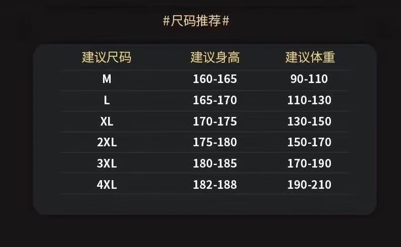 China (cm) 165 / 88-90 170 / 96-98 175 / 108-110 180 / 118-122 185 / 126-130