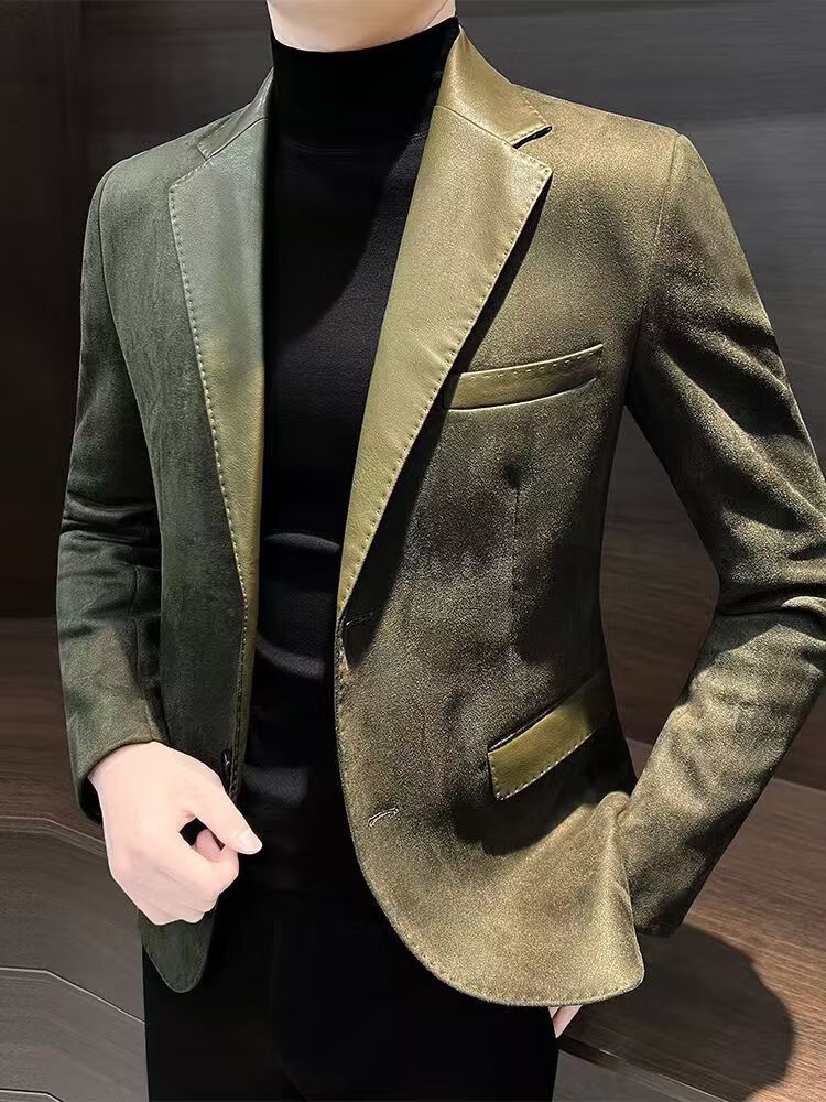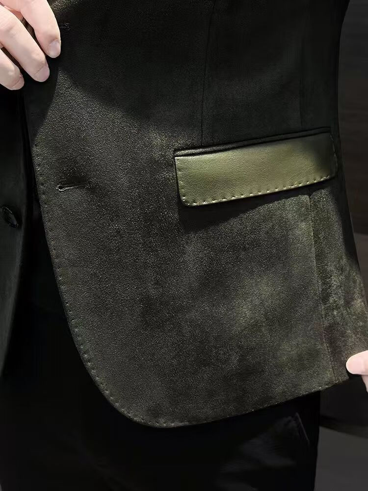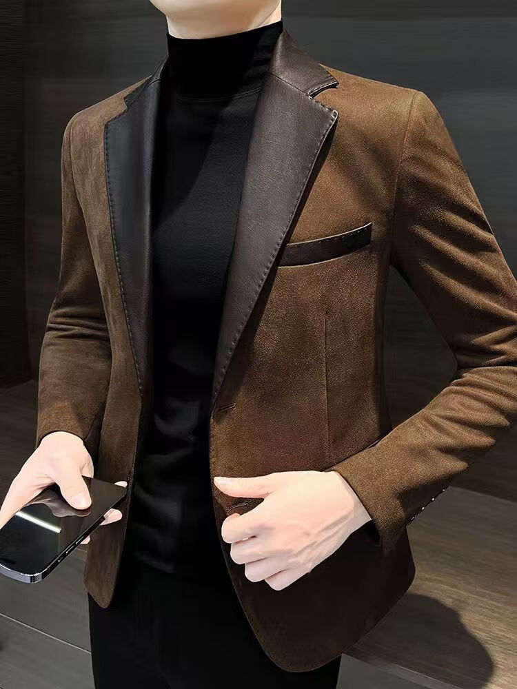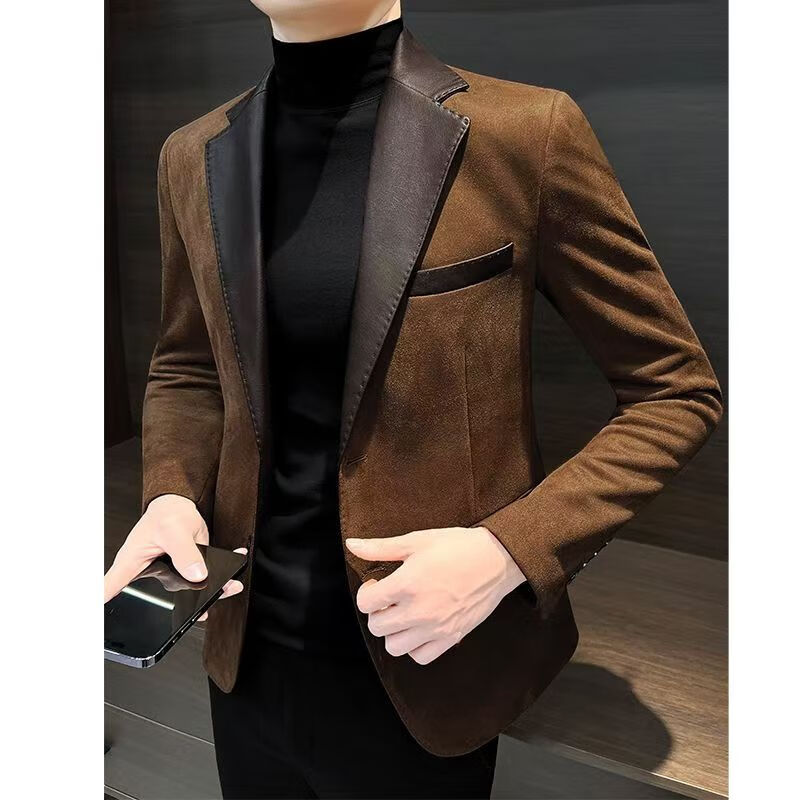 Pierre Cardin 2025 deerskin casual men's suit jacket trendy autumn and winter Hong Kong style handsome new high-end splicing suit Khaki XL
