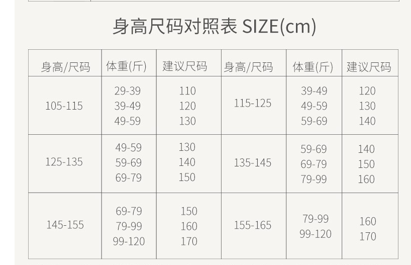 China (cm) 160-165/84-86 165-170 / 88-90 167-172 / 92-96 168-173 / 98-102 170-176 / 106-110