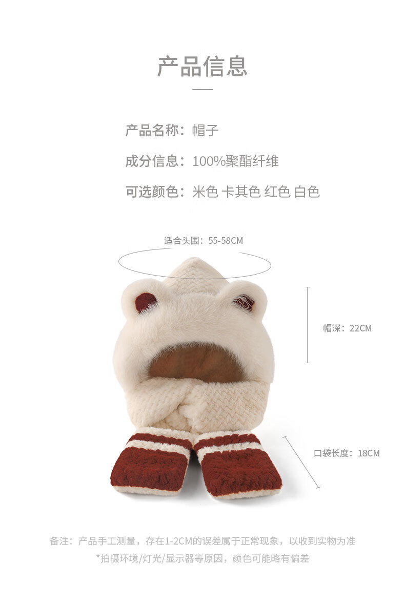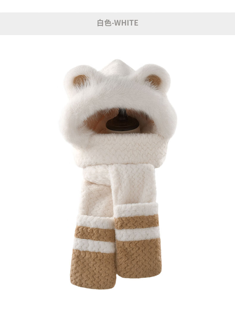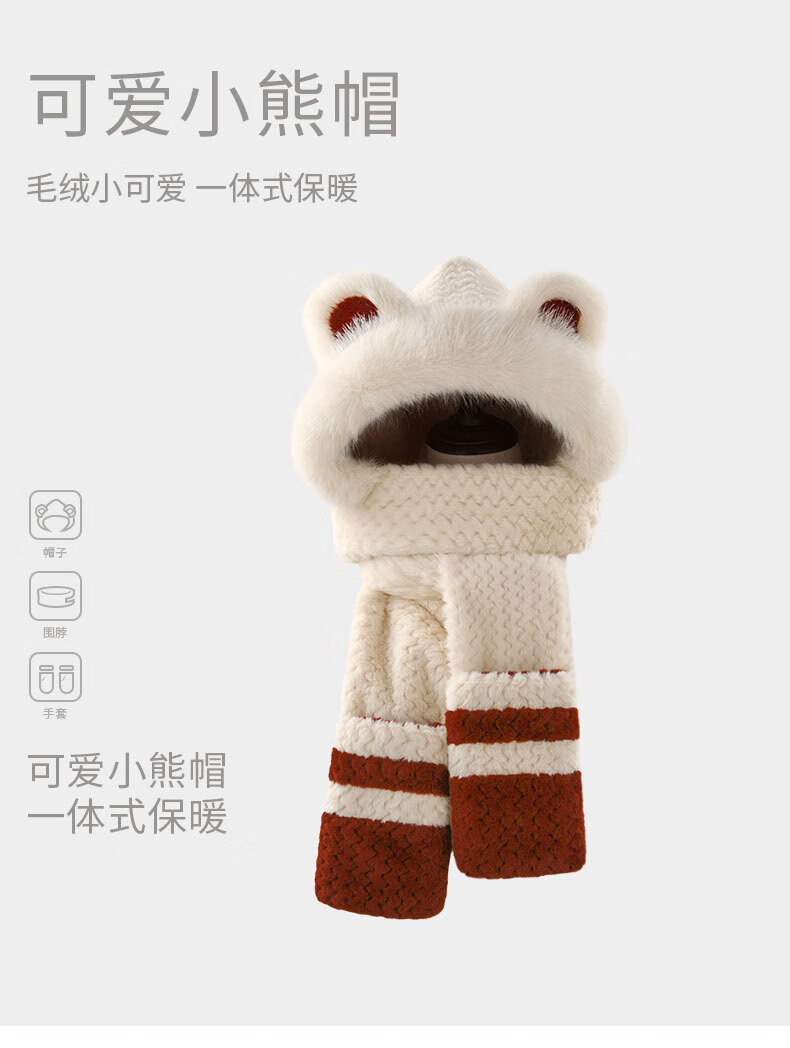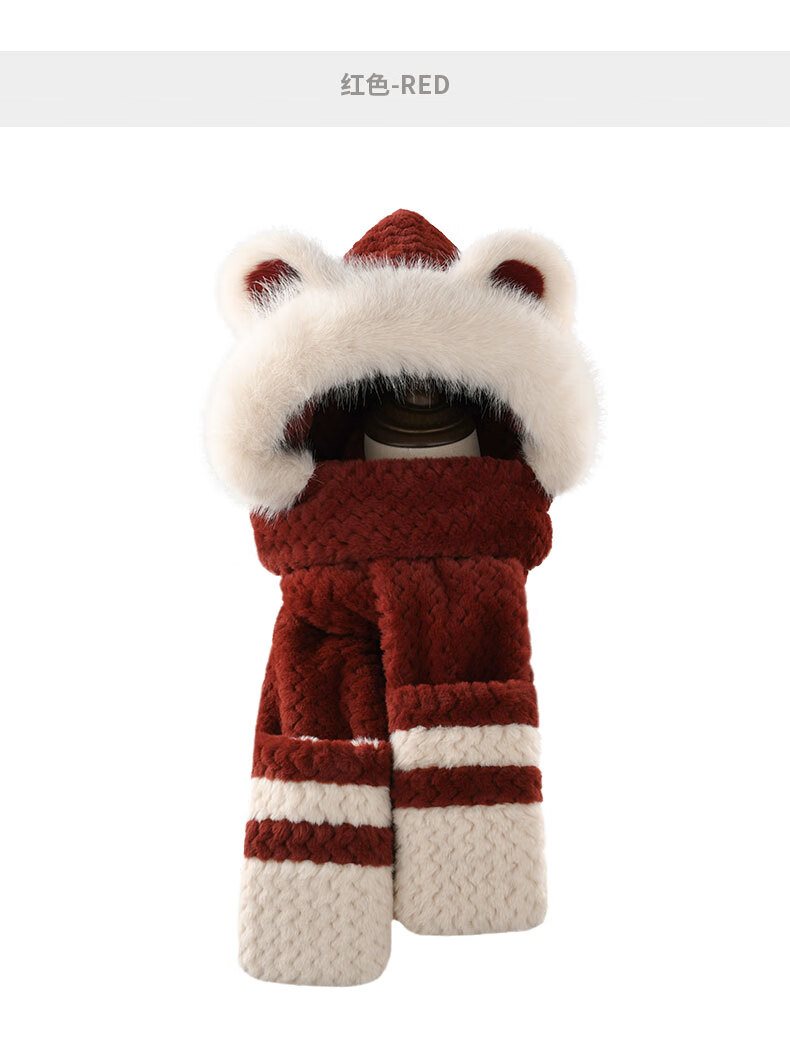 TonLion 2025 new cold-proof and warm bear plush hat scarf gloves all-in-one women's winter thickened ear protection cycling hat red
