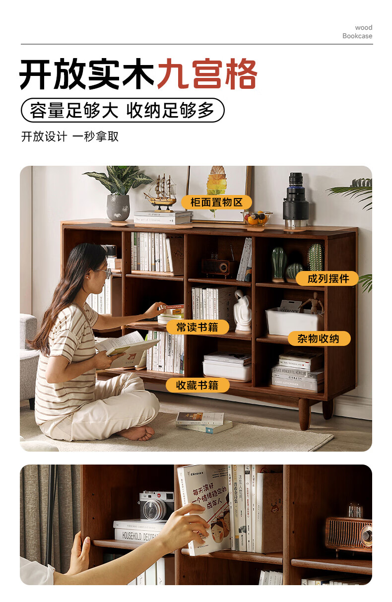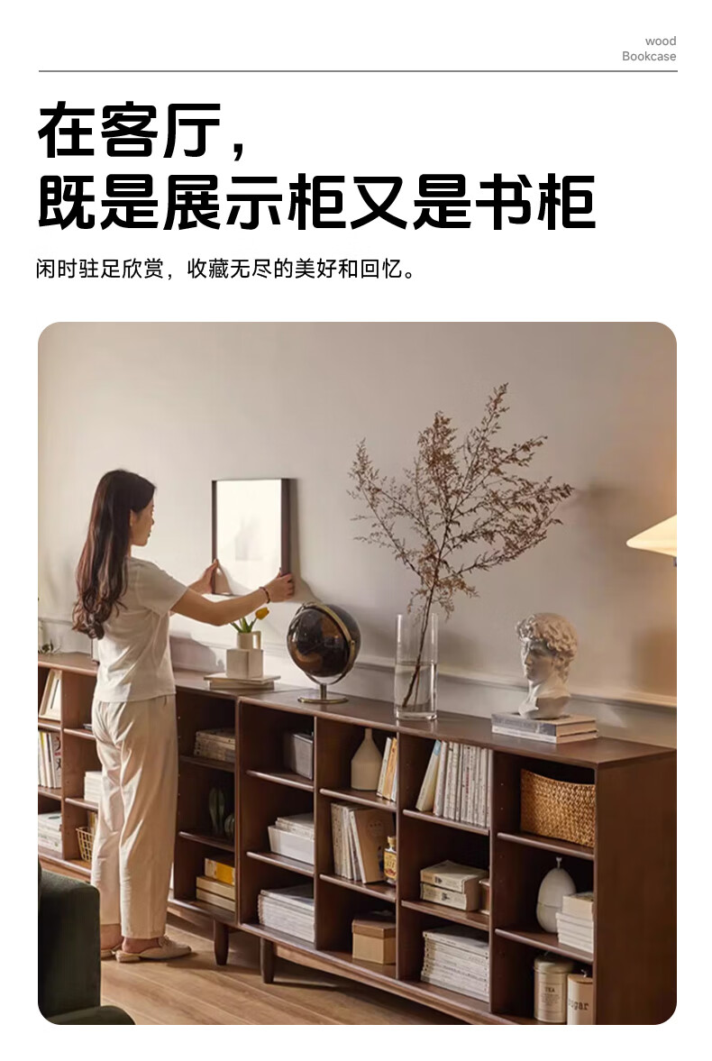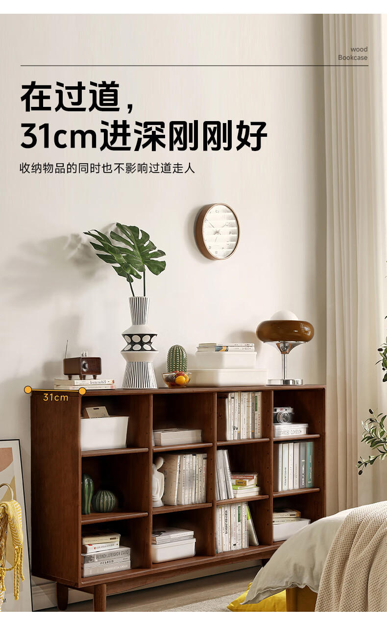Qingju pure solid wood bookshelf storage rack floor-standing solid wood bookcase integrated wall-mounted children's living room storage low cabinet lattice cabinet 12 compartments | walnut color 150cm shipped in one package 3A grade rubber wood + adjustable shelves + door-to-door delivery