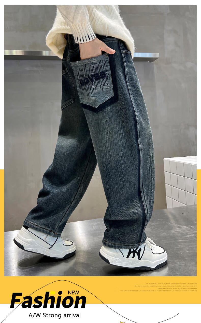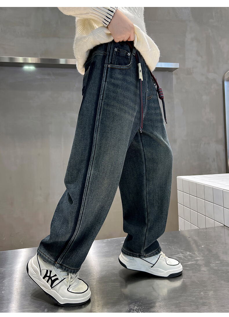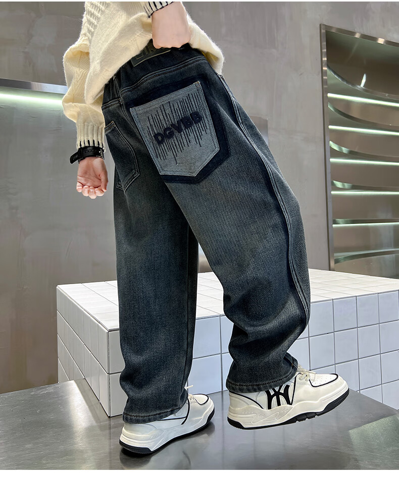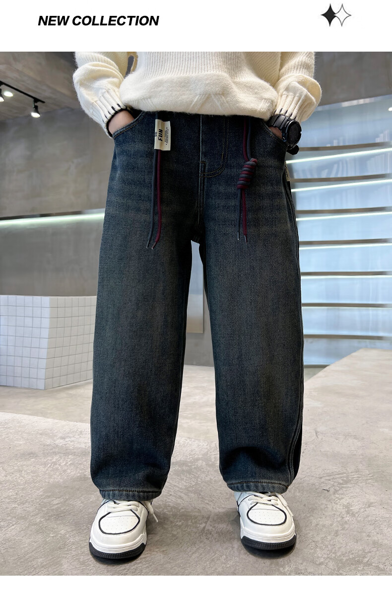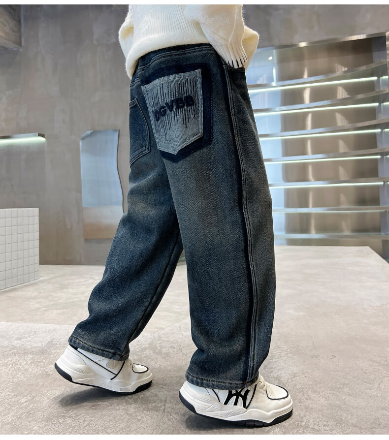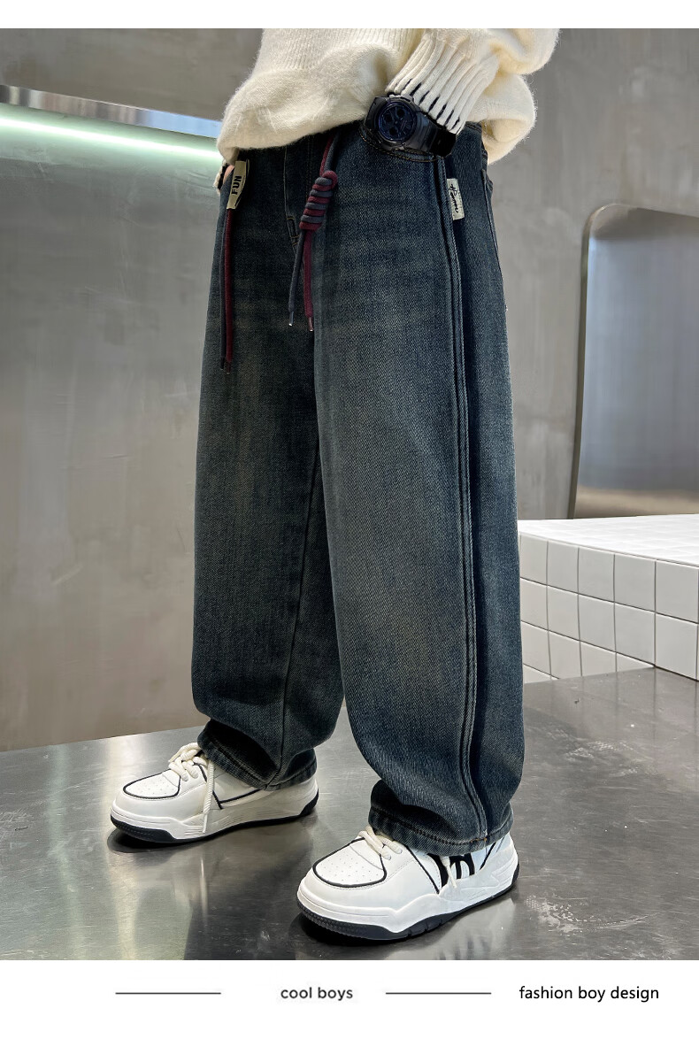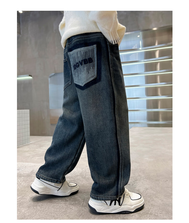 Doudou Kingdom Boys Jeans Autumn and Winter Medium and Large Children's Pants 2025 Winter New Boys' Velvet Thickened Casual Pants Blue Gray Velvet Style 150 Recommended Height 140cm-150cm