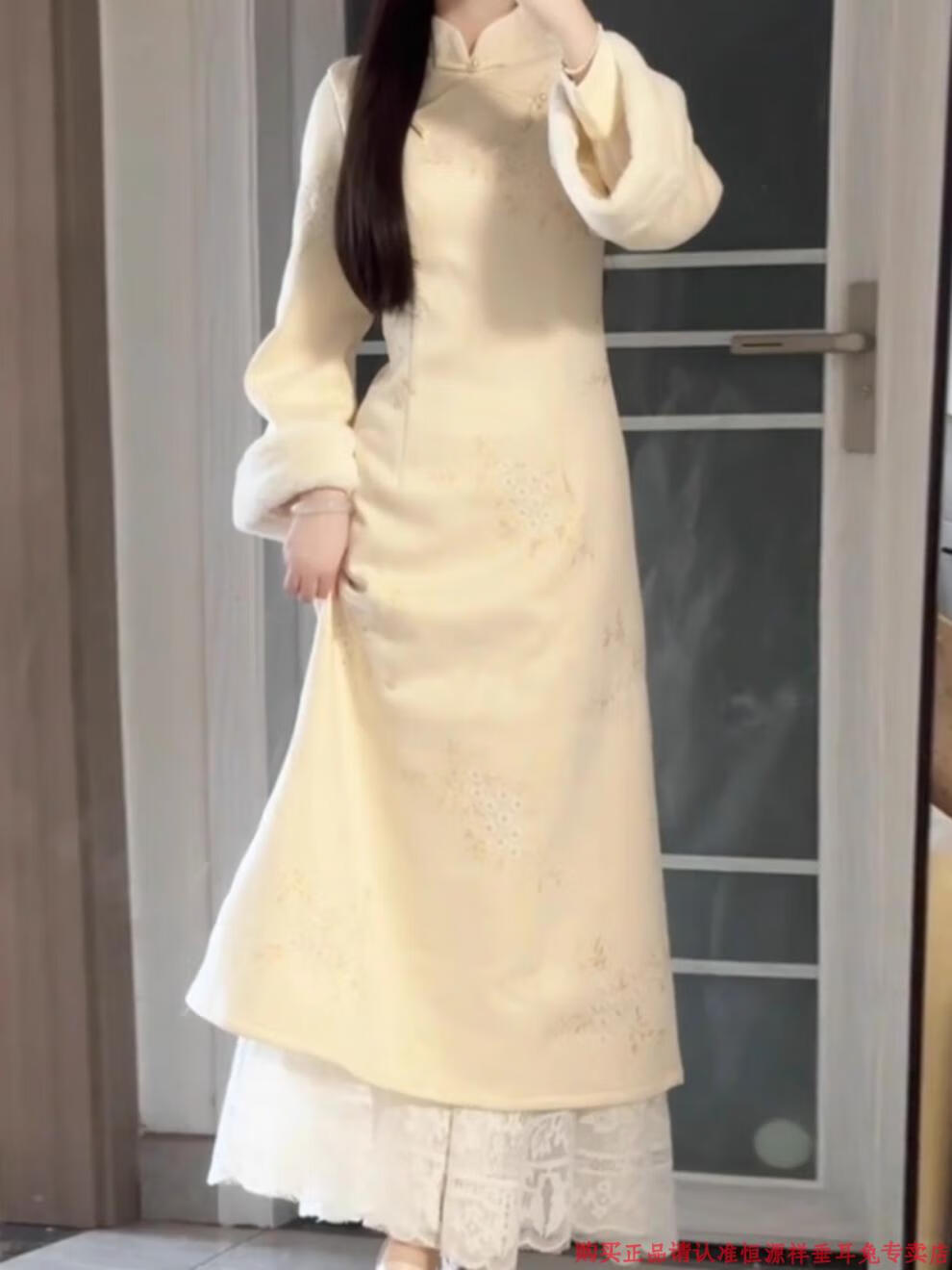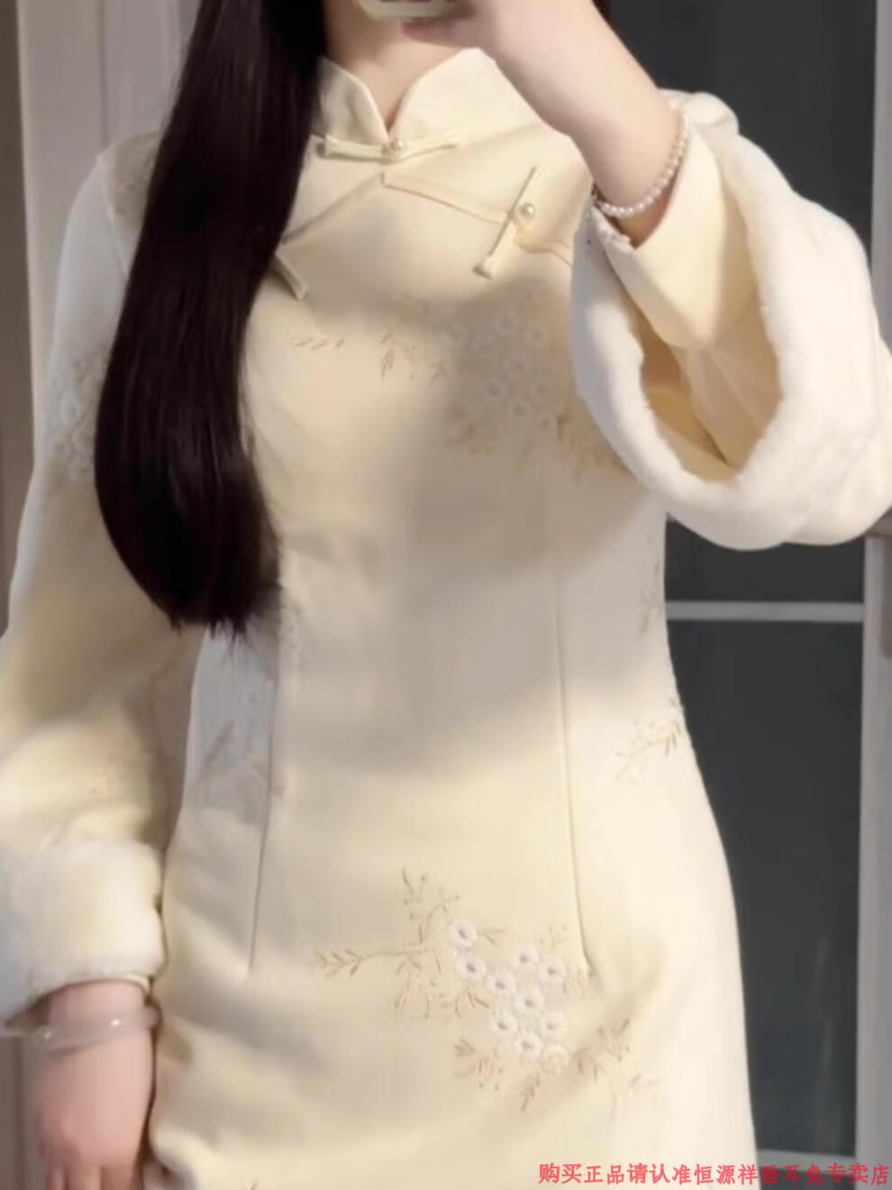 Hengyuanxiang off-white embroidered cheongsam 2024 winter new girl improved version elegant temperament plus velvet thickening new Chinese style off-white thickened plus velvet M (90)