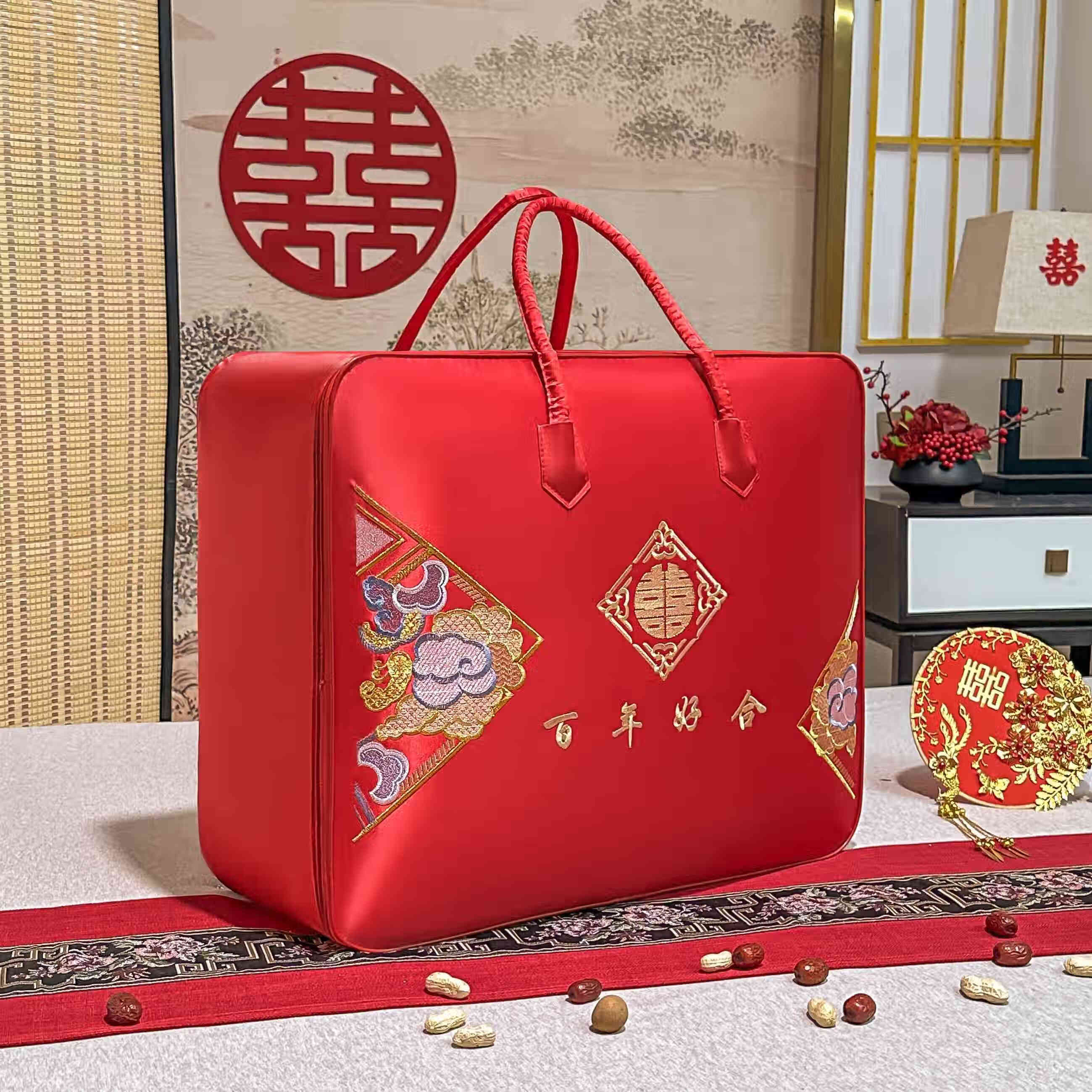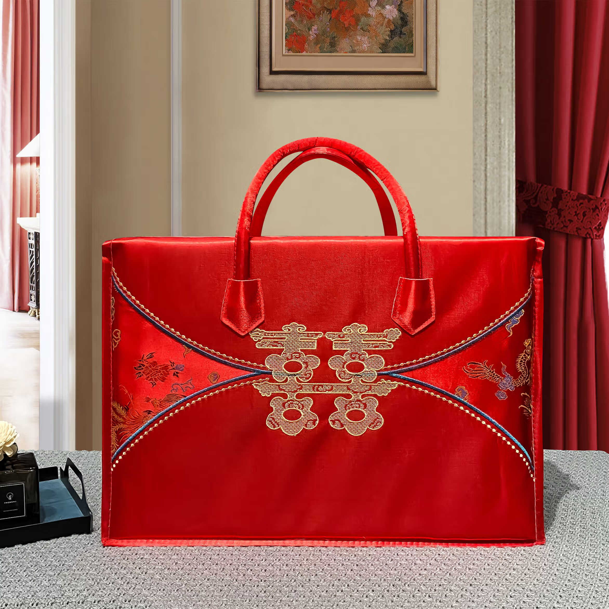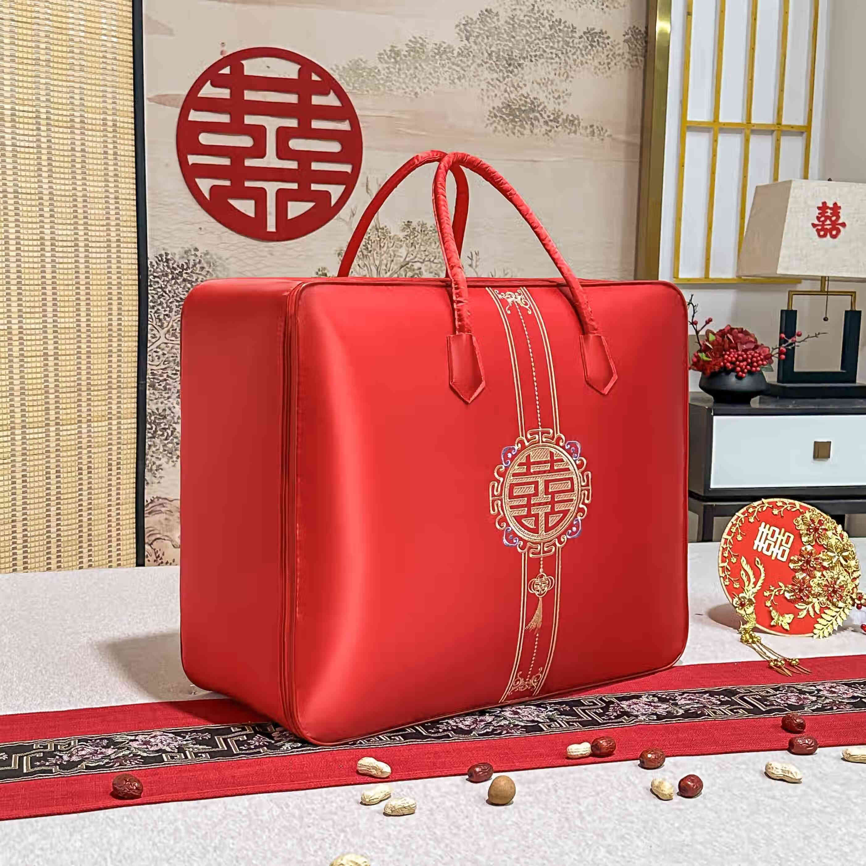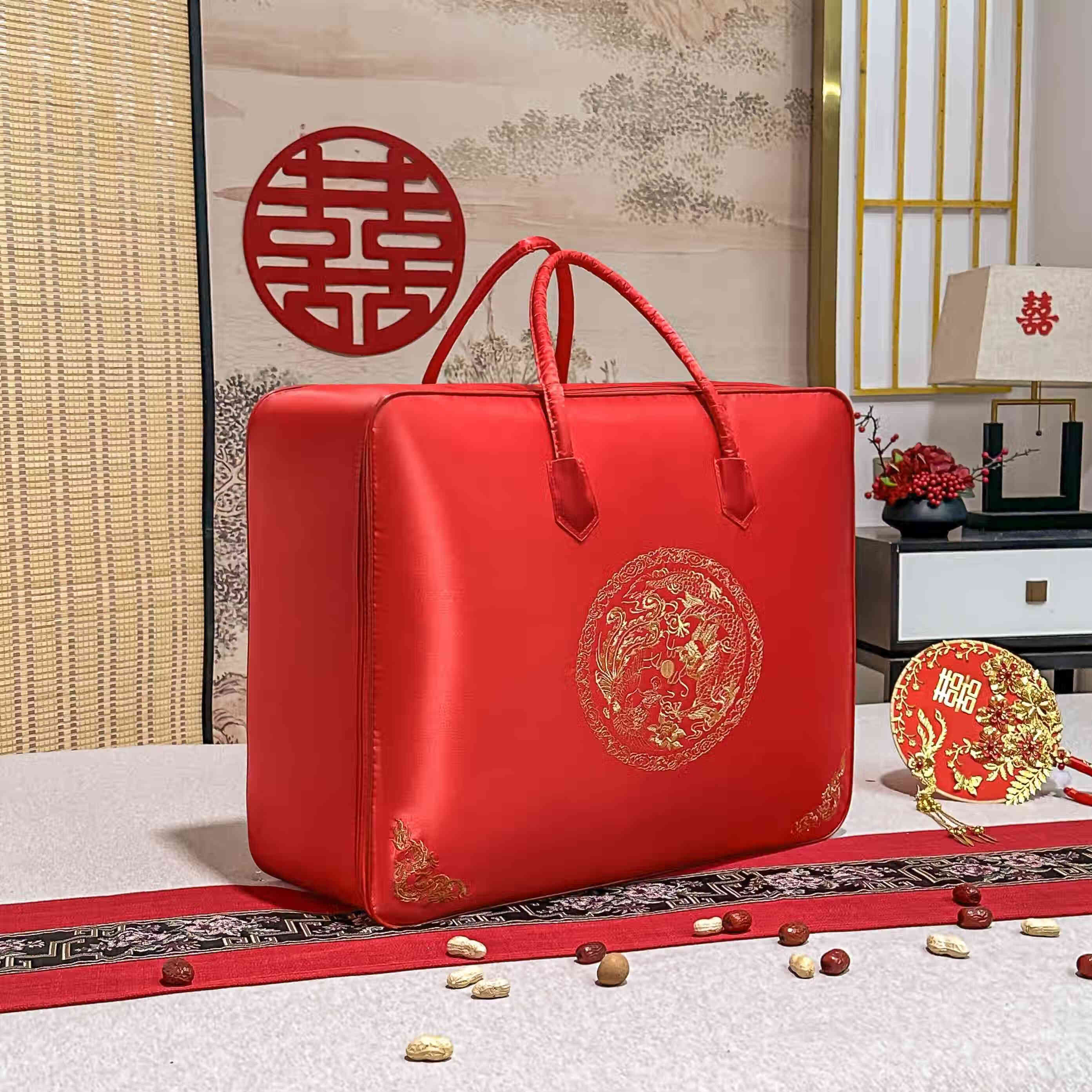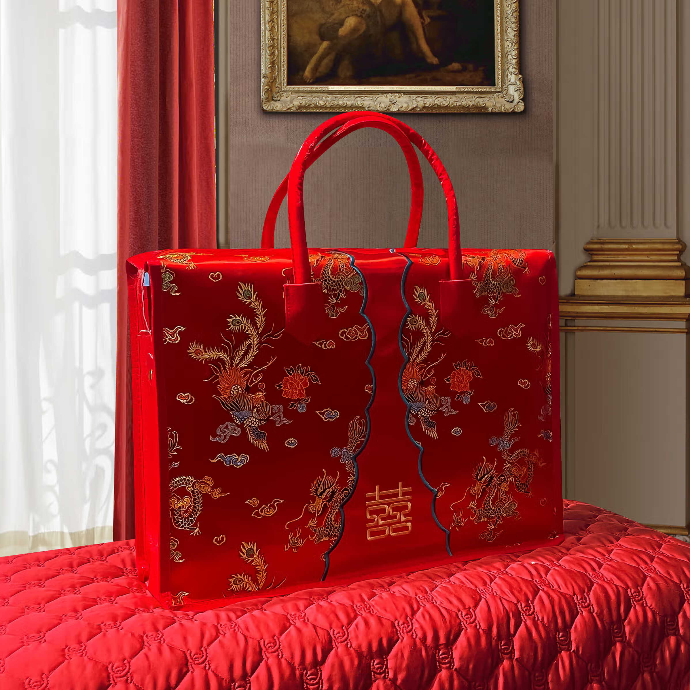 Qing Yu Xi quilt storage bag high-end wedding red four-piece suit with handbag Oxford cloth Dragon and Phoenix Chengxiang high-end satin embroidery fabric XL 60*50*33 pack 8-12 Jin Jin equals 0.5 kg quilt