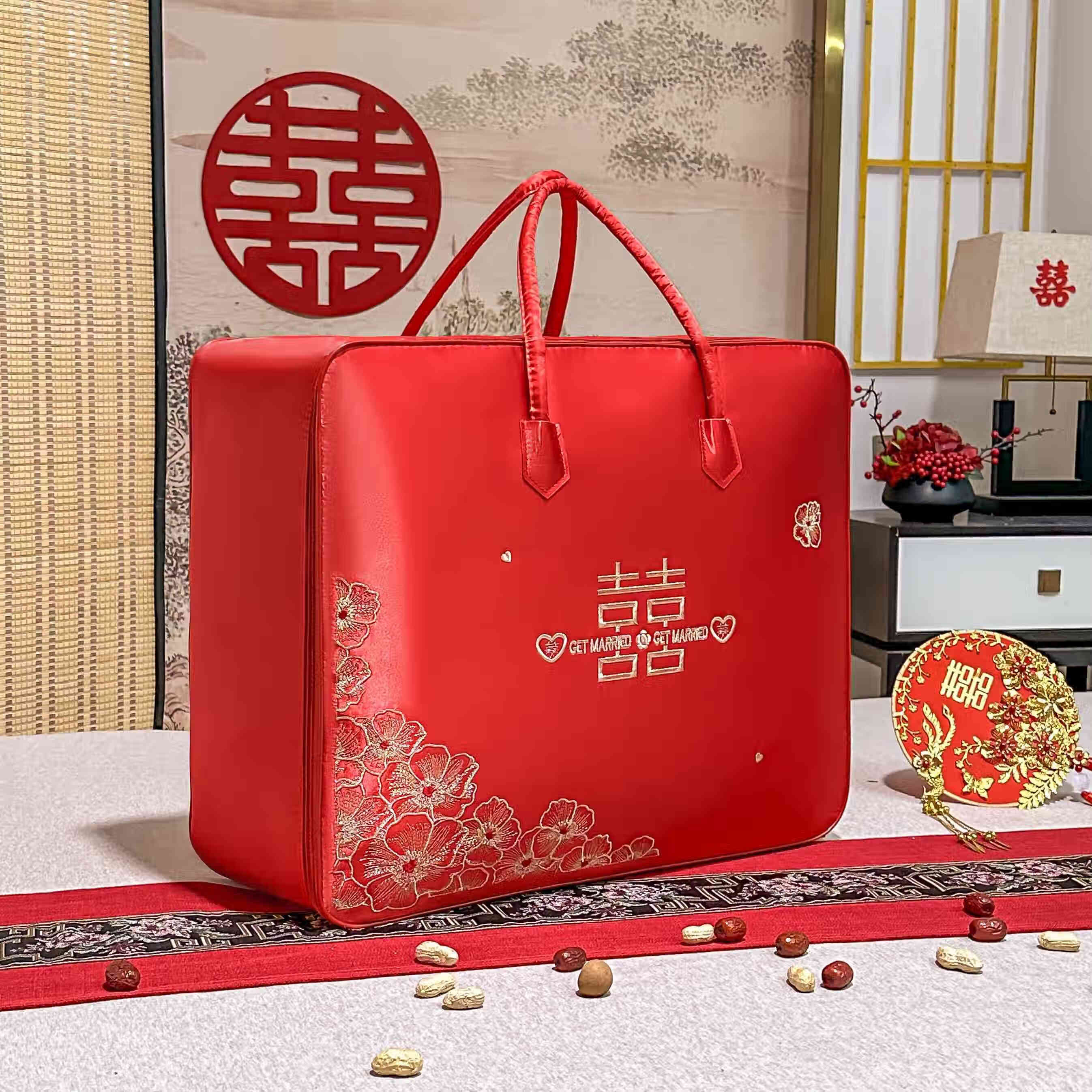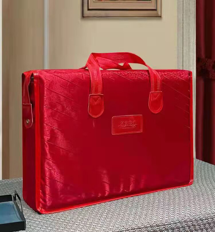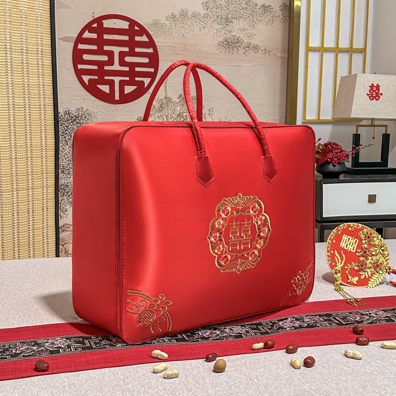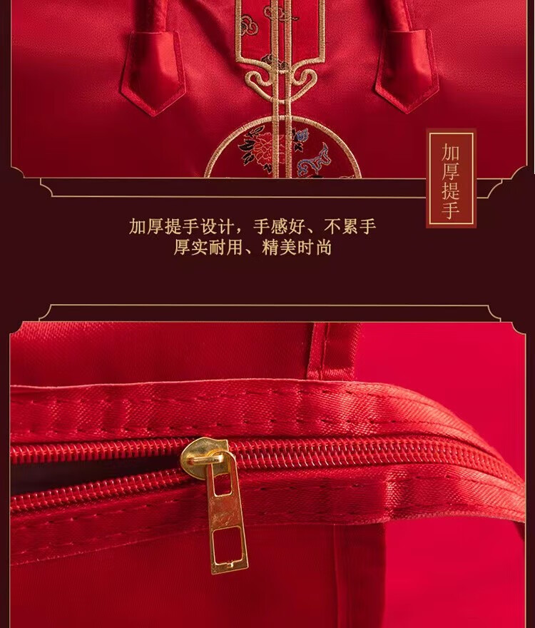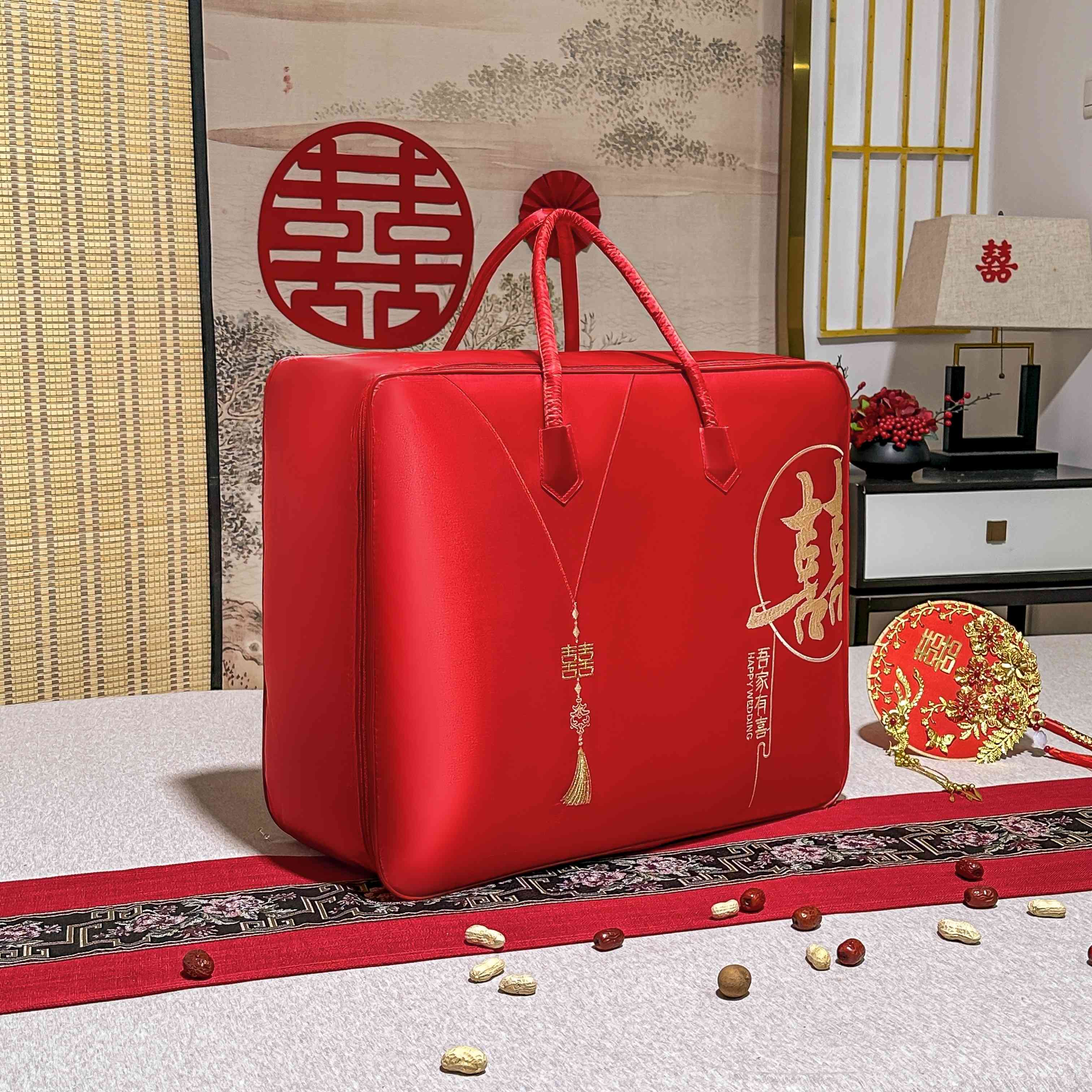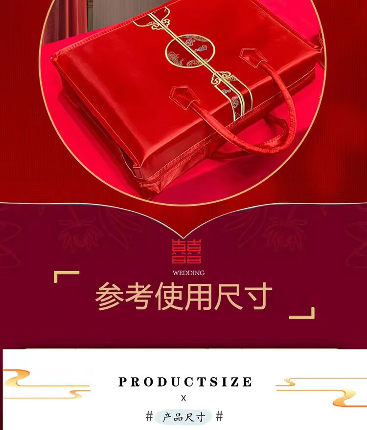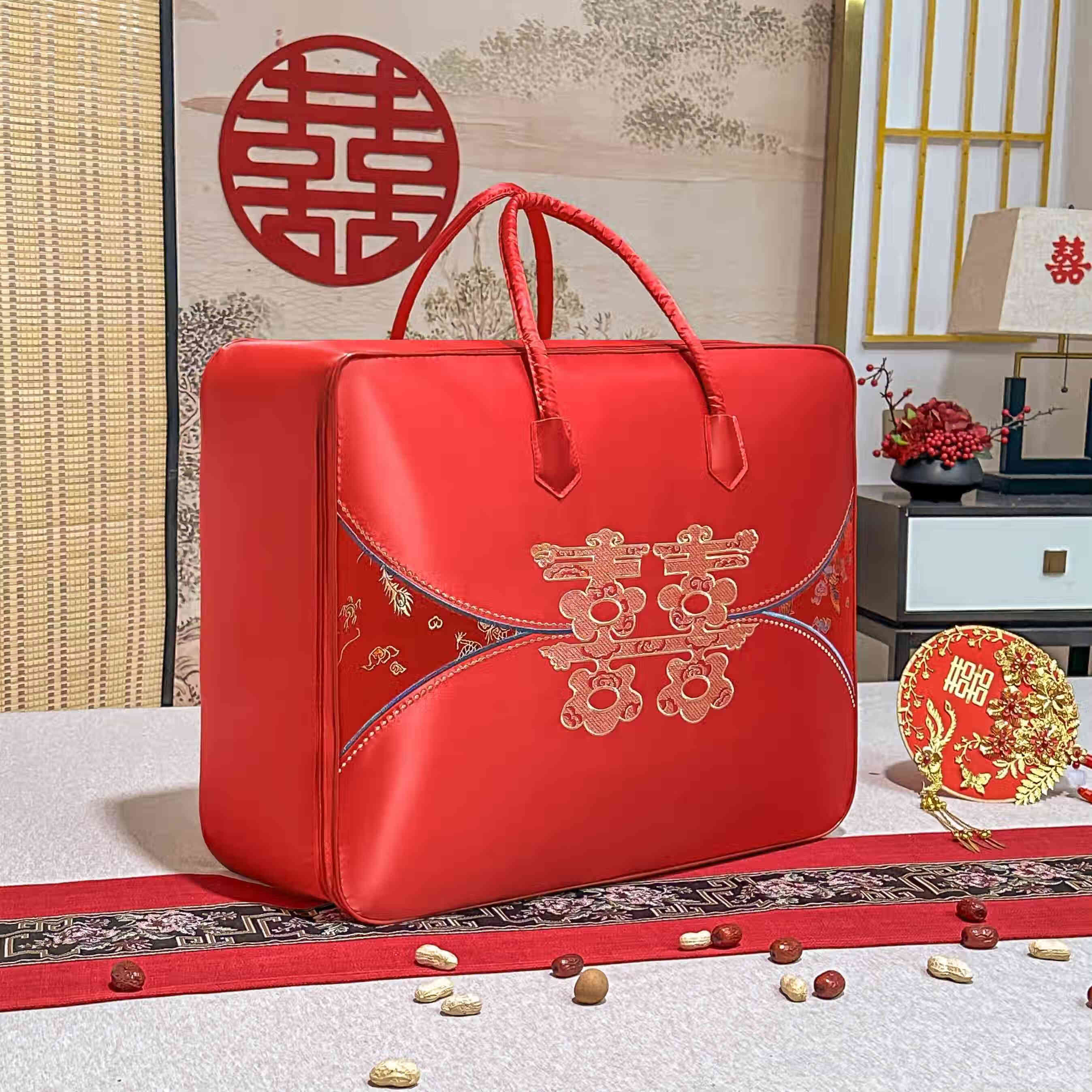 Qing Yu Xi quilt storage bag high-end wedding red four-piece suit with handbag Oxford cloth Dragon and Phoenix Chengxiang high-end satin embroidery fabric XL 60*50*33 pack 8-12 Jin Jin equals 0.5 kg quilt
