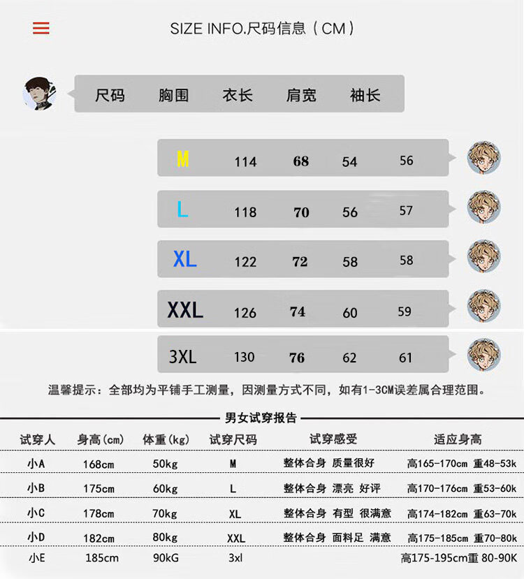 China (cm) 165 / 88-90 170 / 96-98 175 / 108-110 180 / 118-122 185 / 126-130