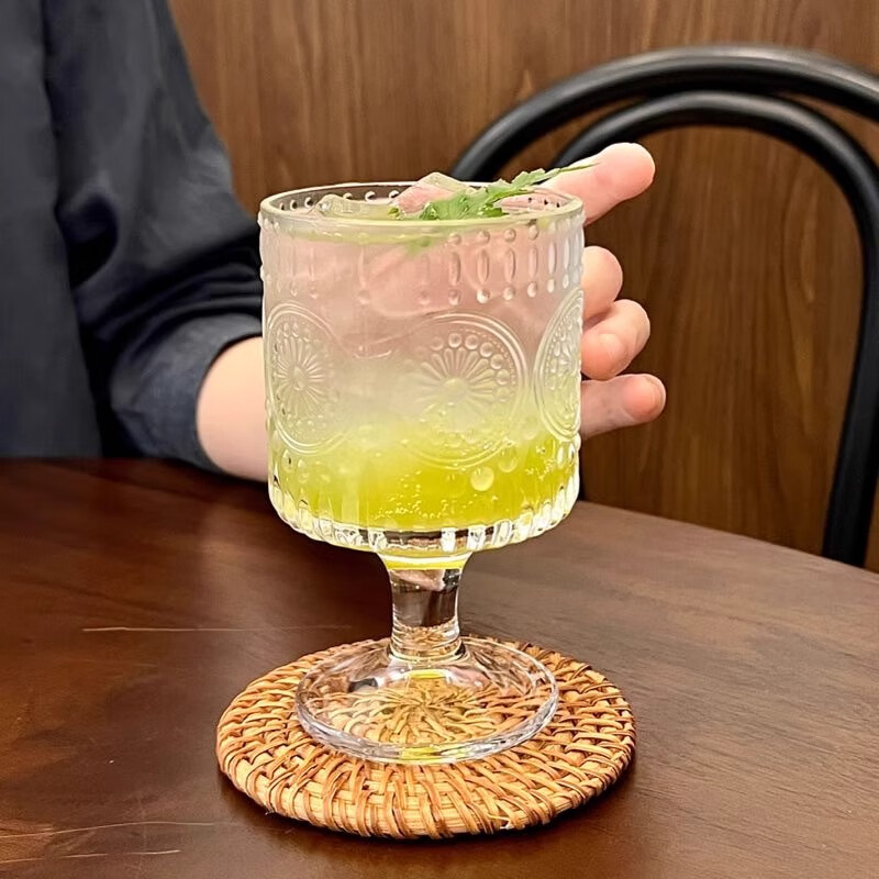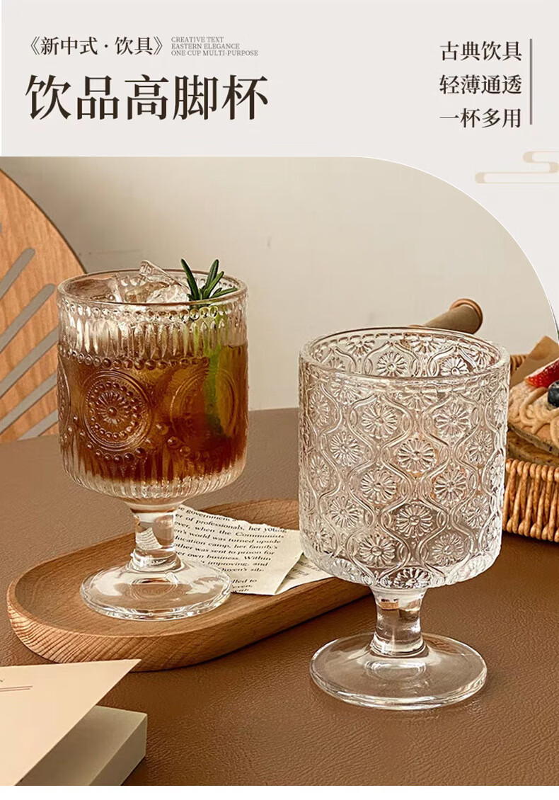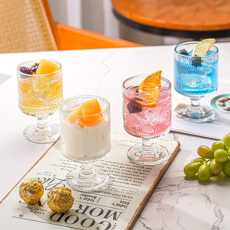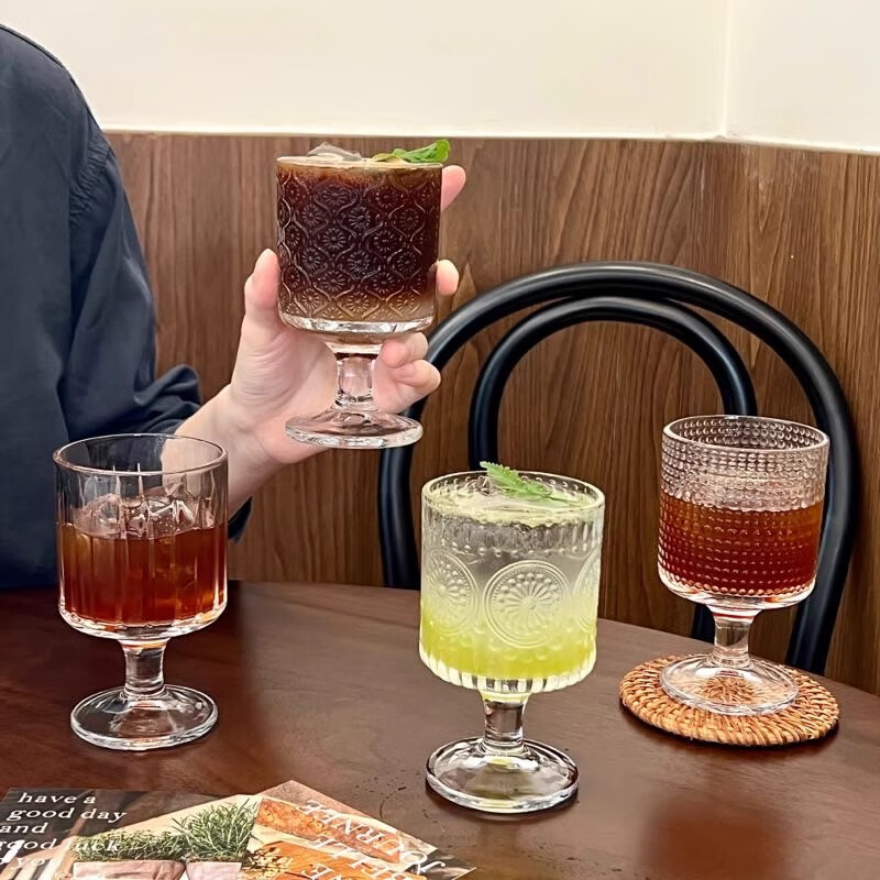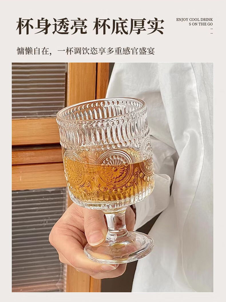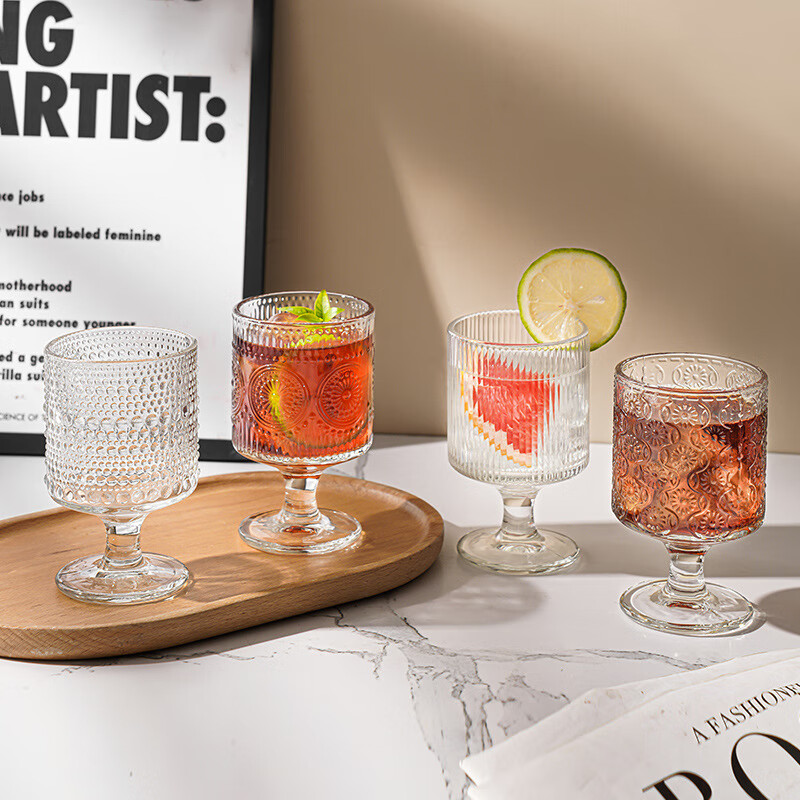 Lu Shanwu wine glass set, retro sunflower embossed glass cup, high-looking design, drink juice goblets, four-pack, mixed pattern wine glasses, four-pack