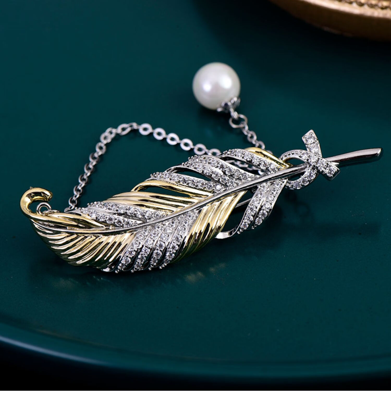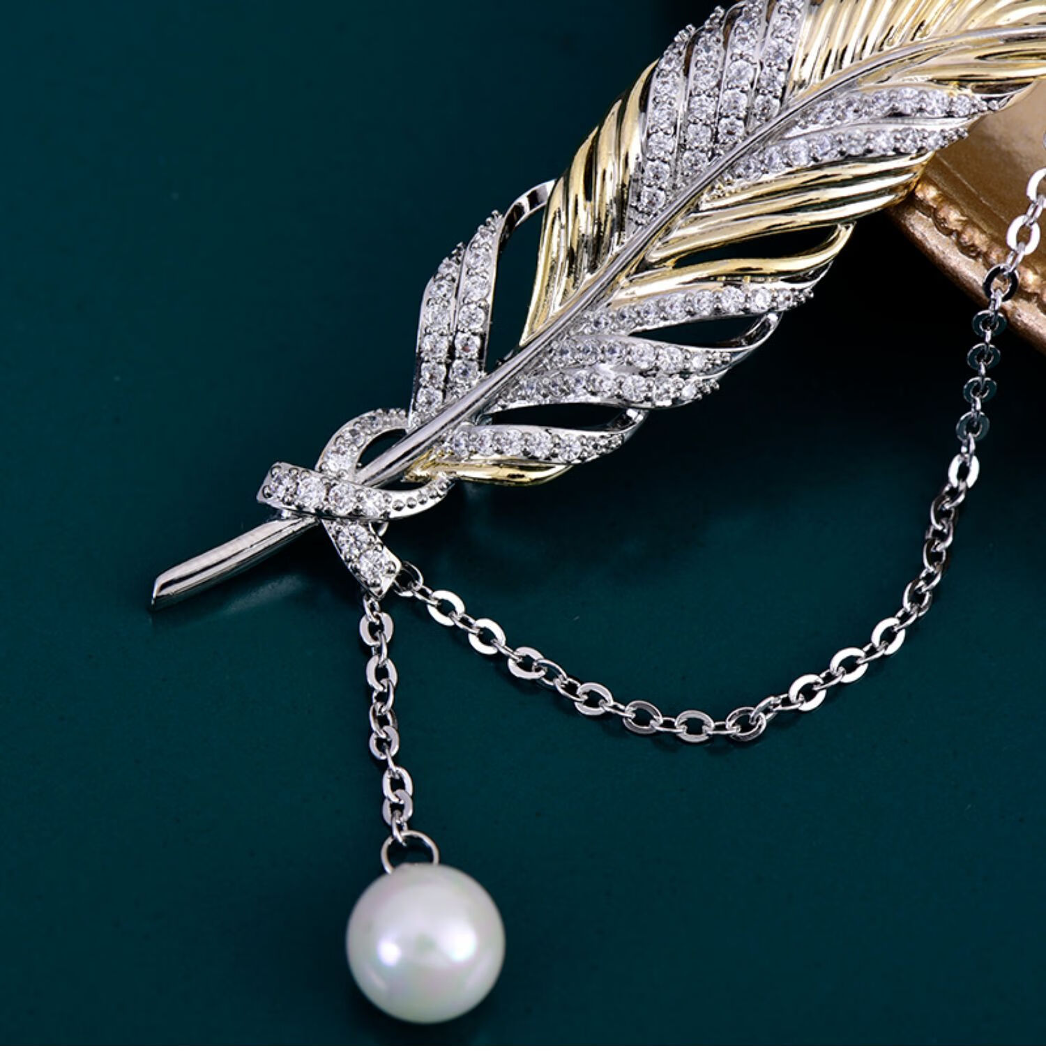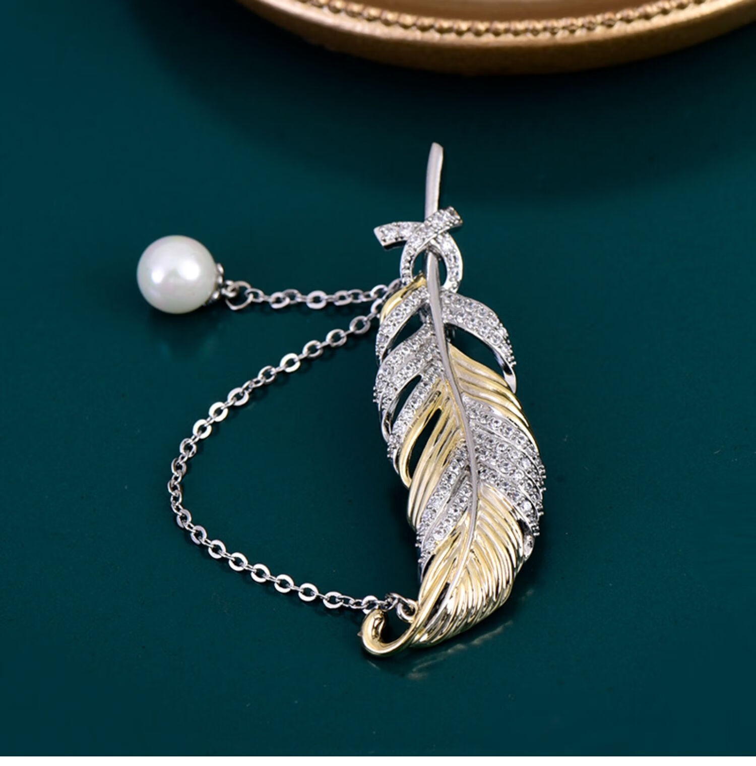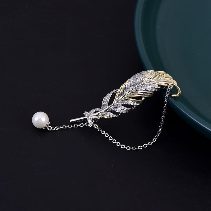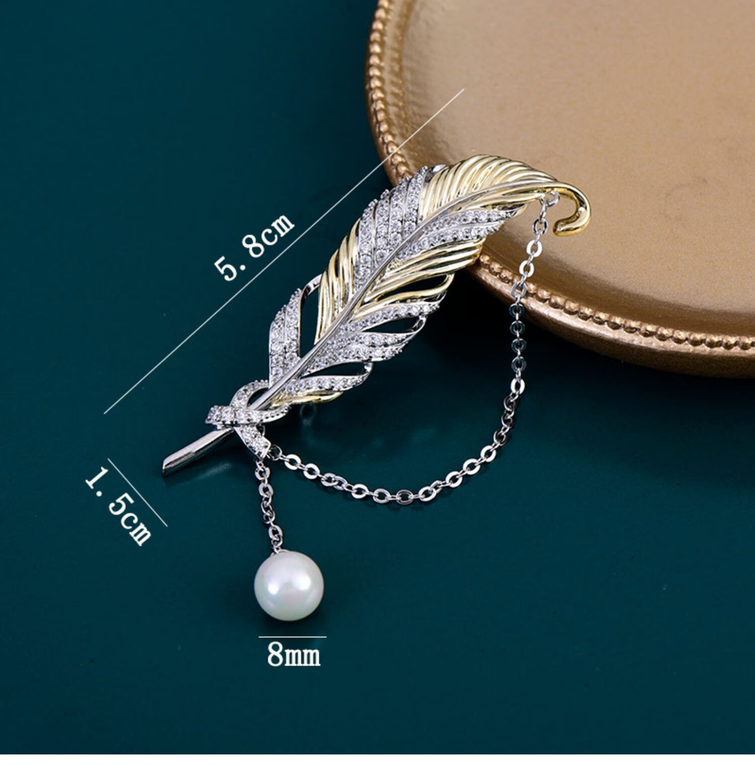 Suitable for middle leaning, fashionable tassel style feather brooch, high-end women's all-match small fragrant style pearl suit corsage, golden water drop feather 7.0*1.8cm