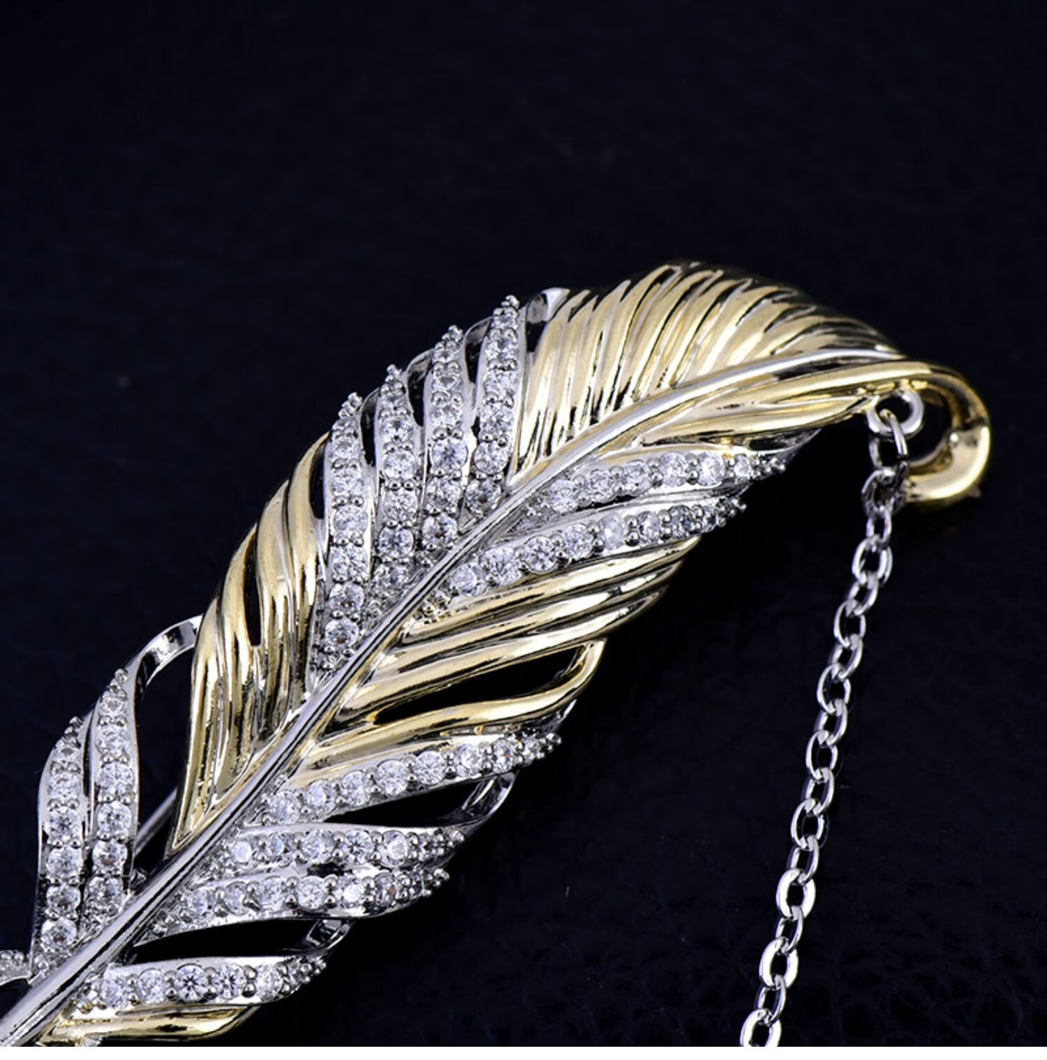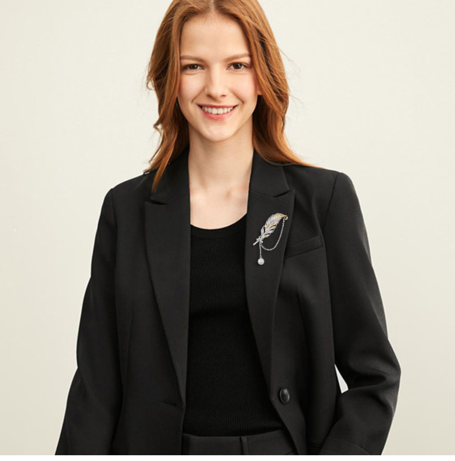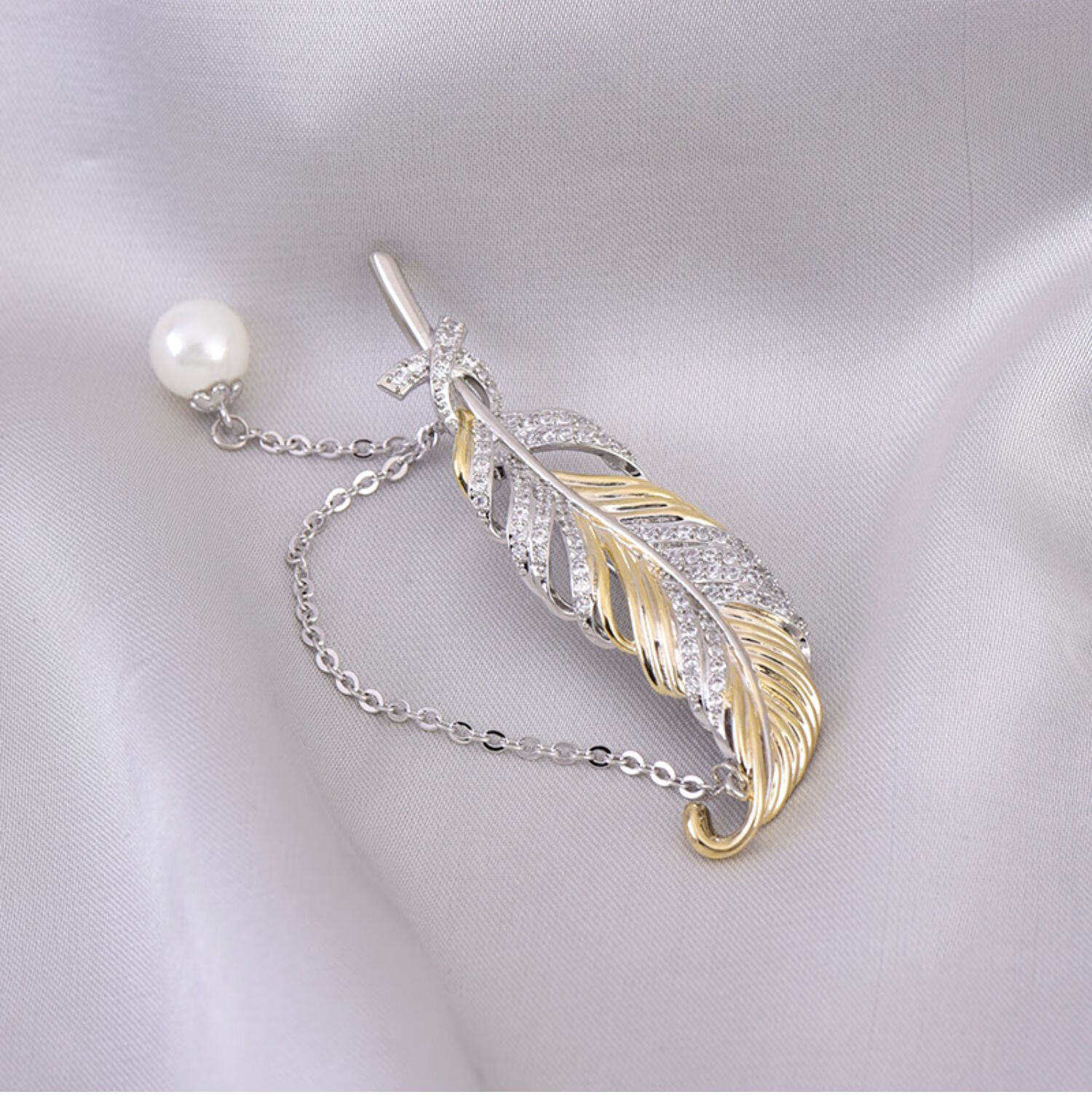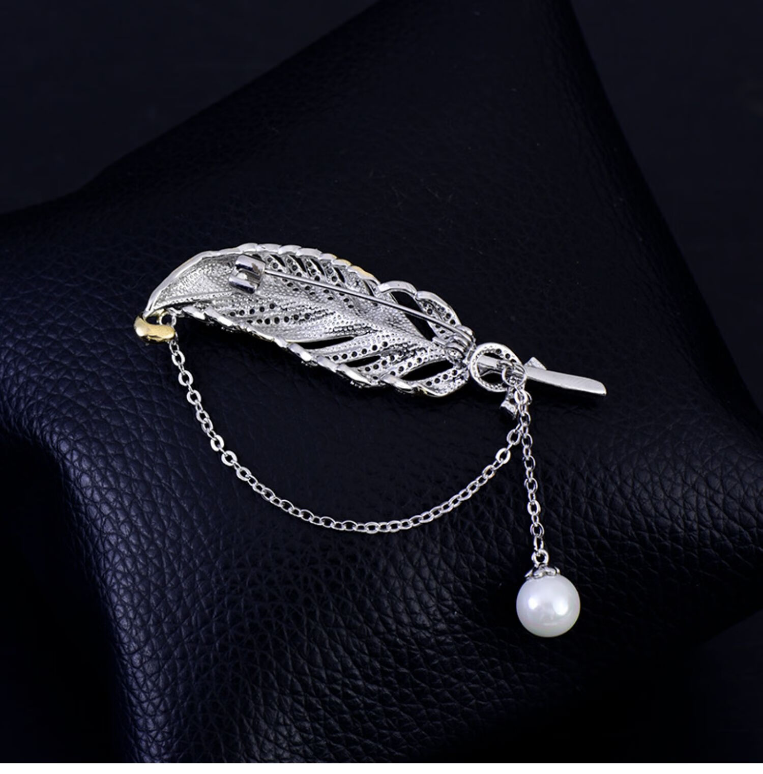 Suitable for middle leaning, fashionable tassel style feather brooch, high-end women's all-match small fragrant style pearl suit corsage, golden water drop feather 7.0*1.8cm