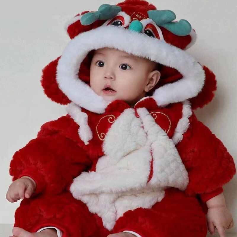Hong Yile Baby New Year Clothes Winter Warm Baby Jumpsuit Winter New Year Clothes Super Cute Festive New Year Outing Cotton Clothes Red Dance Dragon New Year Thickened Clothes (Little Tail) 90cm 11-14 Months 20-24Jin Jin is equal to 0.5 kg