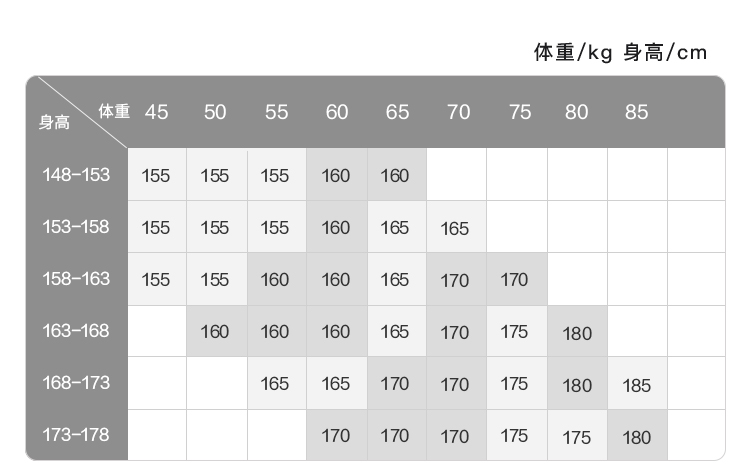 China (cm) 160-165/84-86 165-170 / 88-90 167-172 / 92-96 168-173 / 98-102 170-176 / 106-110