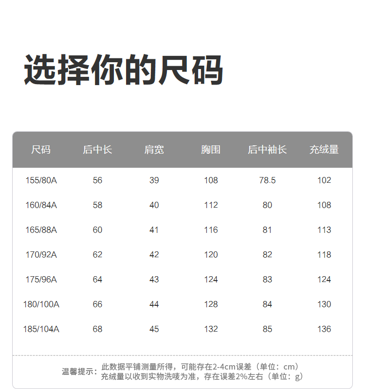 China (cm) 165 / 88-90 170 / 96-98 175 / 108-110 180 / 118-122 185 / 126-130
