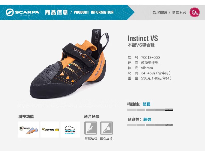 SCARPA Scarpa outdoor shoes instinctive VS Italian outdoor men's rock climbing shoes bouldering shoes for women black and orange 34