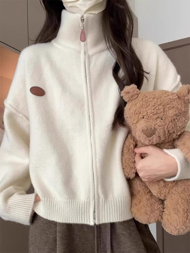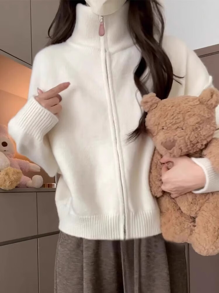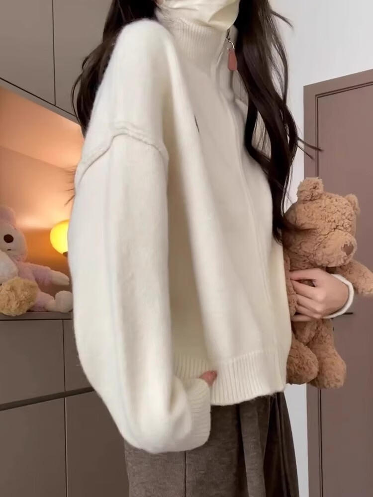 LDBE turtleneck sweater for women autumn and winter 2025 new relaxed Korean style lazy style soft waxy sweater zipper cardigan jacket beige M