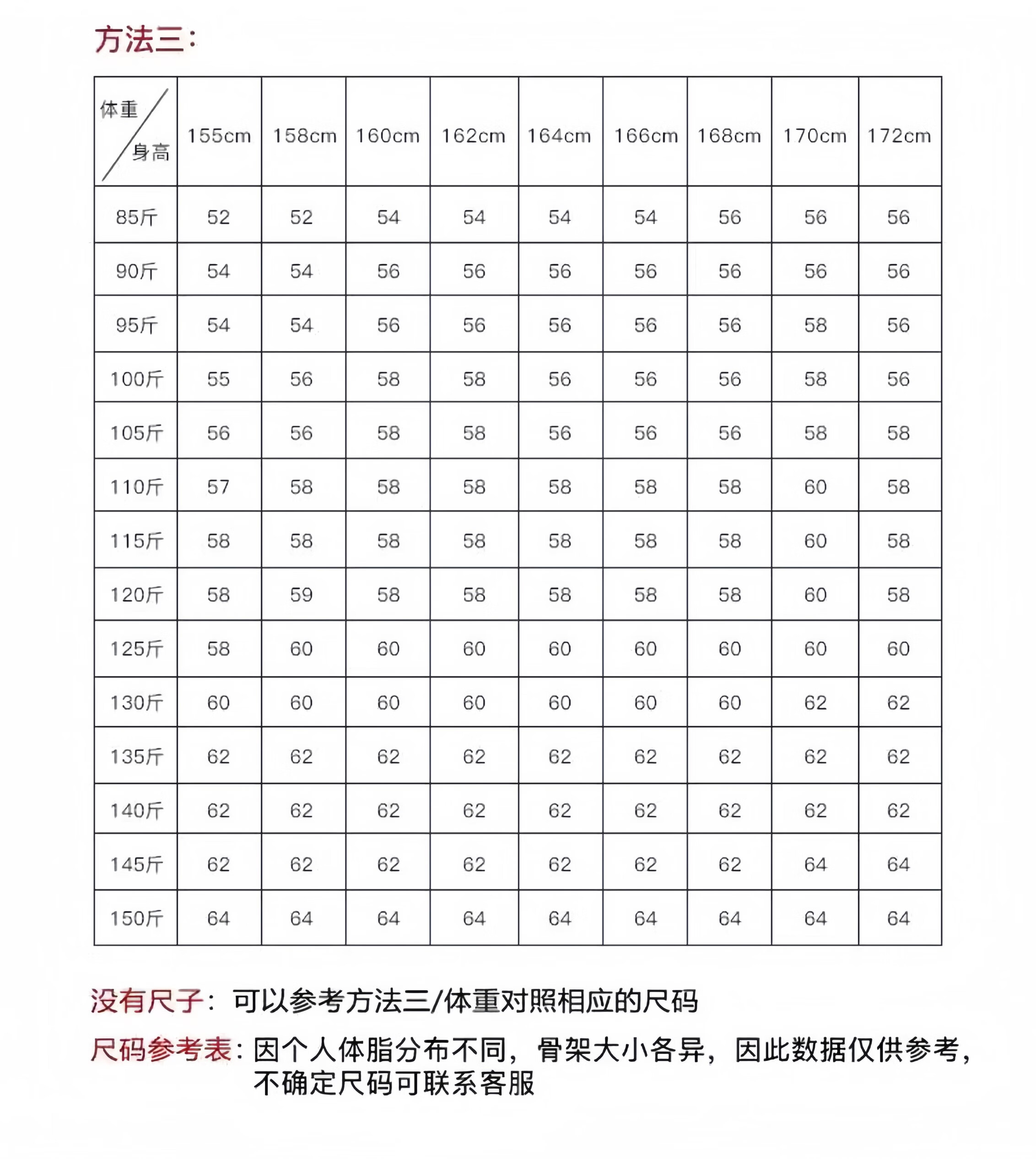 China (cm) 160-165/84-86 165-170 / 88-90 167-172 / 92-96 168-173 / 98-102 170-176 / 106-110