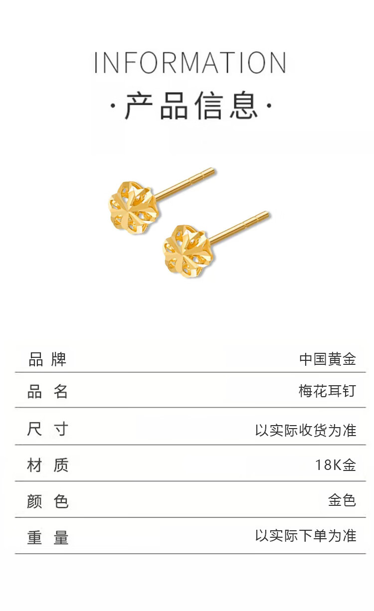 China Gold 18k Gold Plum Blossom Earrings Women's Earrings Color Gold Flower Ornaments for Ear Piercing Christmas and Valentine's Day Gifts for Best Friends 18K Plum Blossom Earrings About 0.1g