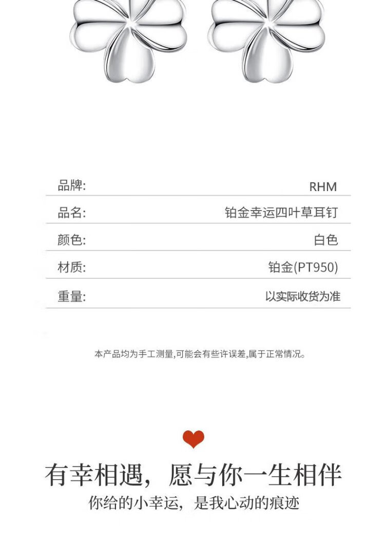 RHMPT950 platinum four-leaf clover earrings for women, high-end pierced ears, platinum earrings, Valentine's Day gift for girlfriend, platinum four-leaf clover earrings + certificate + gift box