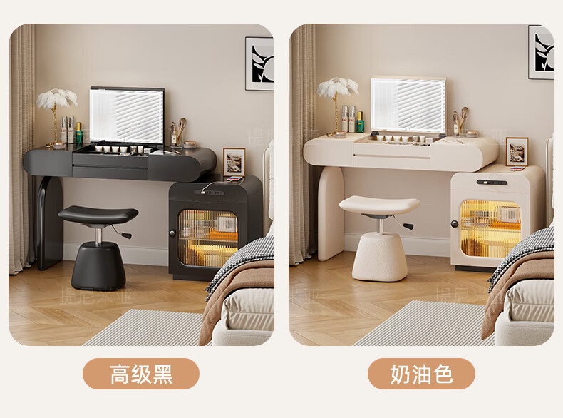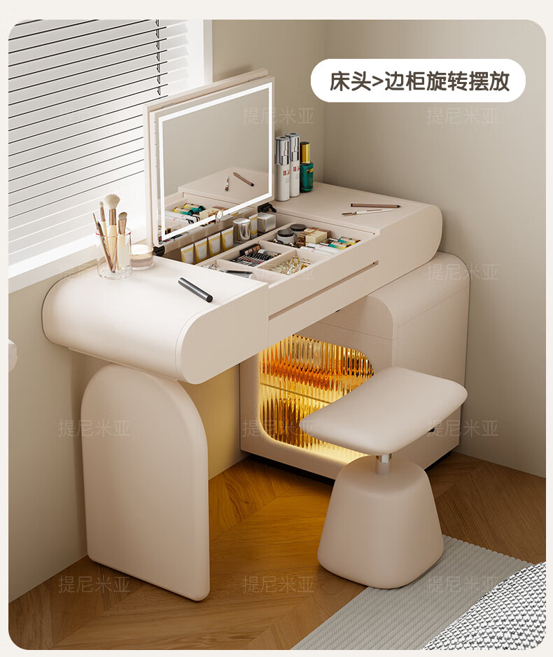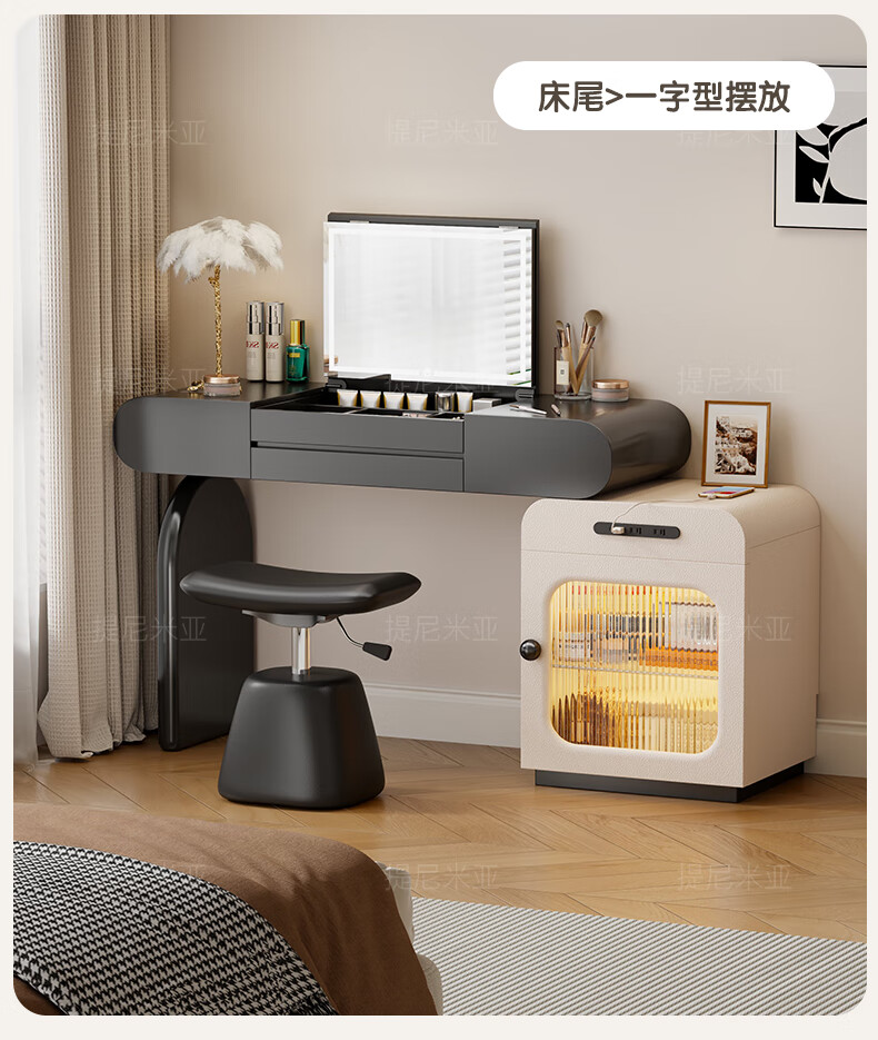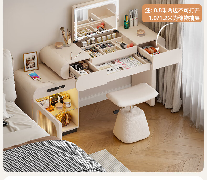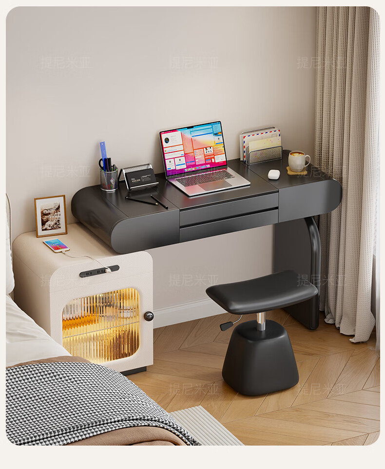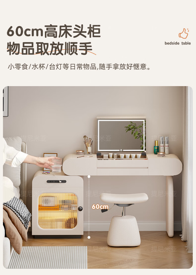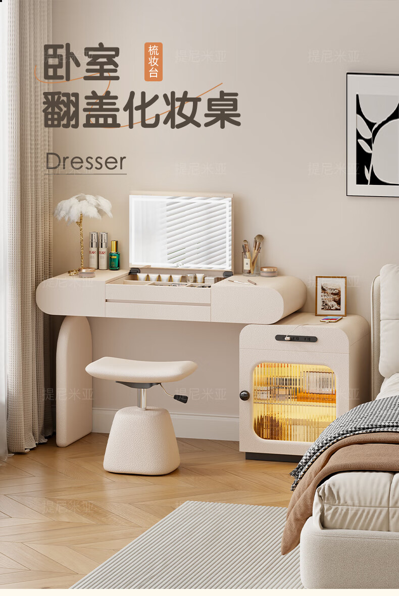 Tinimia dressing table desk two-in-one 2025 new white high-end locker bedroom small apartment bedside table dressing table white丨charging socket-reserved skirting 1.2 meters dressing table + bedside table + lifting stool