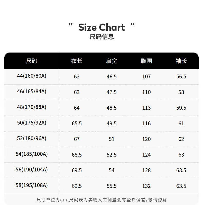 China (cm) 165 / 88-90 170 / 96-98 175 / 108-110 180 / 118-122 185 / 126-130