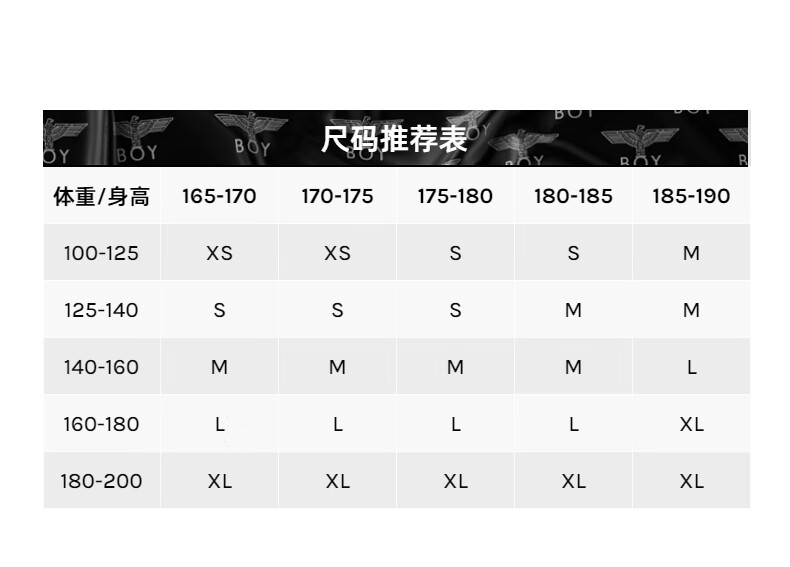 China (cm) 165 / 88-90 170 / 96-98 175 / 108-110 180 / 118-122 185 / 126-130