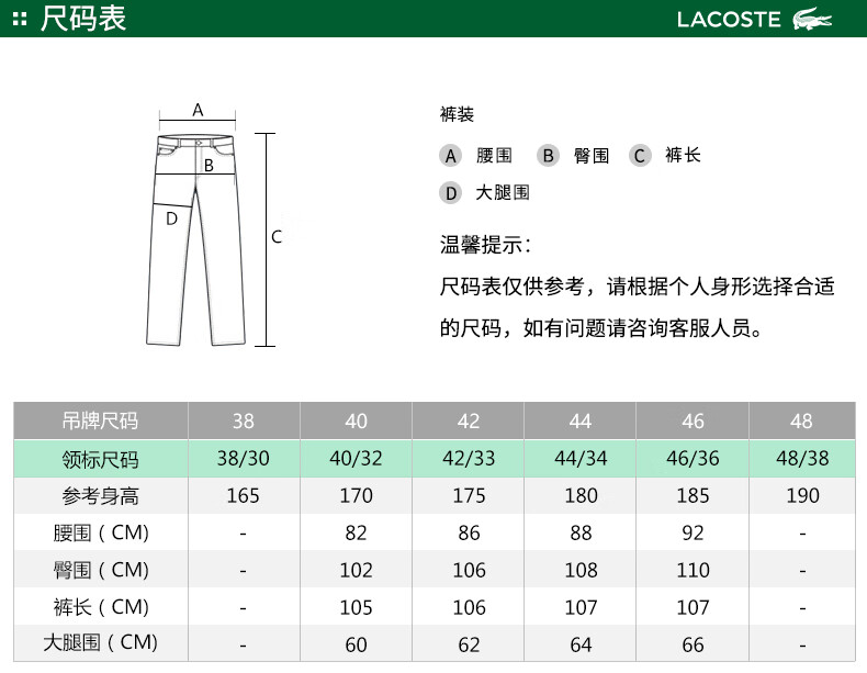China (cm) 165 / 88-90 170 / 96-98 175 / 108-110 180 / 118-122 185 / 126-130