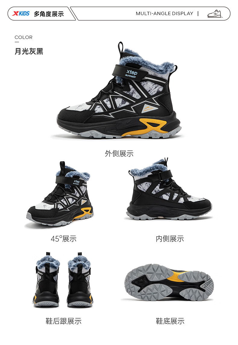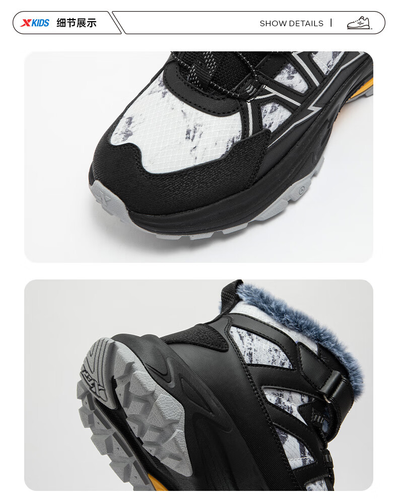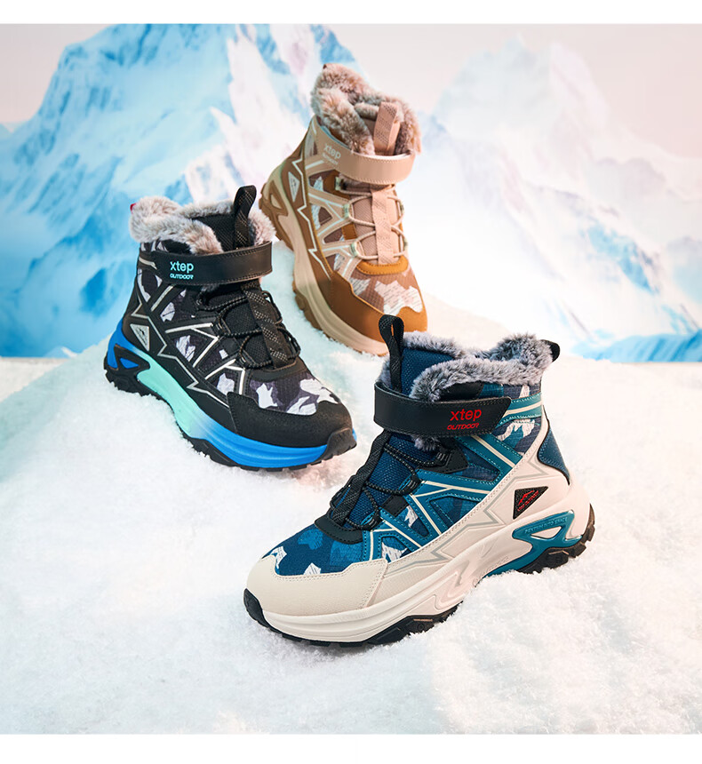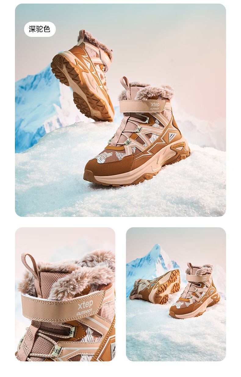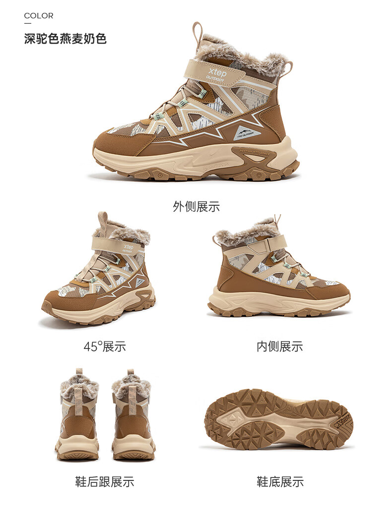 Xtep Children's Shoes Children's Cotton Shoes for Boys Medium and Large Children's Leather Mesh Spliced Velvet Warm Non-Slip Wear-Resistant High Top Velcro Cotton Shoes Dark Camel/Oatmeal Milk Color 35 Sizes