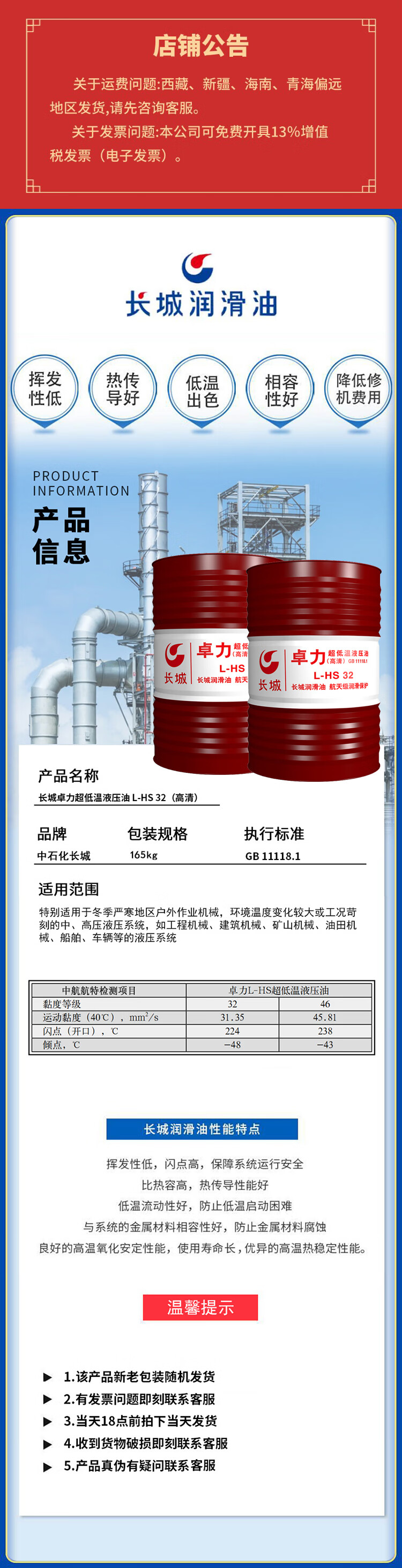 Great Wall Zhuoli L-HS ultra-low temperature hydraulic oil (HD) L-HS32 165KG