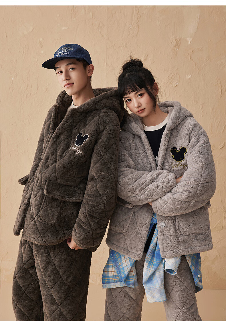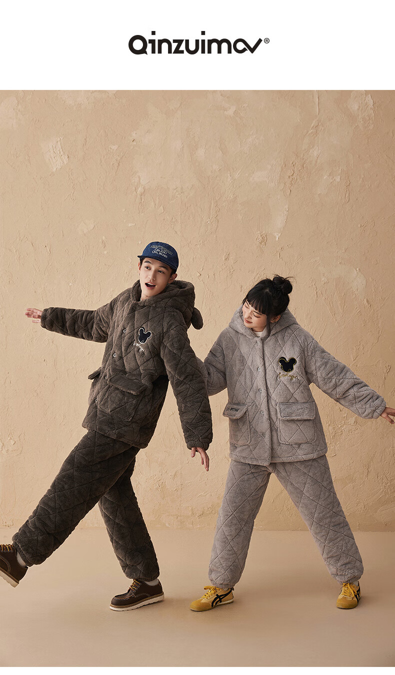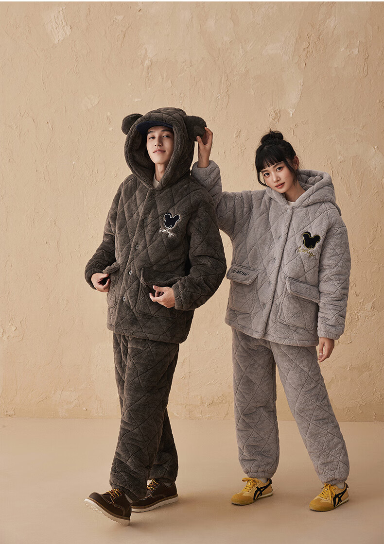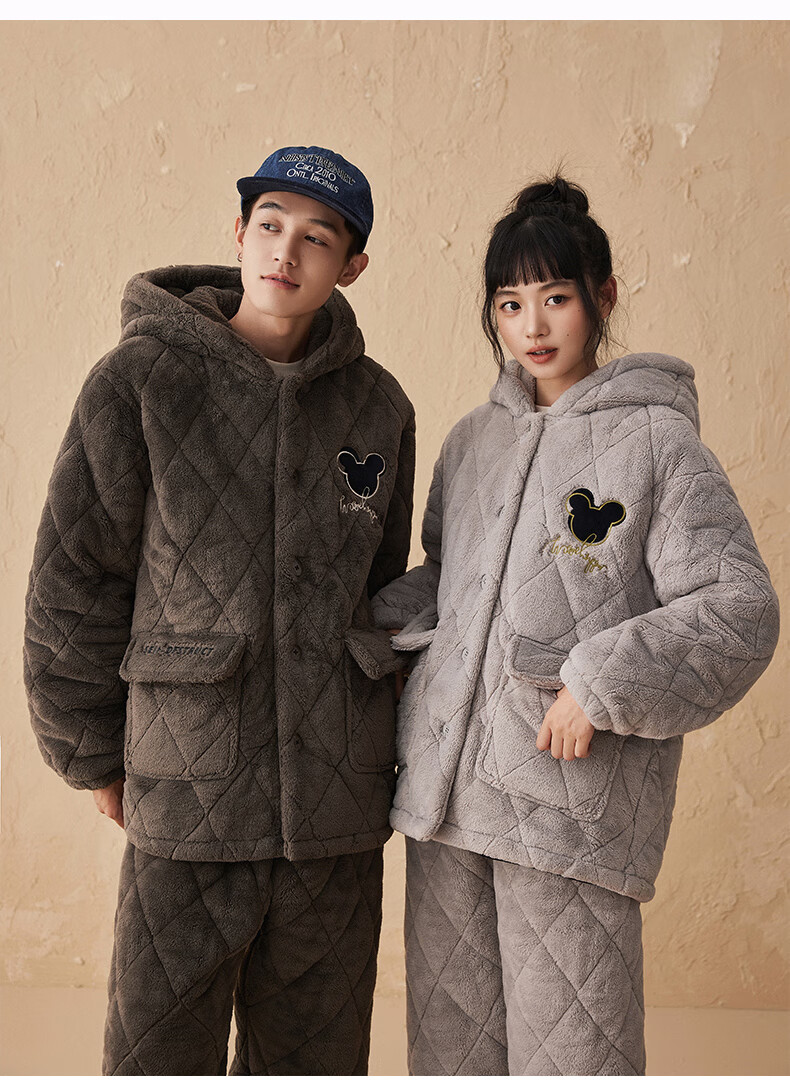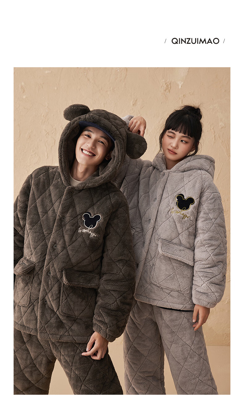 Kiss Cat Hooded Warm Velvet Couple's Quilted Pajamas Women's Winter Three-Layer Thickened Men's Suit Home Clothes Outerwear 164 Tea Brown Men 2XL