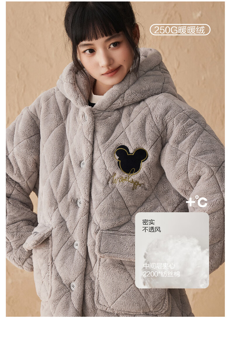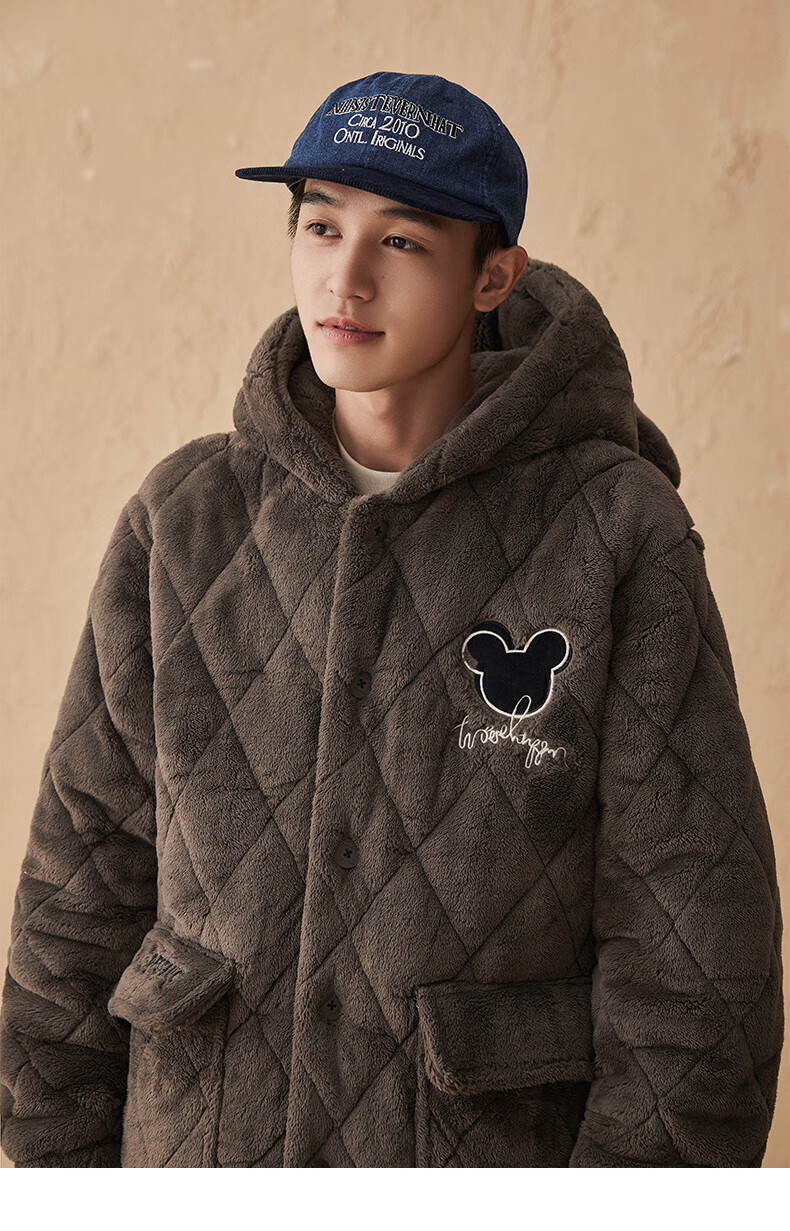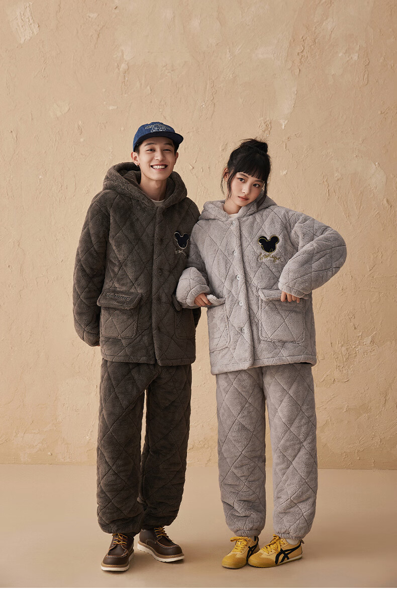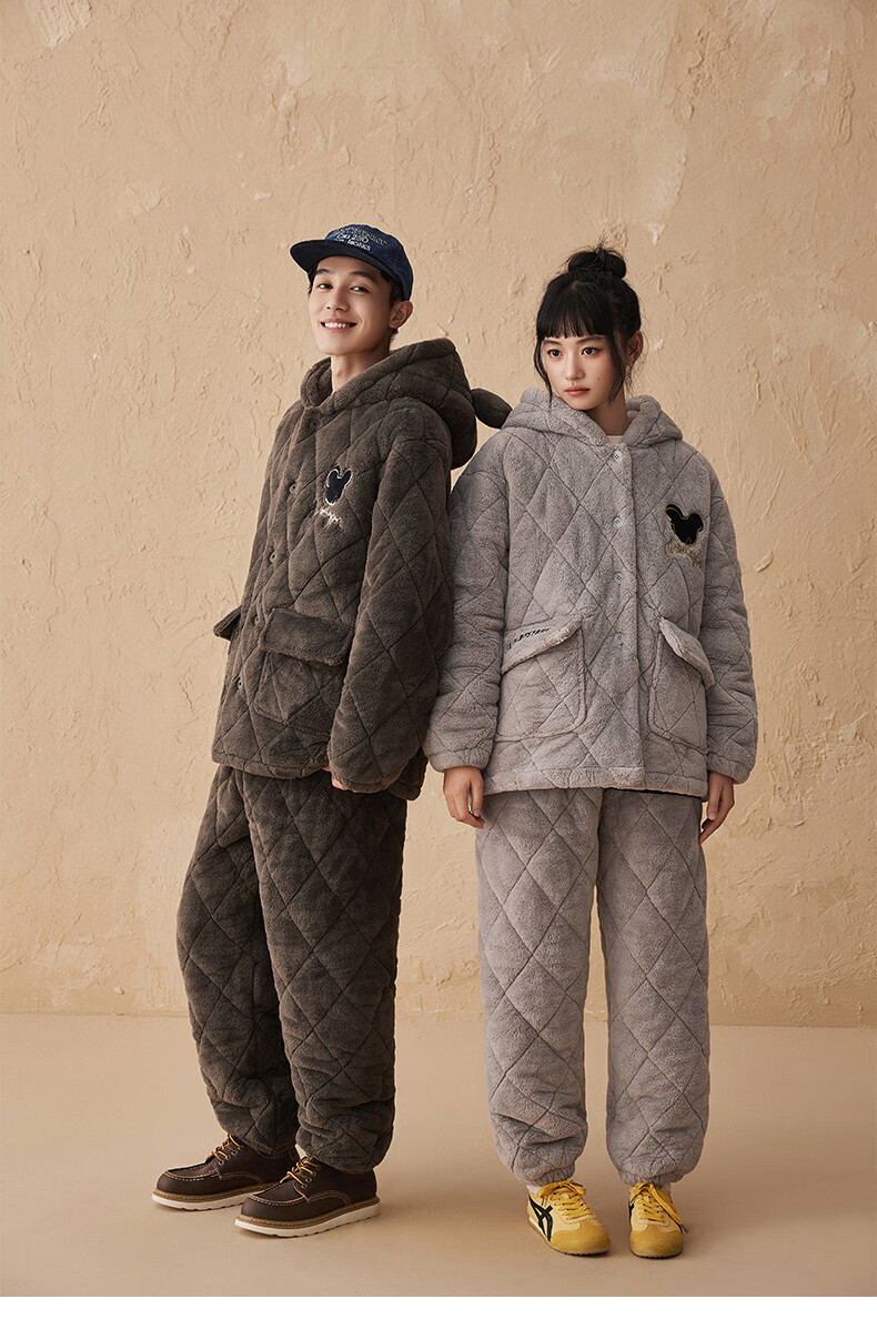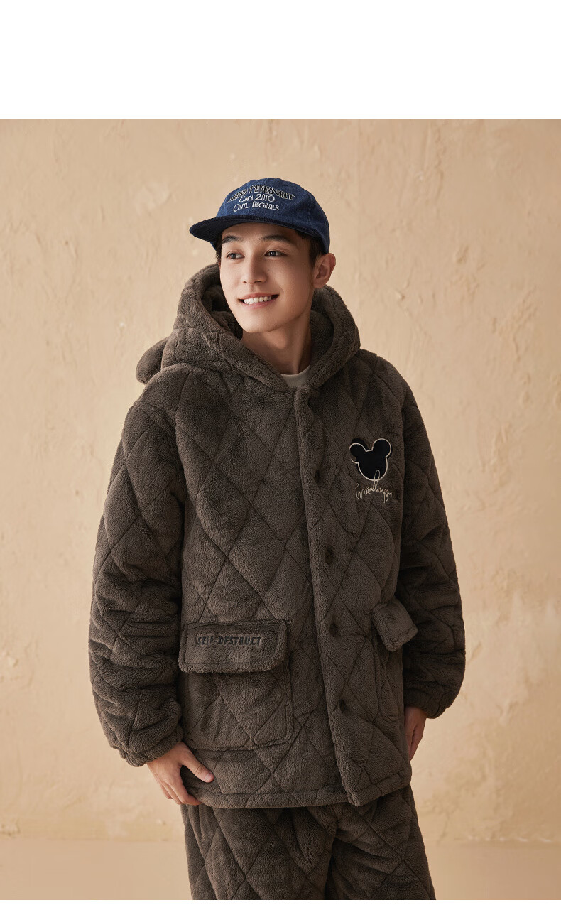 Kiss Cat Hooded Warm Velvet Couple's Quilted Pajamas Women's Winter Three-Layer Thickened Men's Suit Home Clothes Outerwear 164 Tea Brown Men 2XL