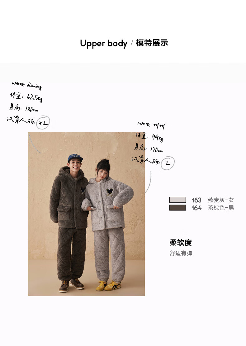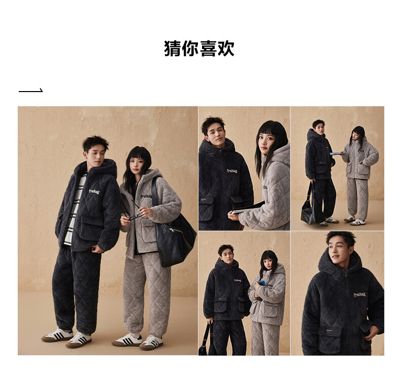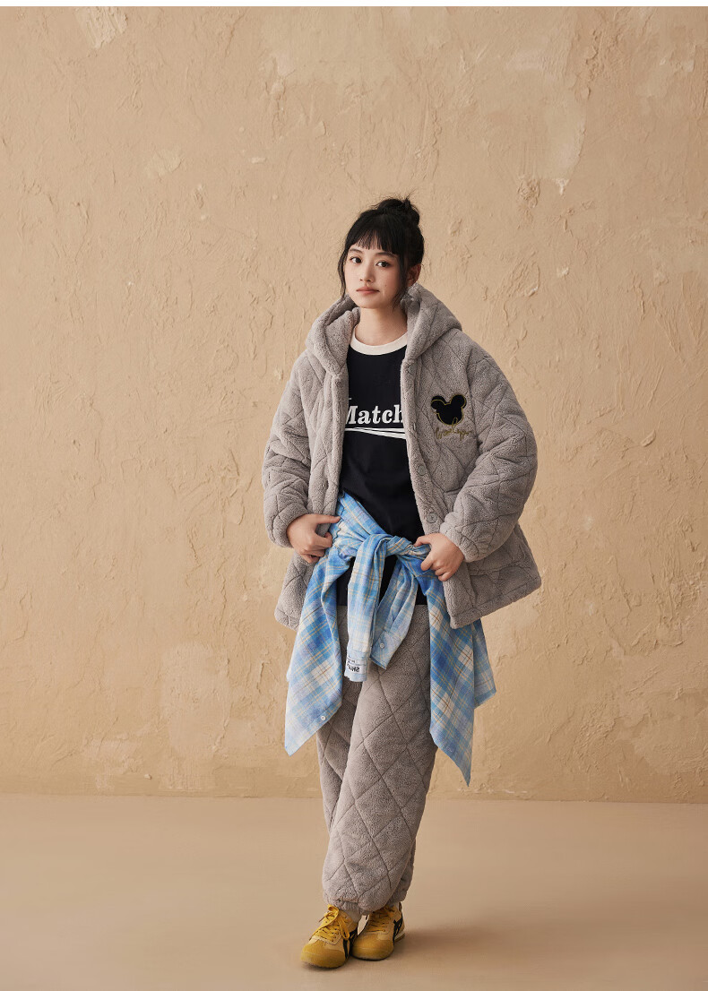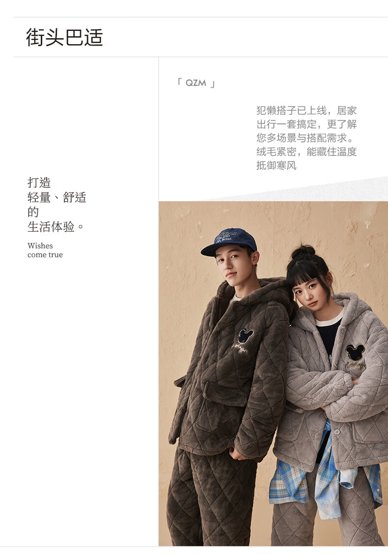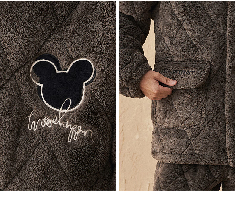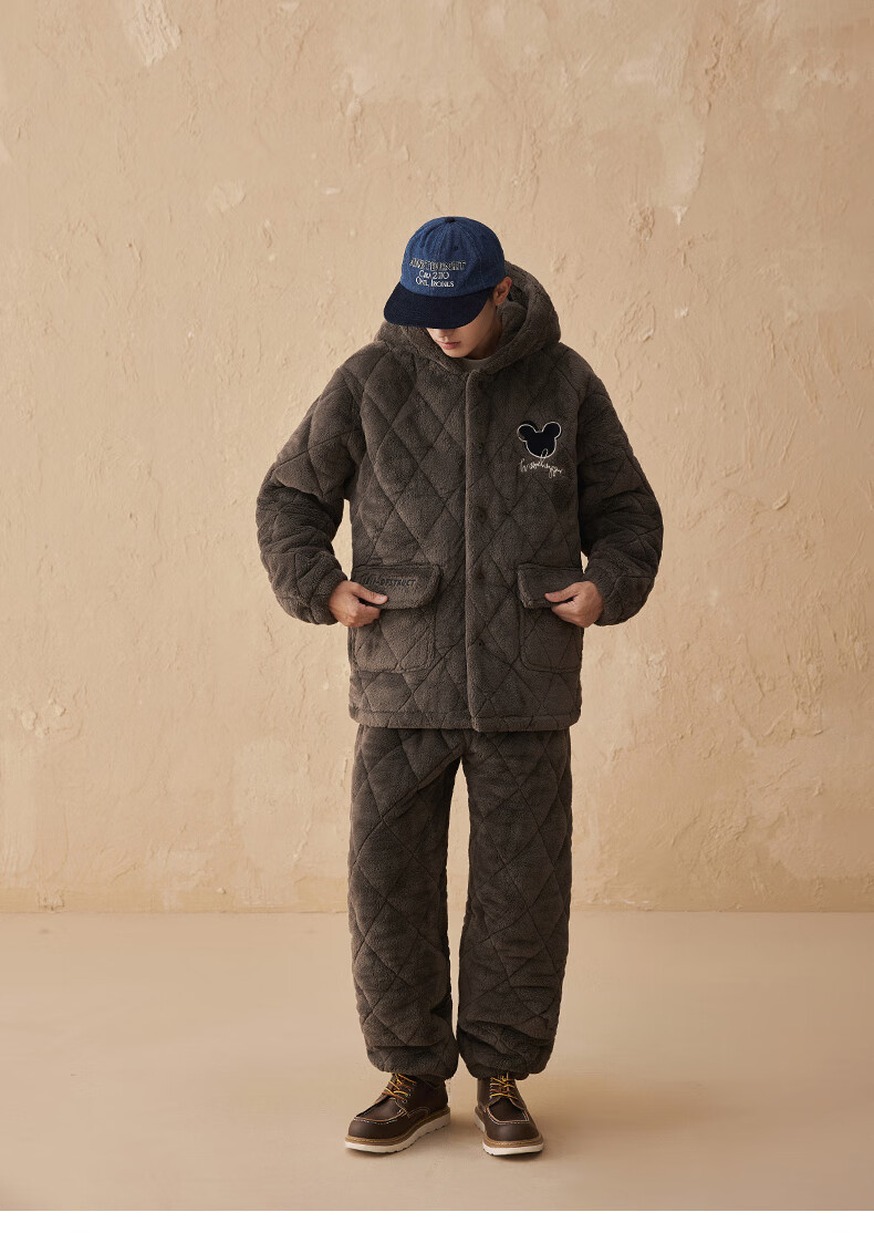 Kiss Cat Hooded Warm Velvet Couple's Quilted Pajamas Women's Winter Three-Layer Thickened Men's Suit Home Clothes Outerwear 164 Tea Brown Men 2XL