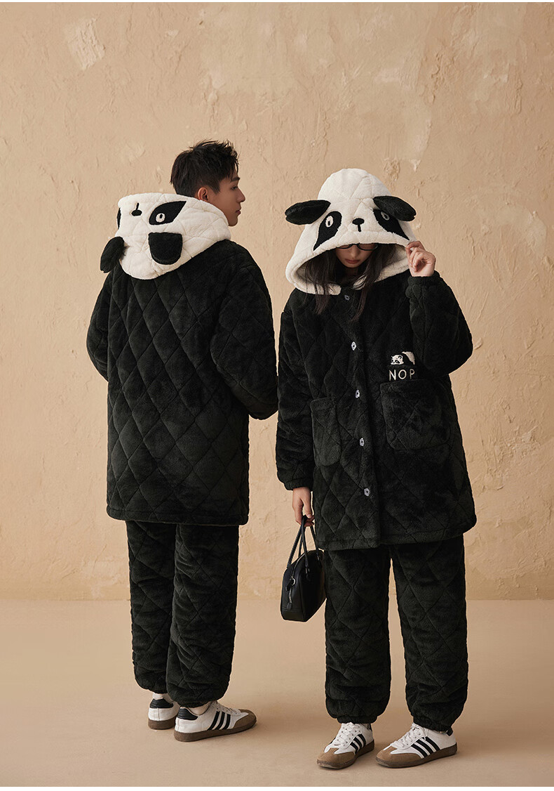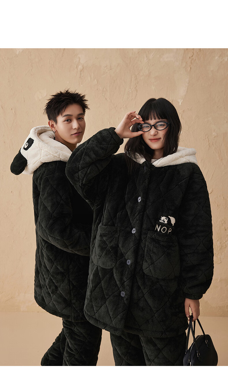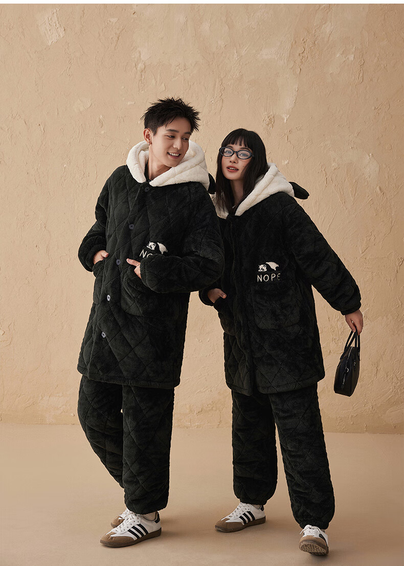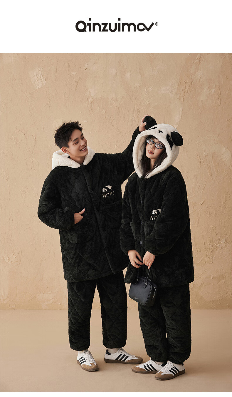 Kissing cat cartoon hooded warm velvet couple quilted pajamas for women winter three-layer thickened men's suit home clothes 188 jet black male L