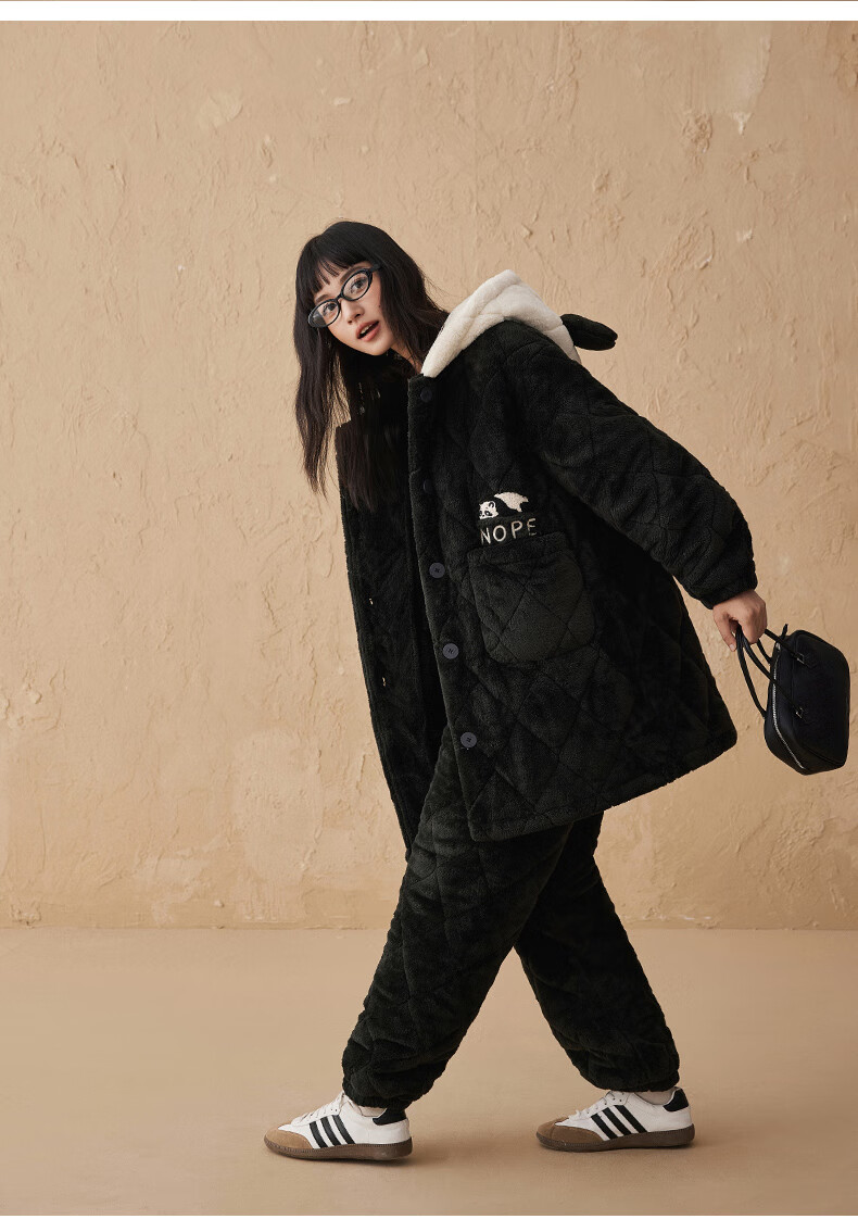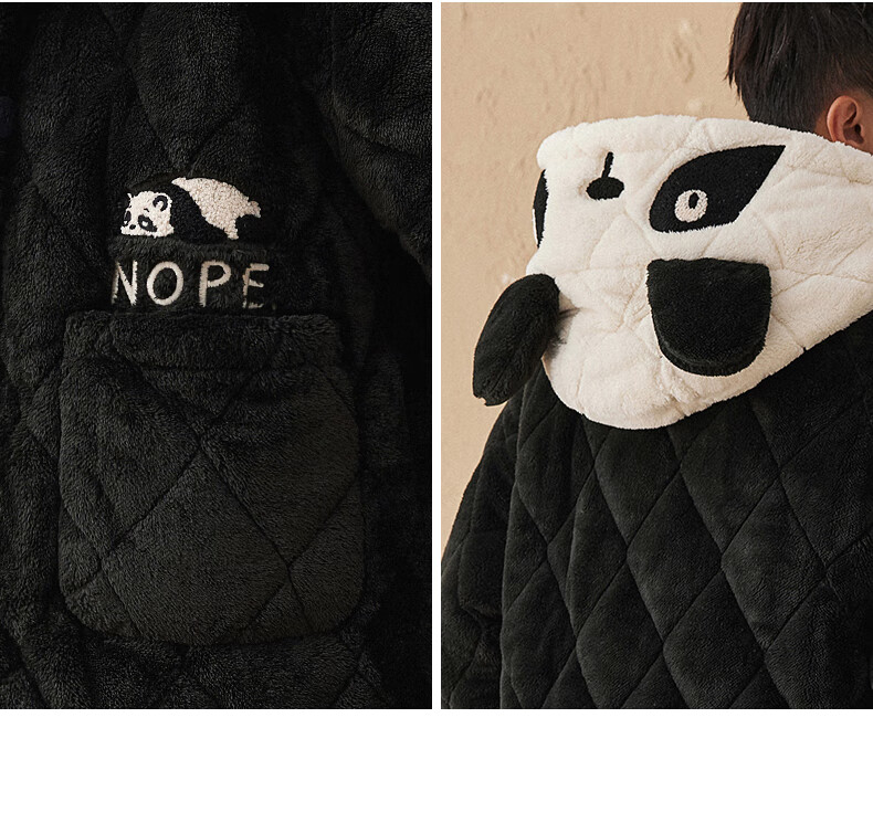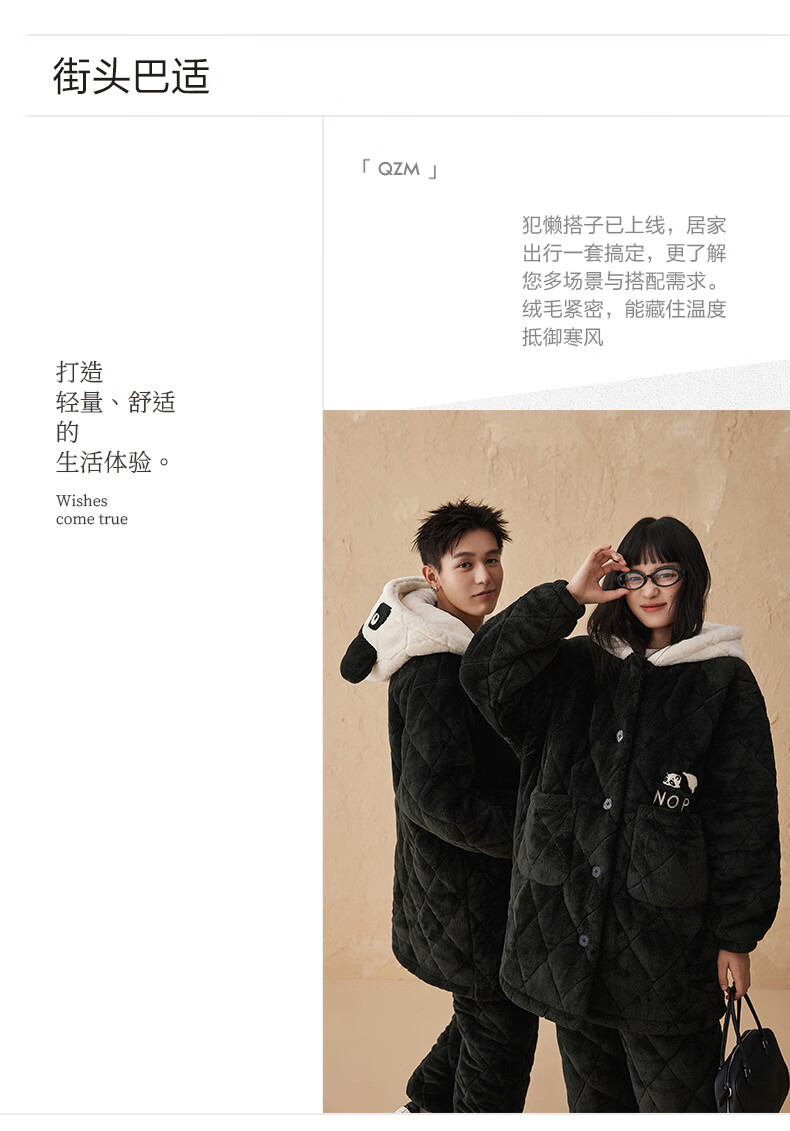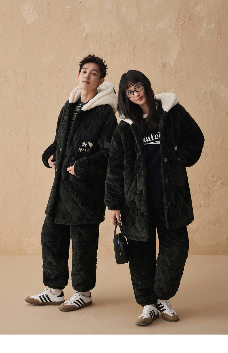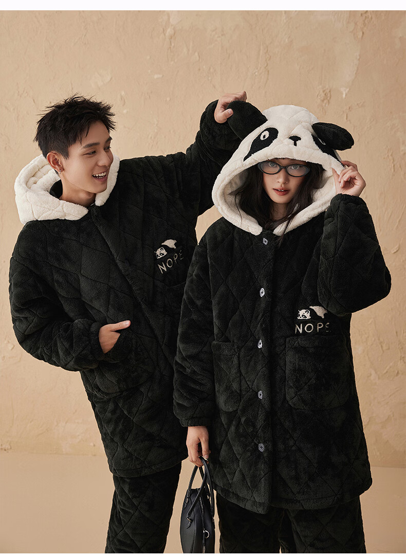 Kissing cat cartoon hooded warm velvet couple quilted pajamas for women winter three-layer thickened men's suit home clothes 188 jet black male L