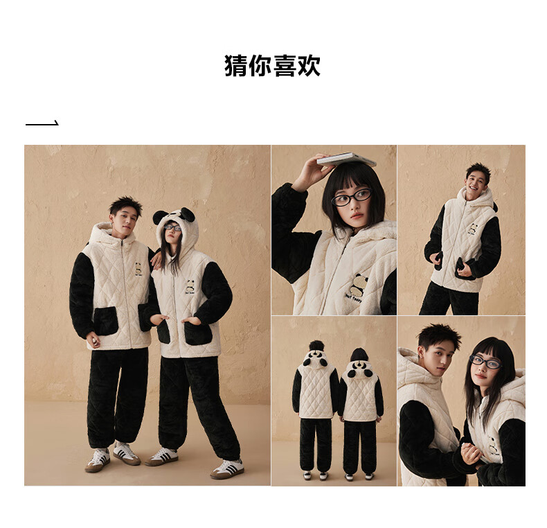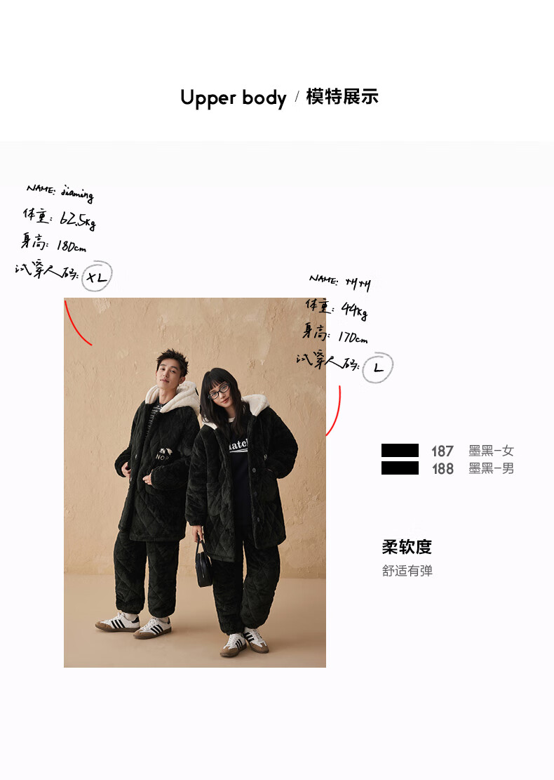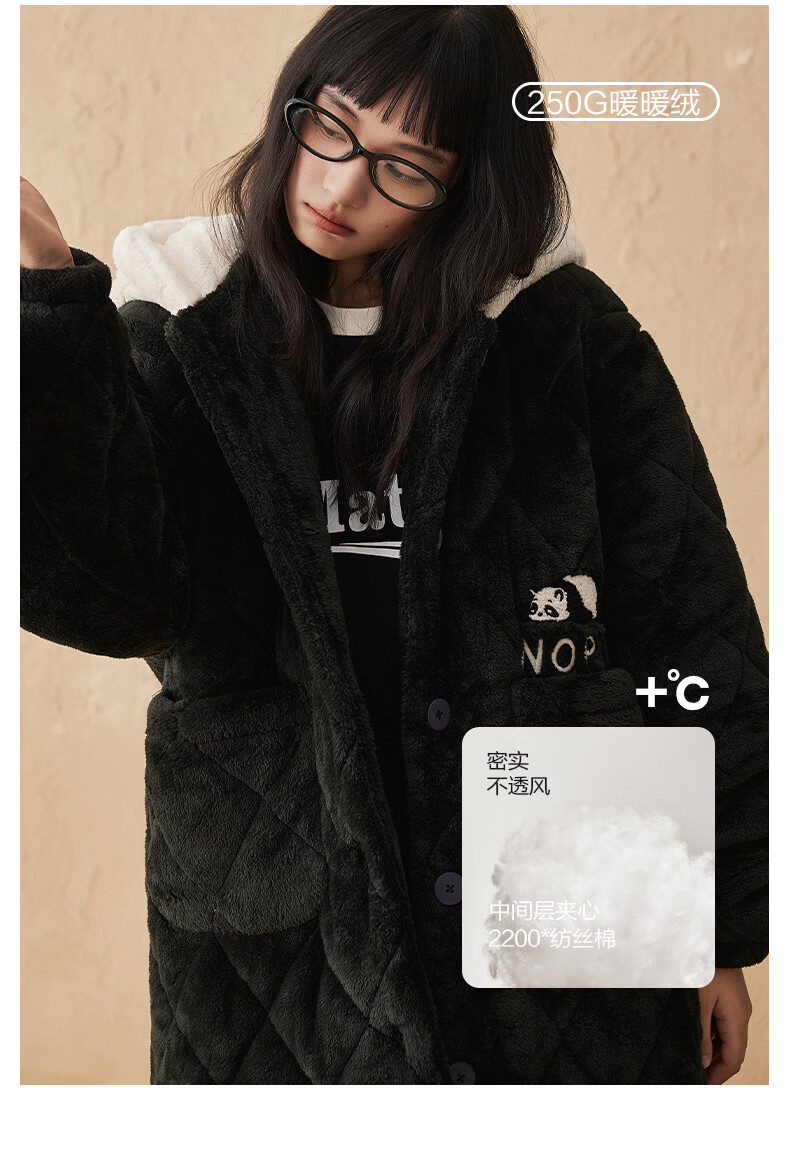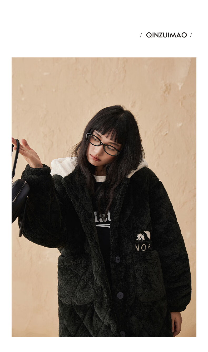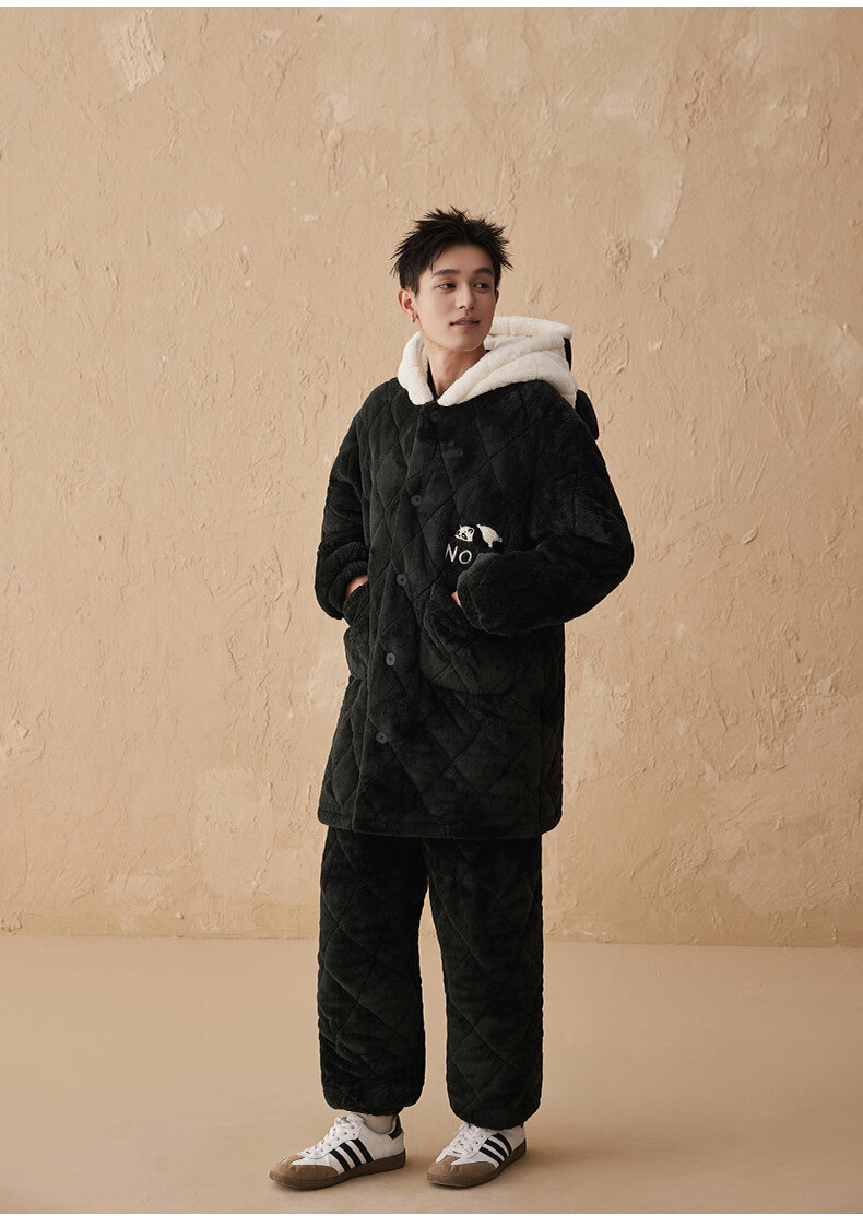 Kissing cat cartoon hooded warm velvet couple quilted pajamas for women winter three-layer thickened men's suit home clothes 188 jet black male L