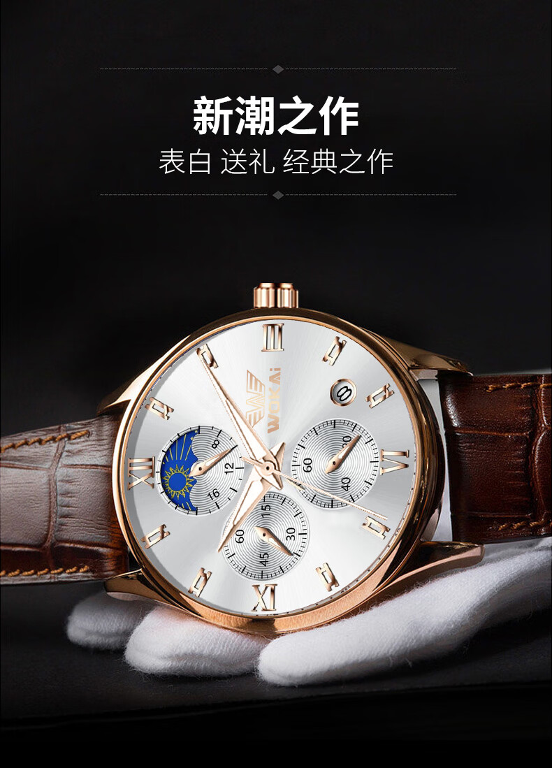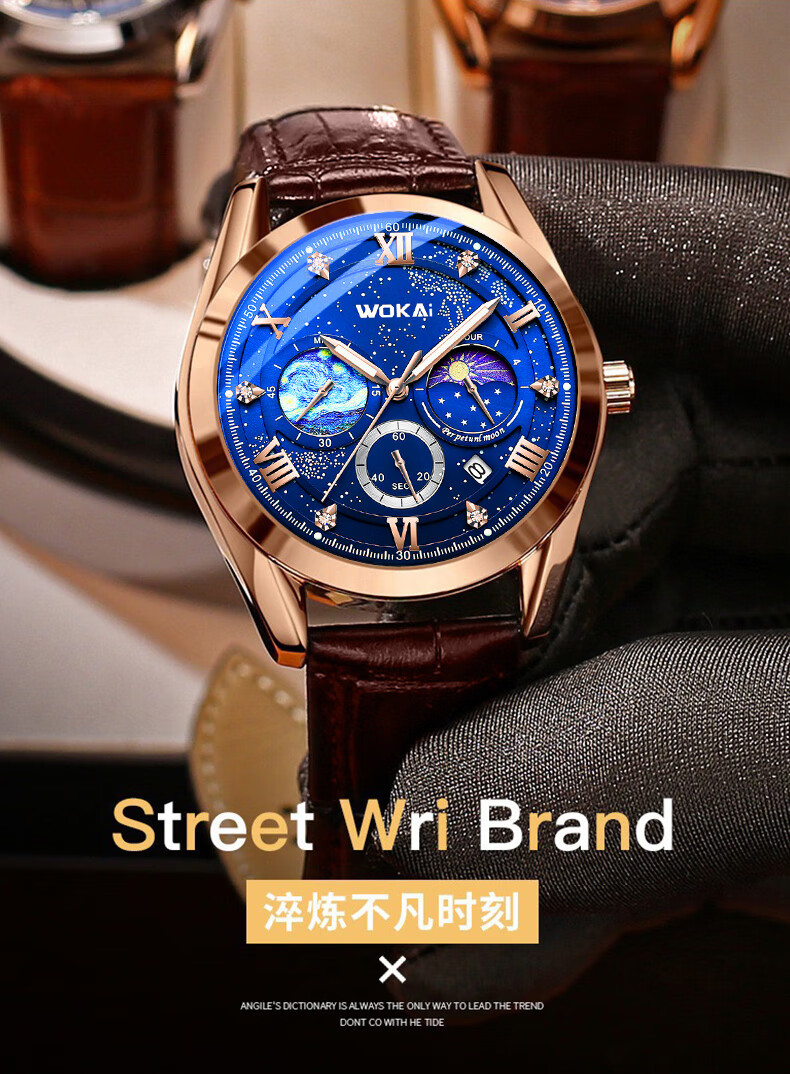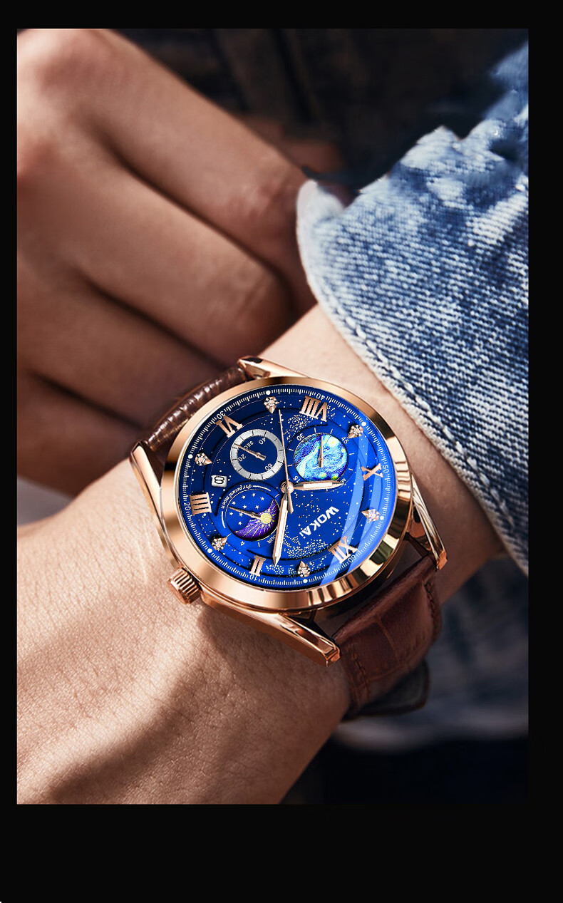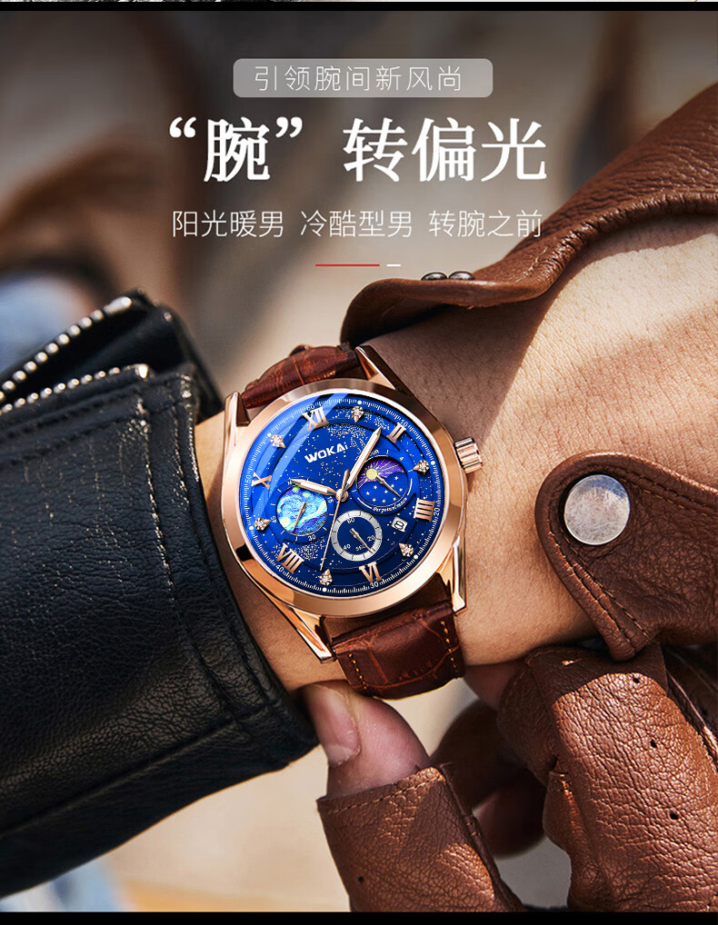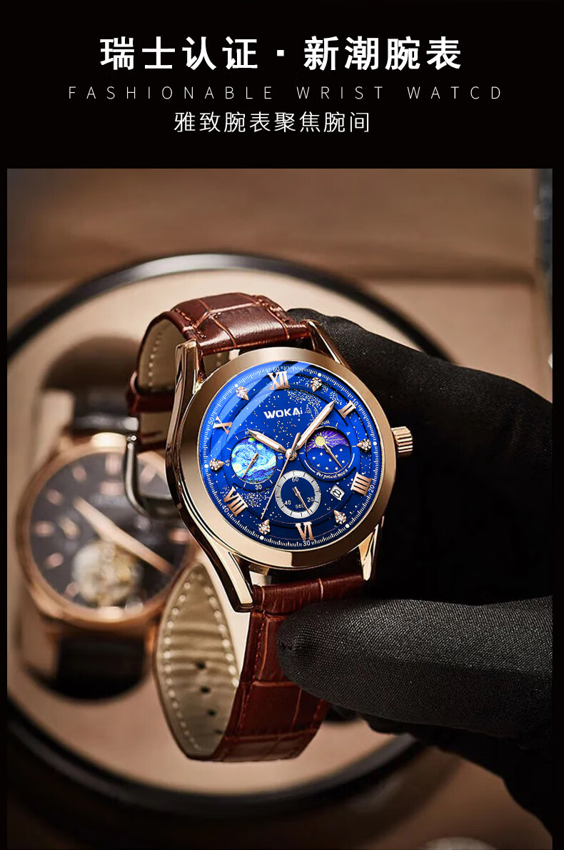 Wokai fully automatic movement mechanical men's watch high-end calendar quartz watch men's trendy fashion watch men's watch fashionable blue face