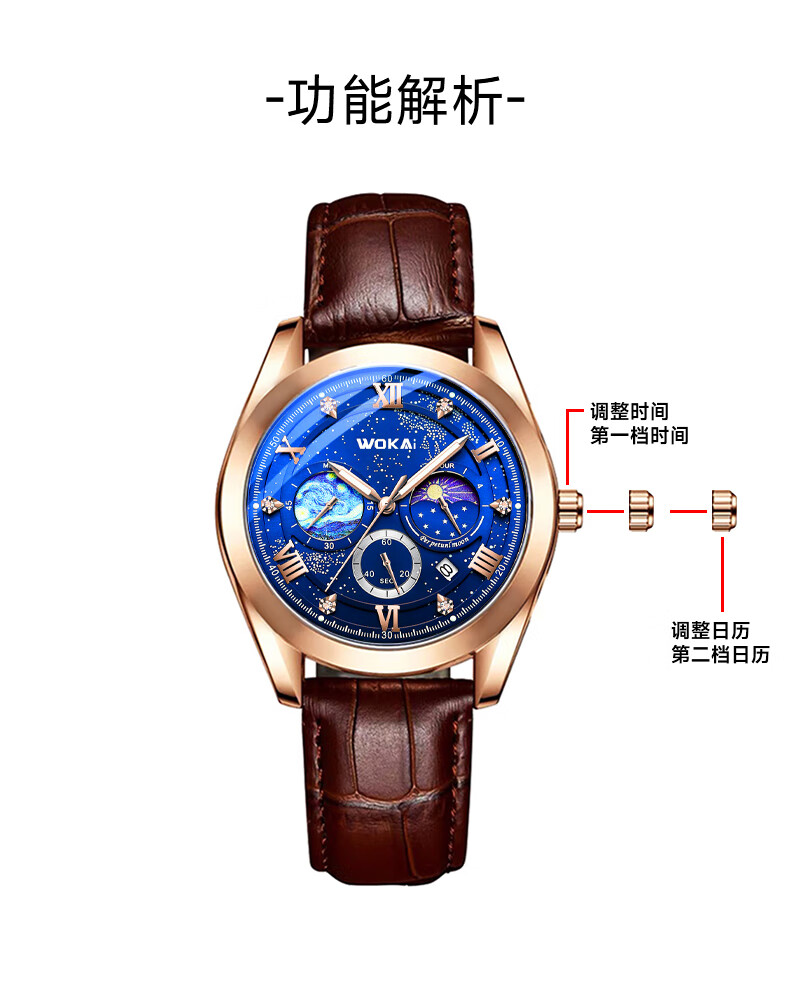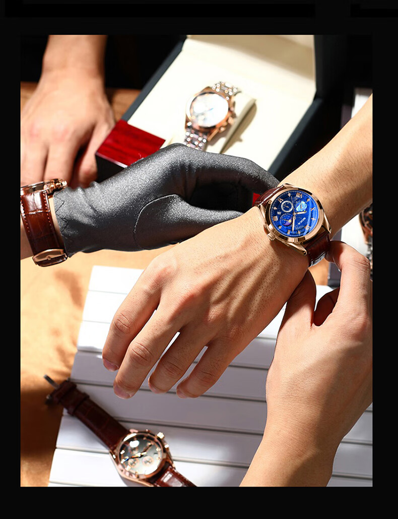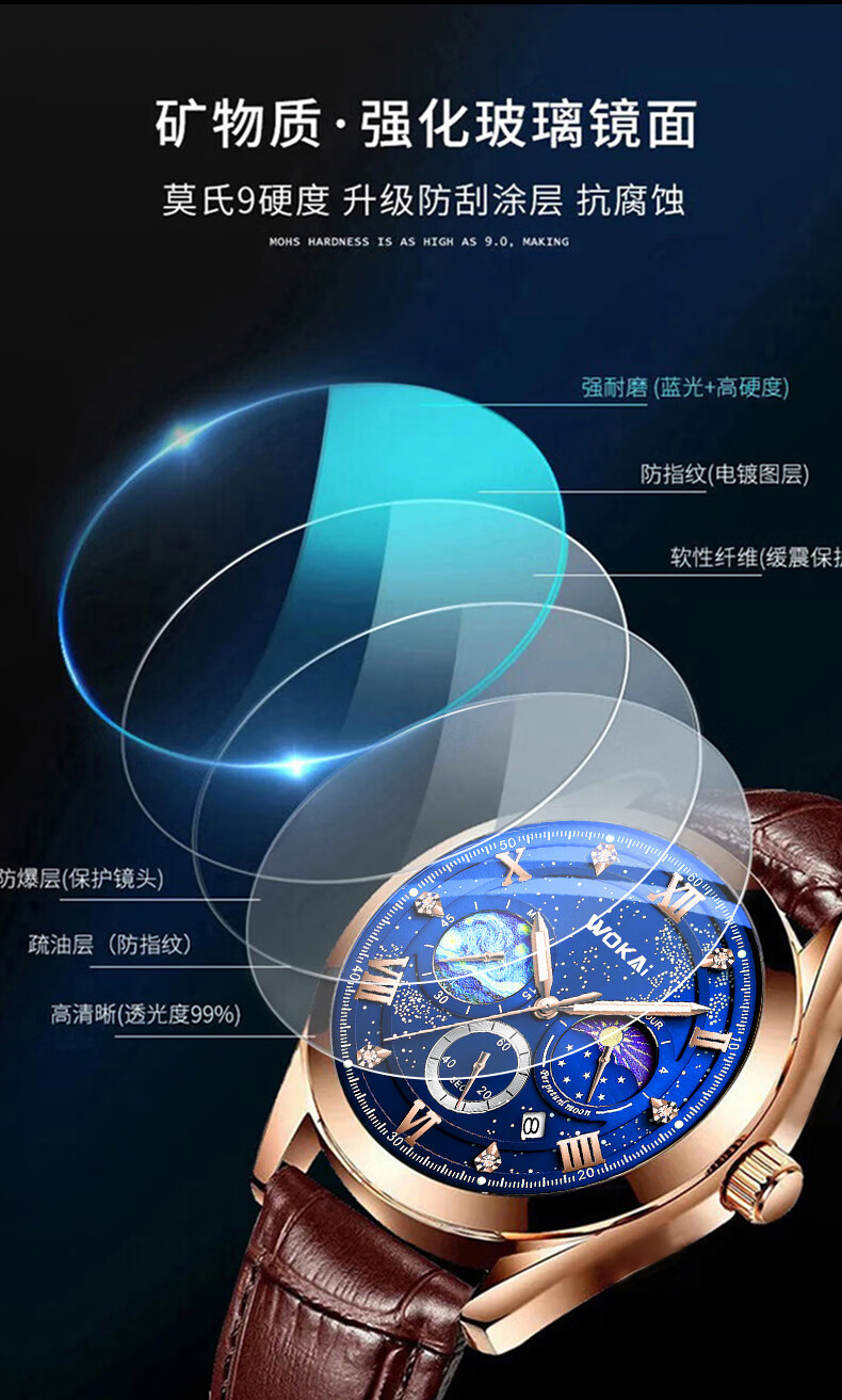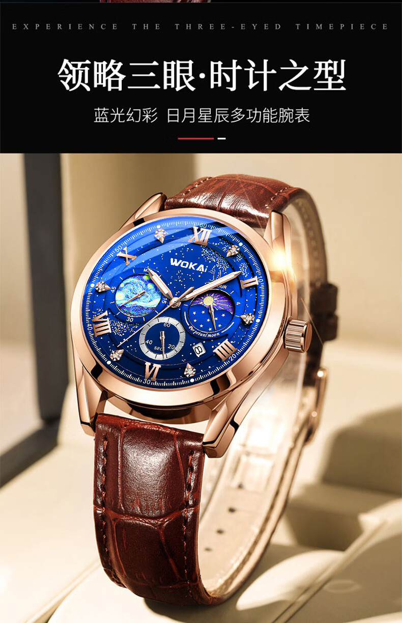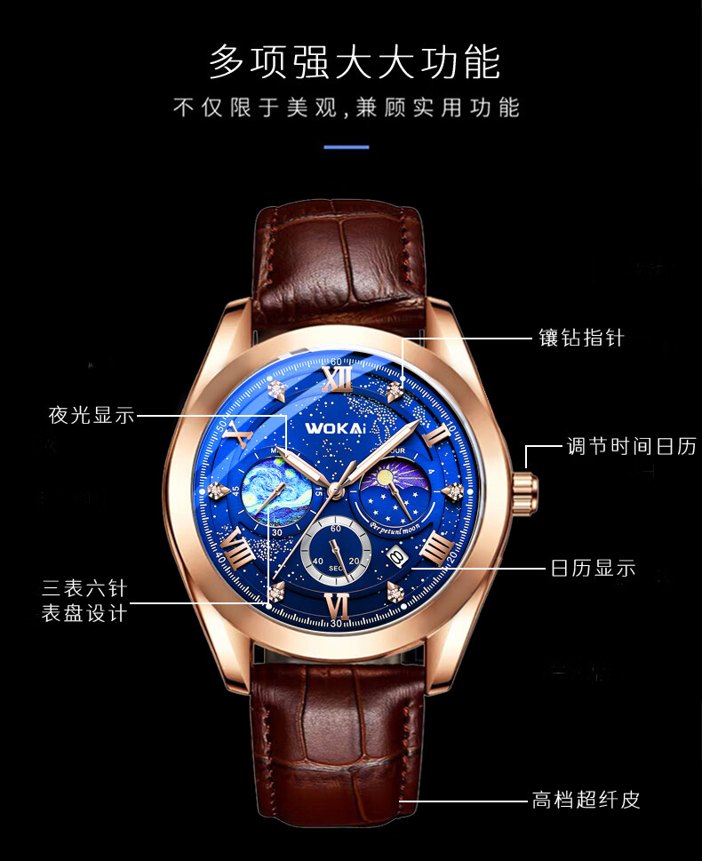 Wokai fully automatic movement mechanical men's watch high-end calendar quartz watch men's trendy fashion watch men's watch fashionable blue face