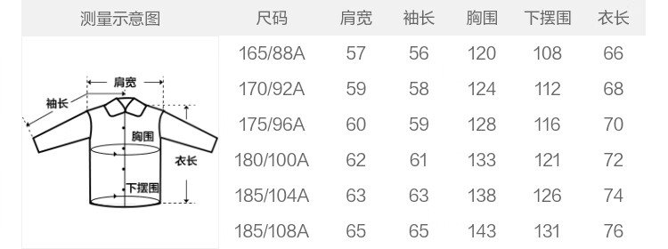 China (cm) 165 / 88-90 170 / 96-98 175 / 108-110 180 / 118-122 185 / 126-130