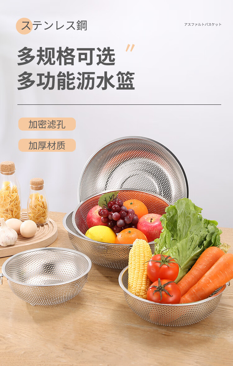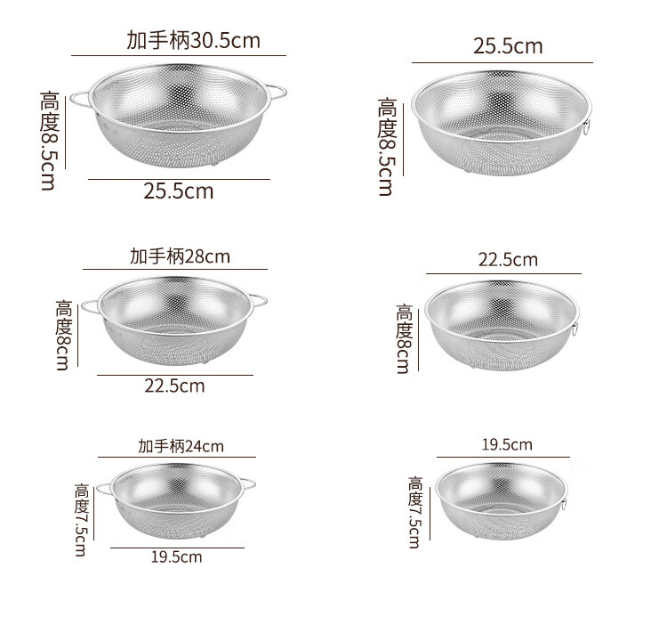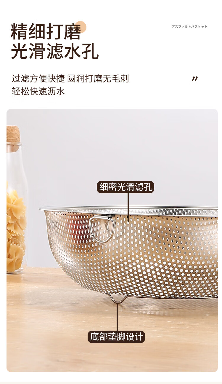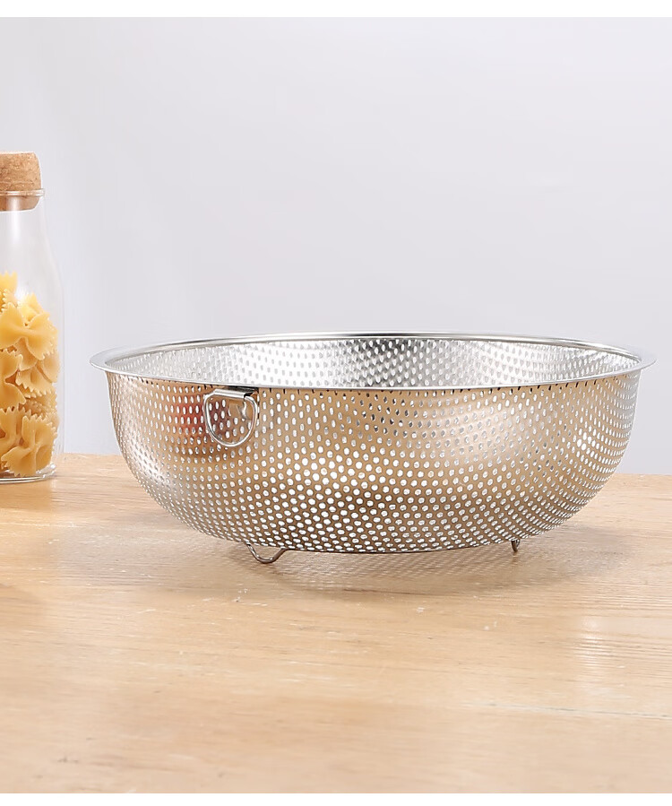 Fanxiang 304 stainless steel drain basket, vegetable basin, leaky basin, household kitchen rice basin, rice sieve, vegetable basket, fruit basket (double-ear model), dense hole washable rice, with three-legged base, 25.5 pack of two